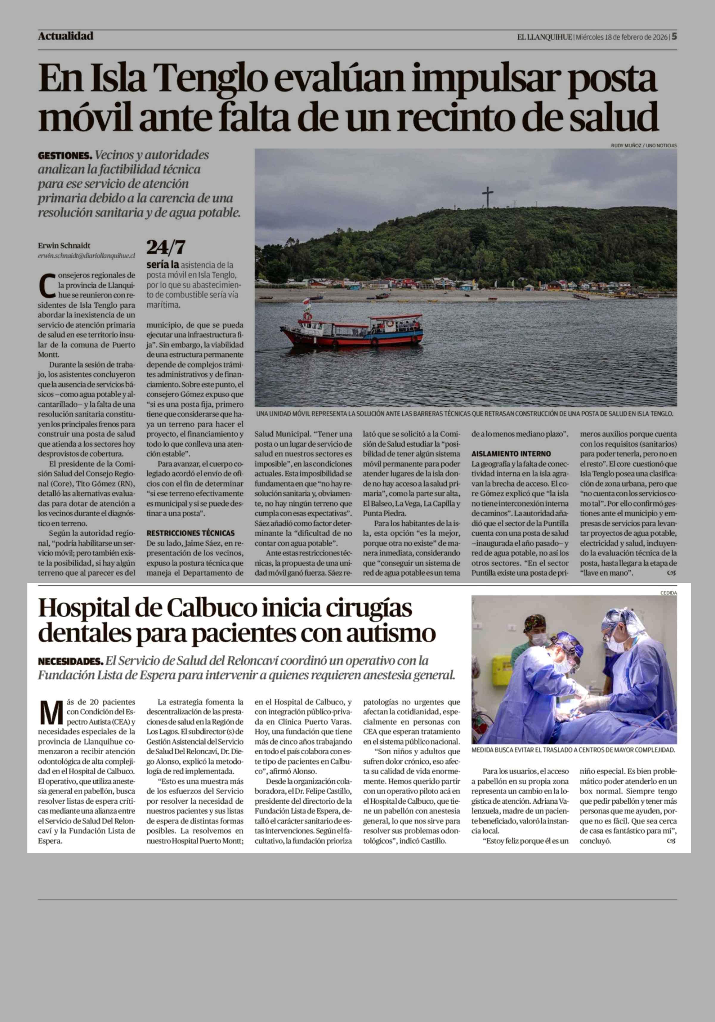 Hospital de Calbuco inicia cirugías dentales para pacientes con autismo 18-02-2026 El Llanquihue |