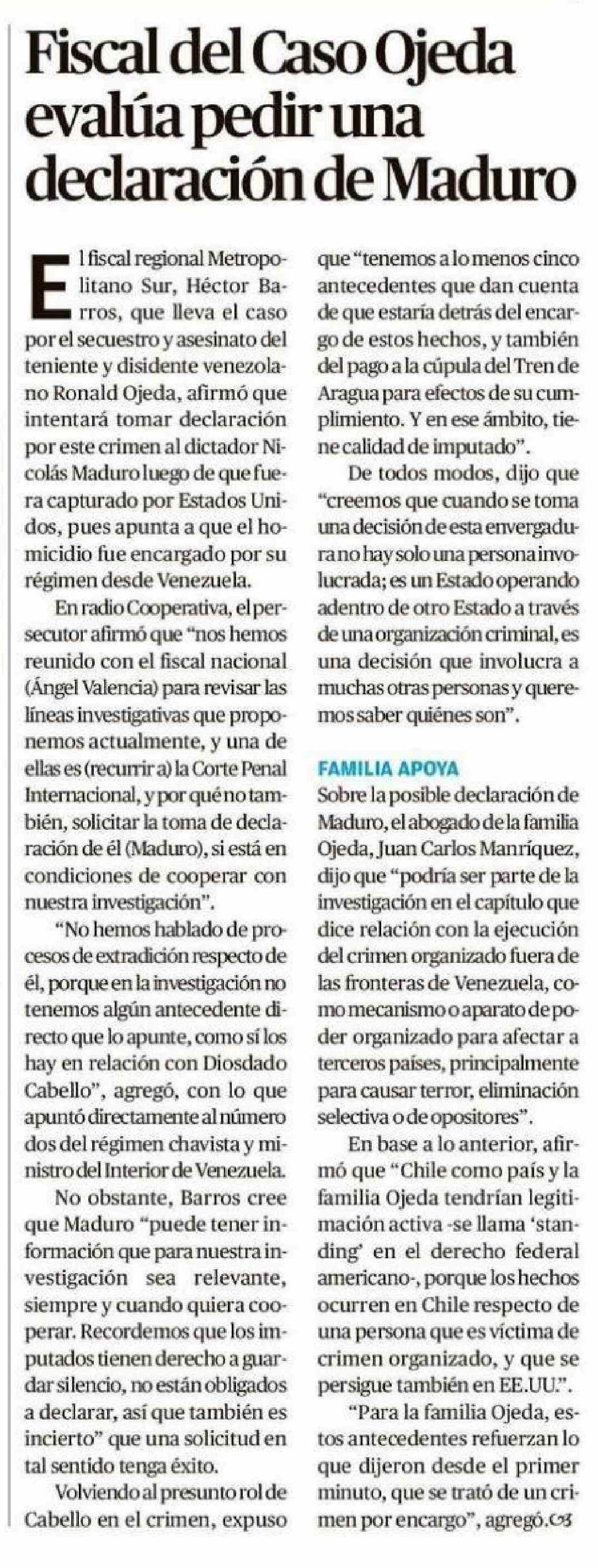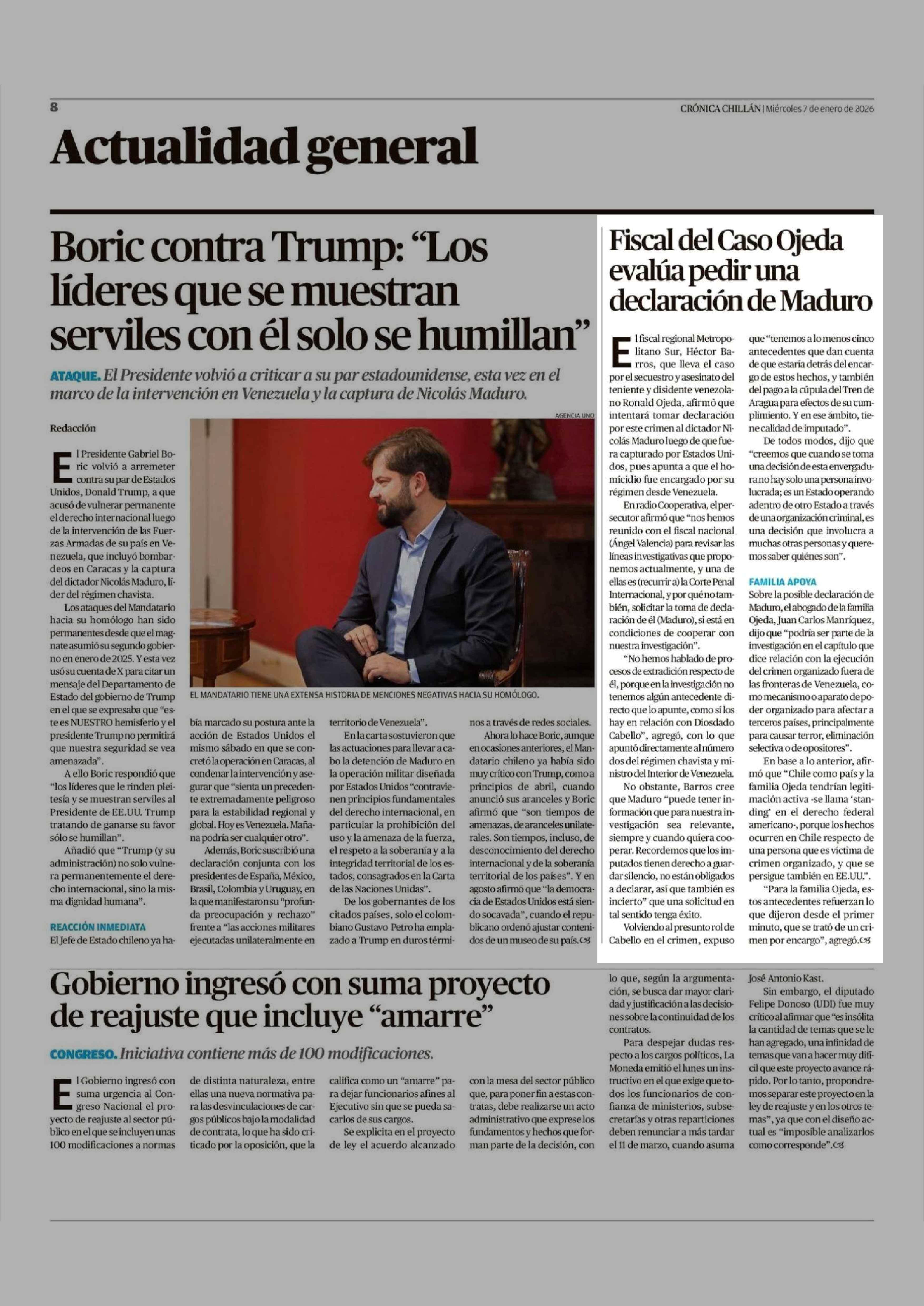 Fiscal del Caso Ojeda evalúa pedir una declaración de Maduro 07-01-2026 Crónica de Chillán |