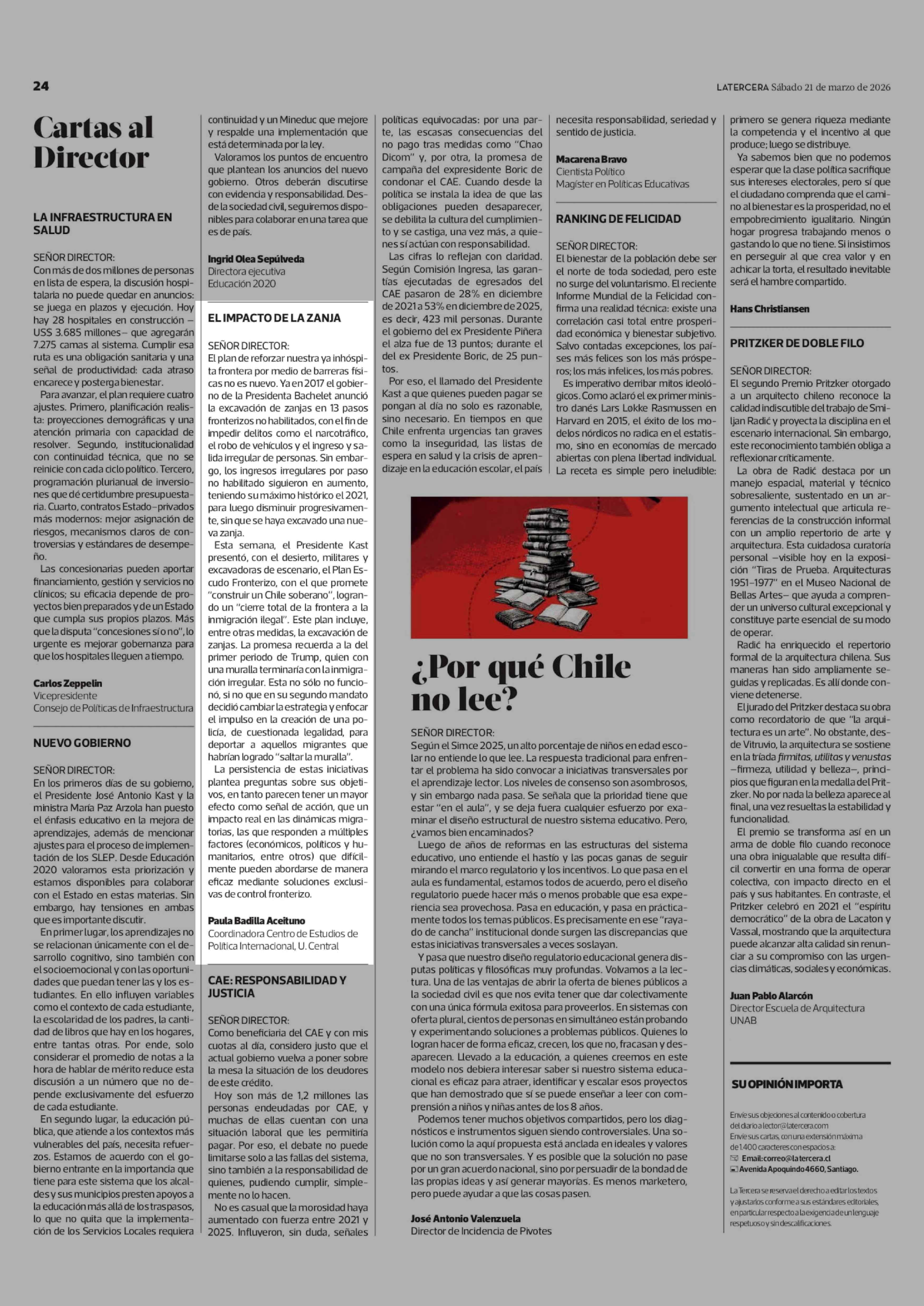 Cartas: EL IMPACTO DE LA ZANJA 21-03-2026 La Tercera |