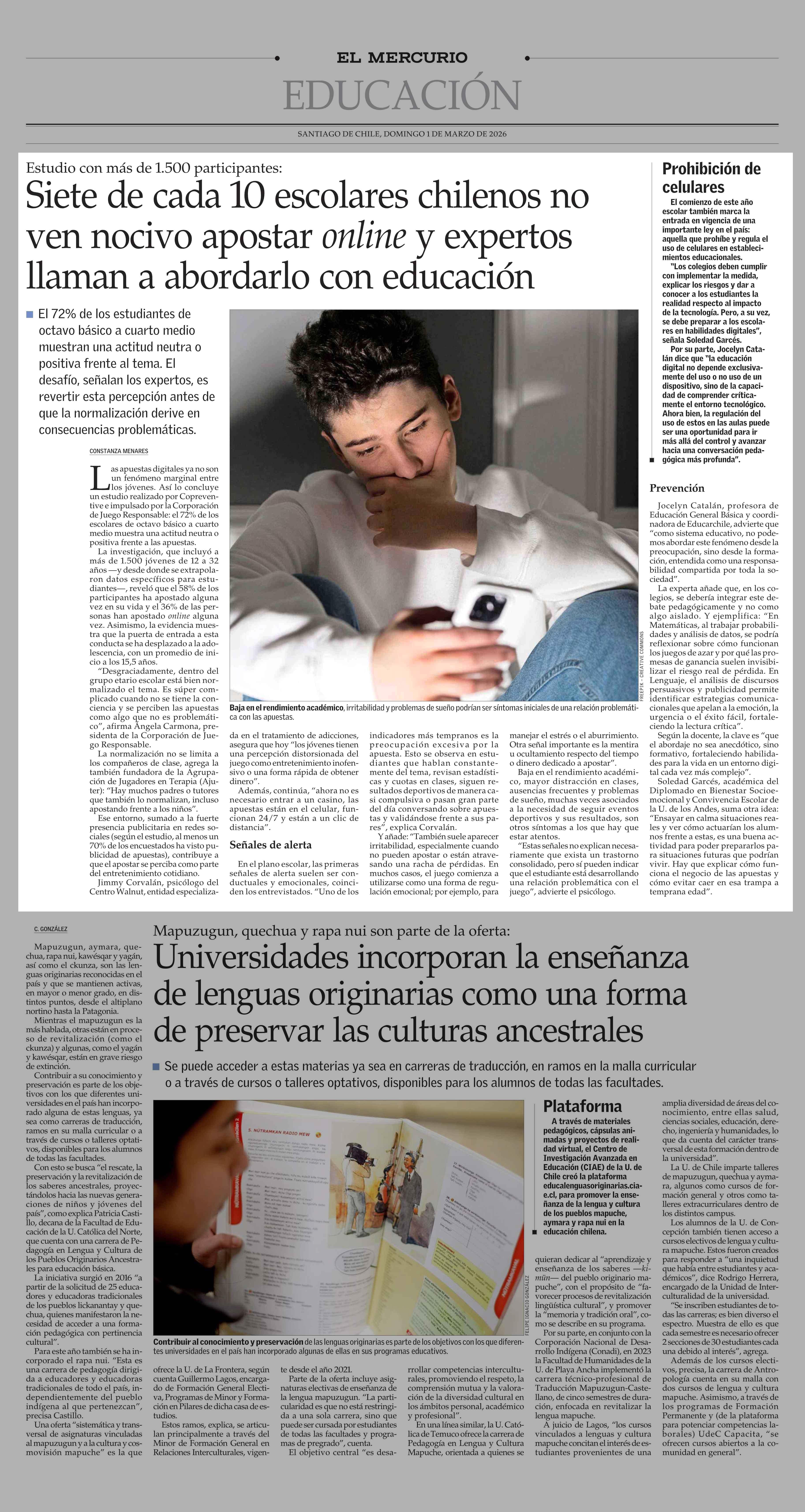 Siete de cada 10 escolares chilenos no ven nocivo apostar online y expertos llaman a abordarlo con educación 01-03-2026 El Mercurio |