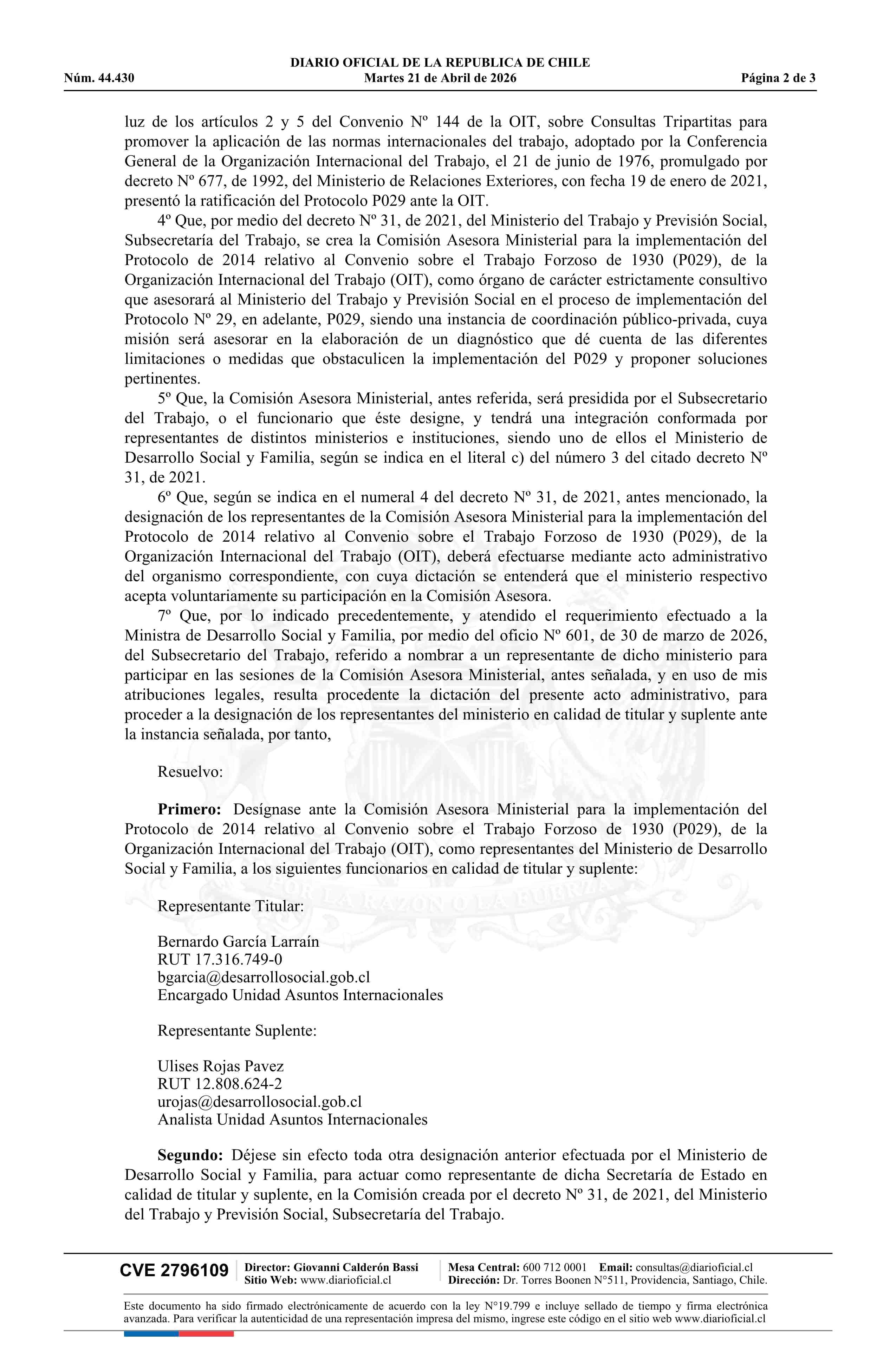 Título: Resolución exenta número 59, de 2026.- Designa representante titular y suplente ante la Comisión Asesora Ministerial para la implementación del Protocolo de 2014 relativo al Convenio sobre el Trabajo Forzoso de 1930 (P029), de la Organización Internacional del Trabajo