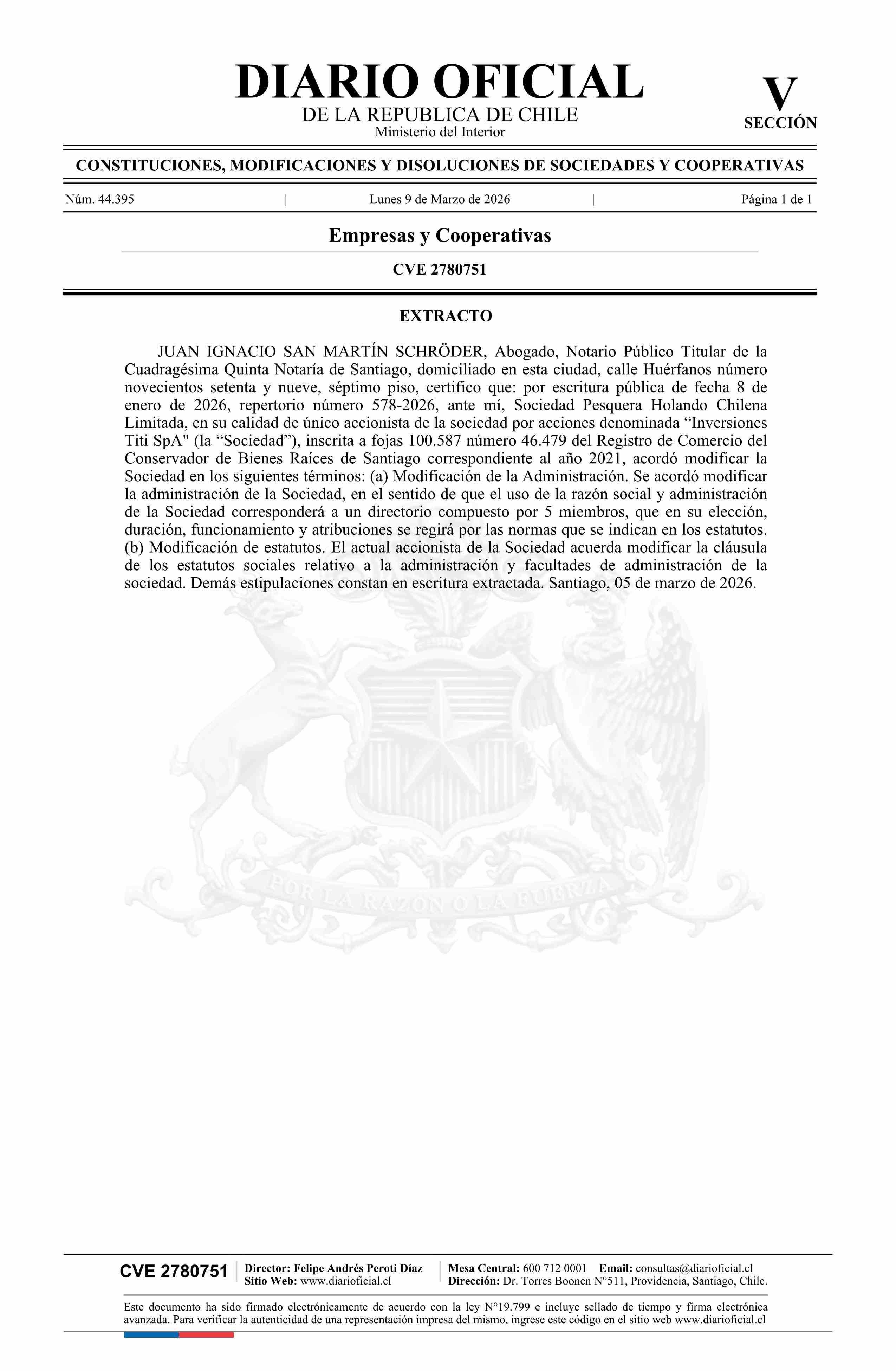 Inversiones Titi SpA 77.513.733-9 09-03-2026 Diario Oficial Edición Electrónica |