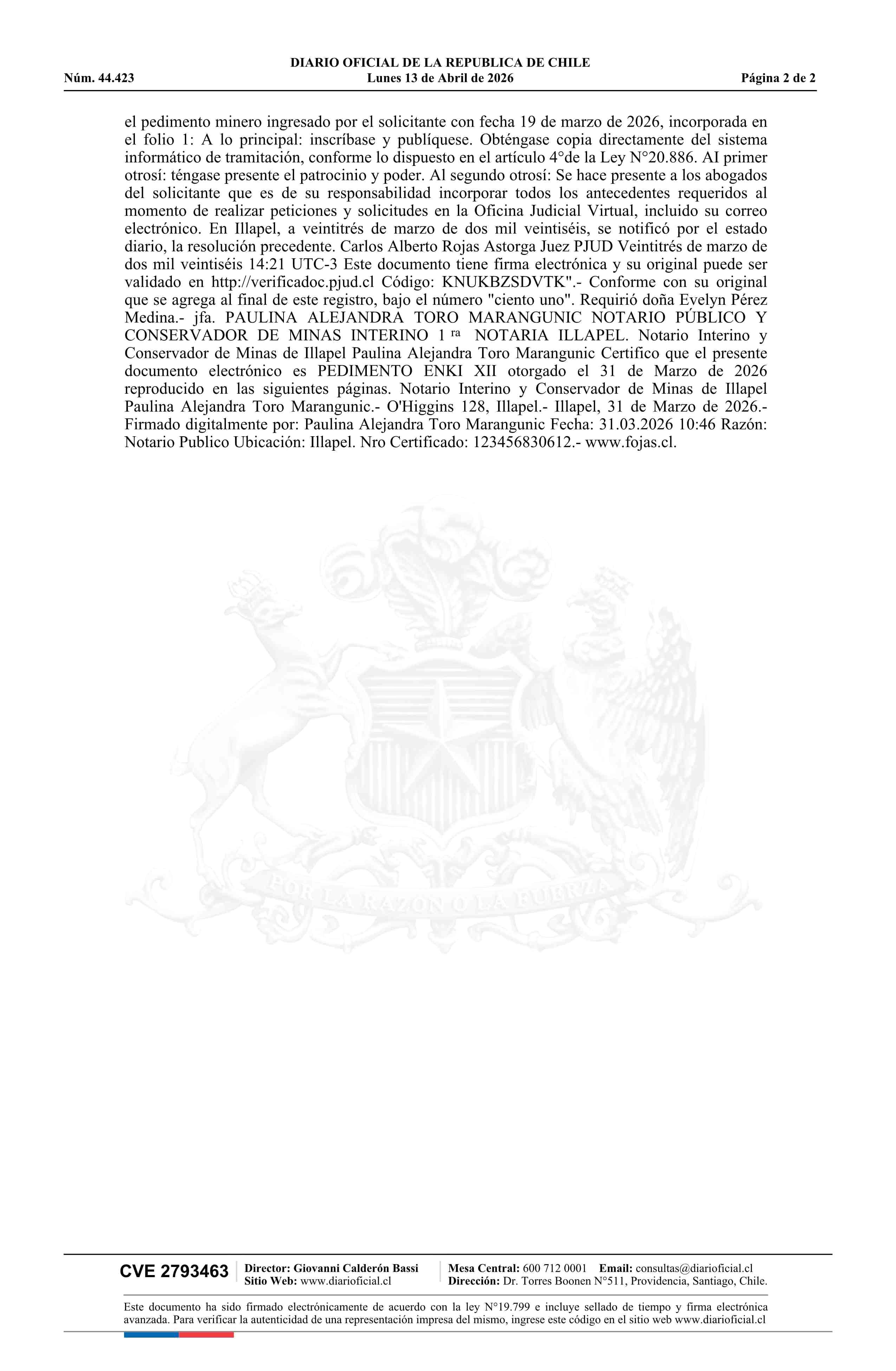 ENKI XII / Prohens Poblete Óscar Ignacio 13-04-2026 DIARIO OFICIAL CHILE - BOLETÍN OFICIAL DE MINERÍA |