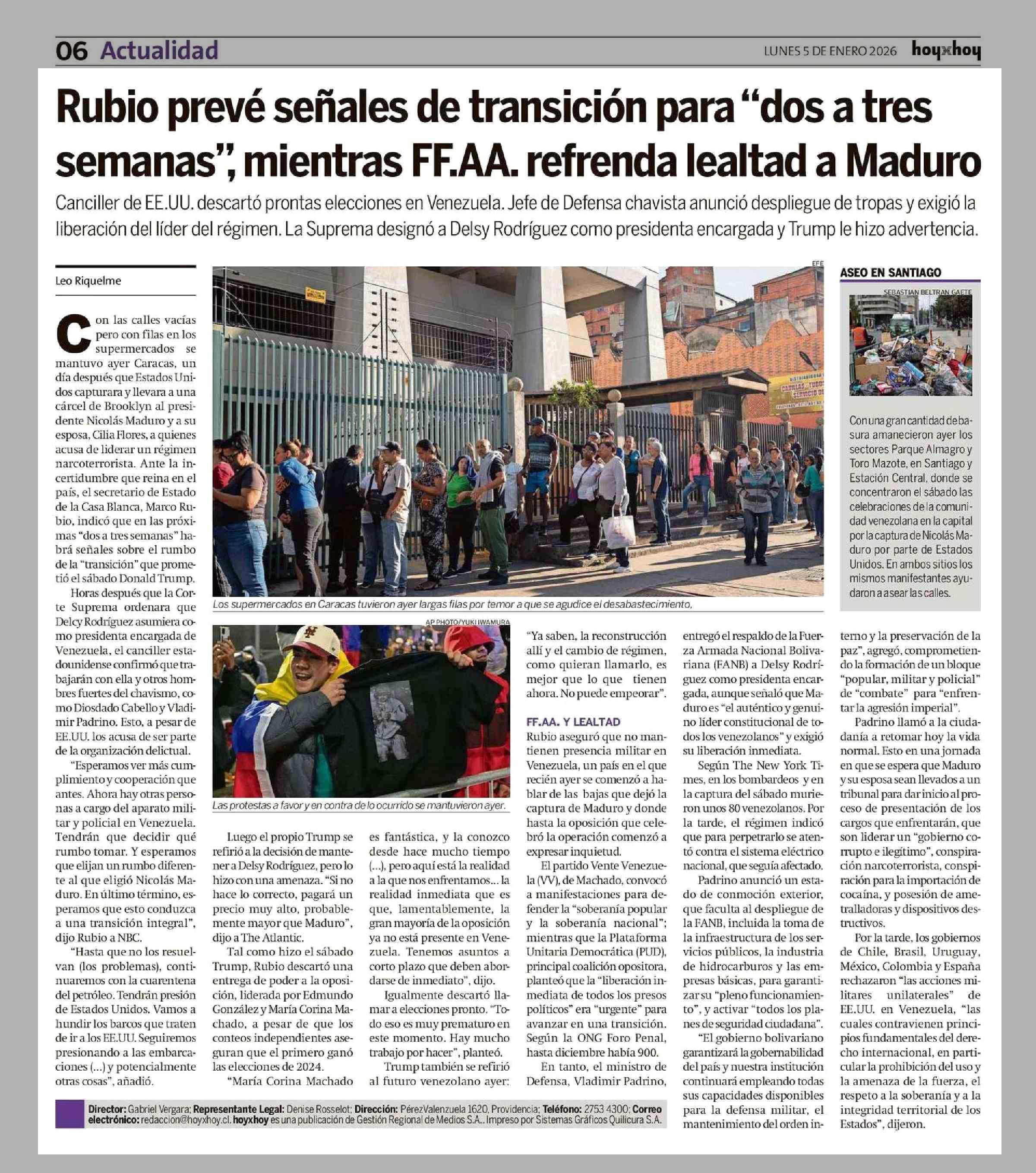 Rubio prevé señales de transición para "dos a tres semanas", mientras FF.AA. refrenda lealtad a Maduro 05-01-2026 Hoy x Hoy Concepción |