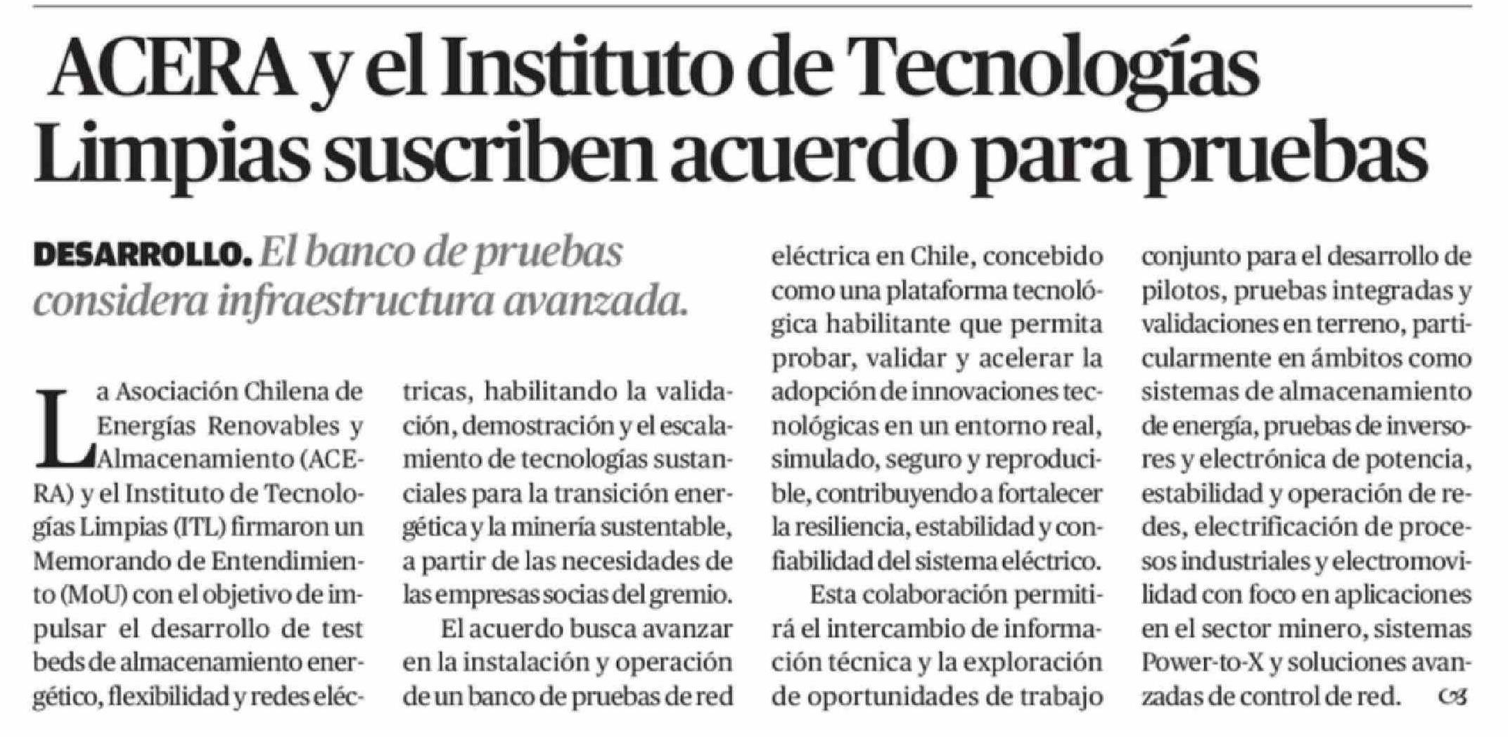 ACERA y el Instituto de Tecnologías Limpias suscriben acuerdo para pruebas 09-02-2026 El Mercurio de Antofagasta |