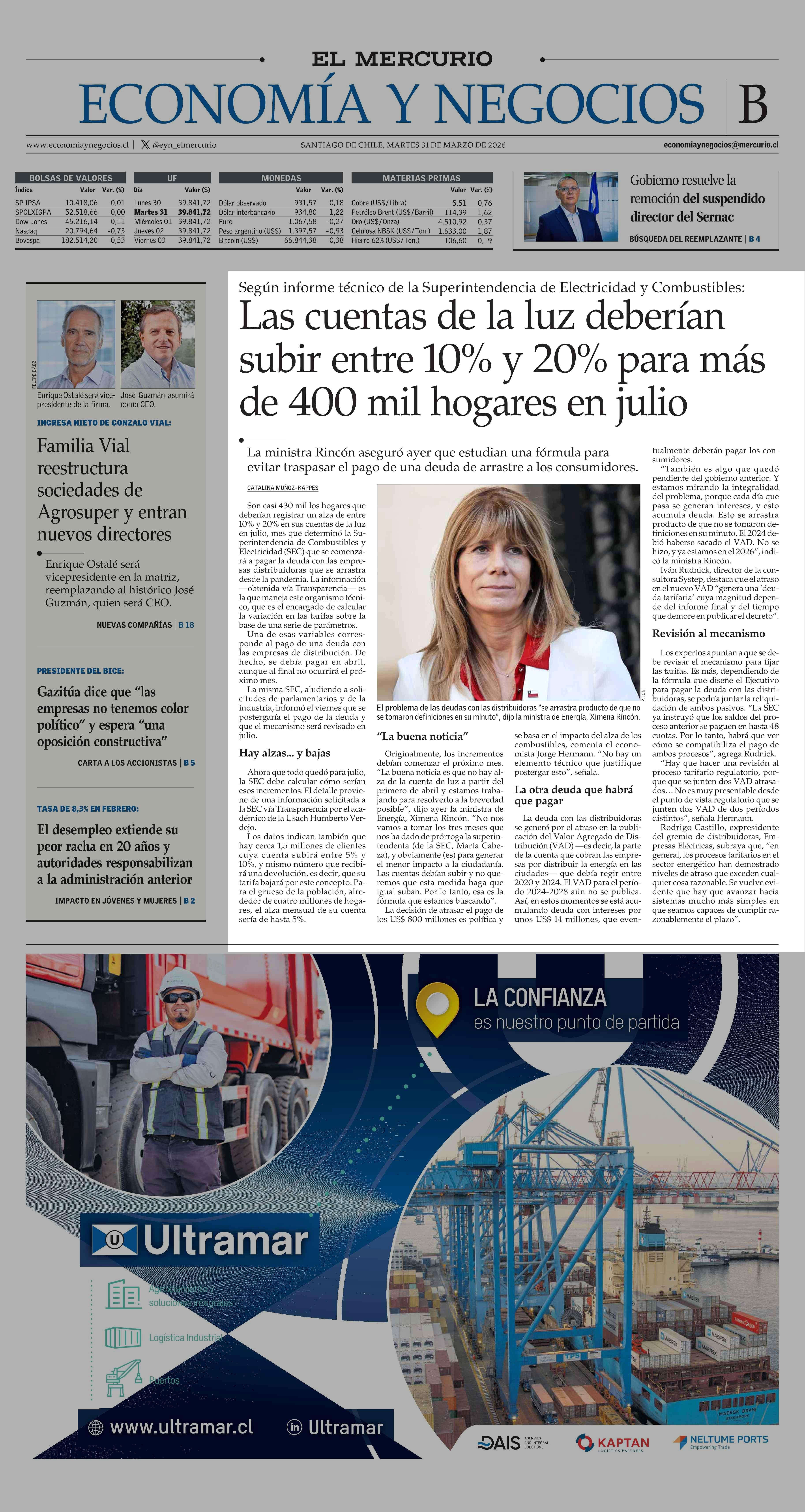 Las cuentas de la luz deberían subir entre 10% y 20% para más de 400 mil hogares en julio 31-03-2026 El Mercurio |