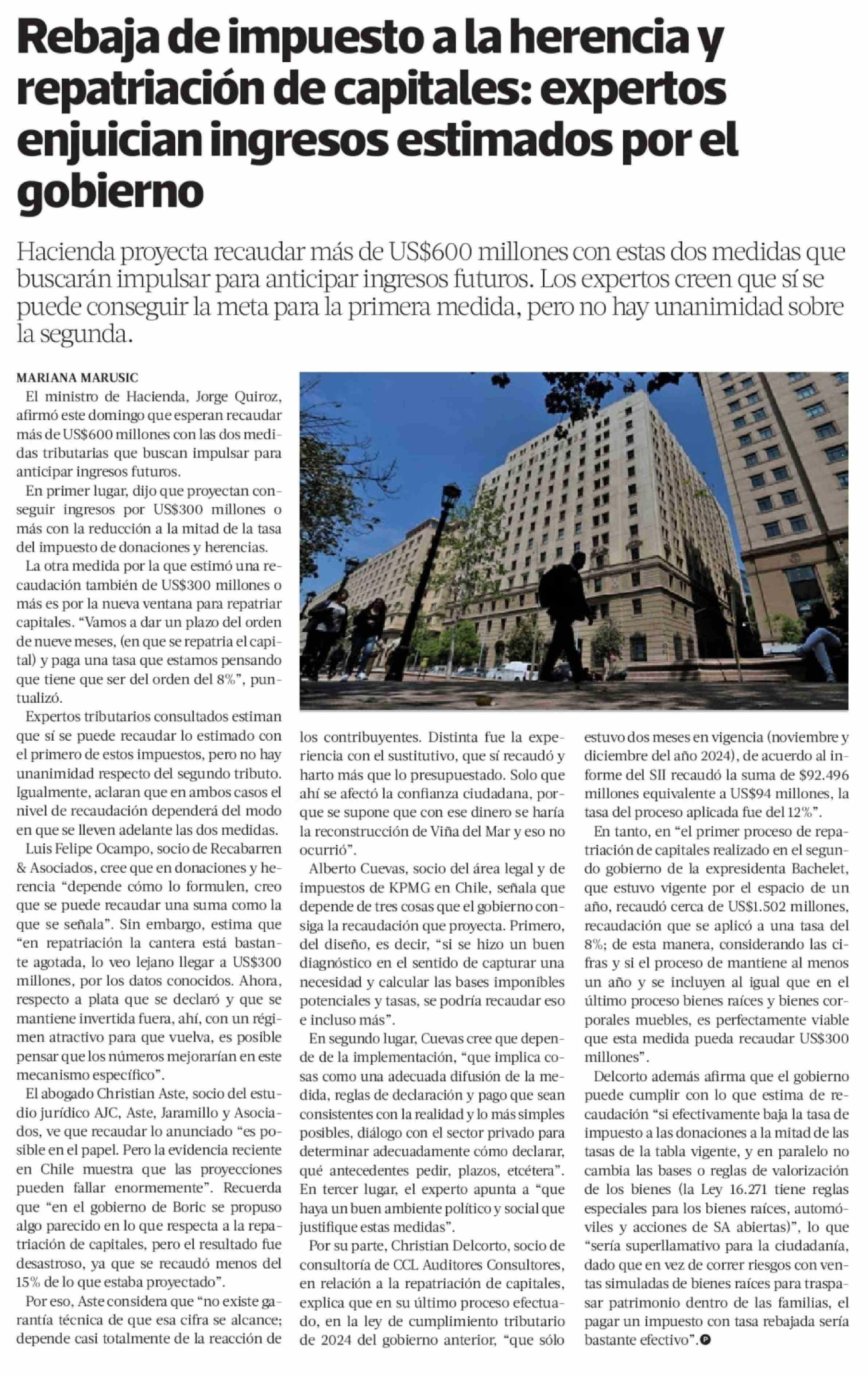 Rebaja de impuesto a la herencia y repatriación de capitales: expertos enjuician ingresos estimados por el gobierno 16-03-2026 La Tercera |