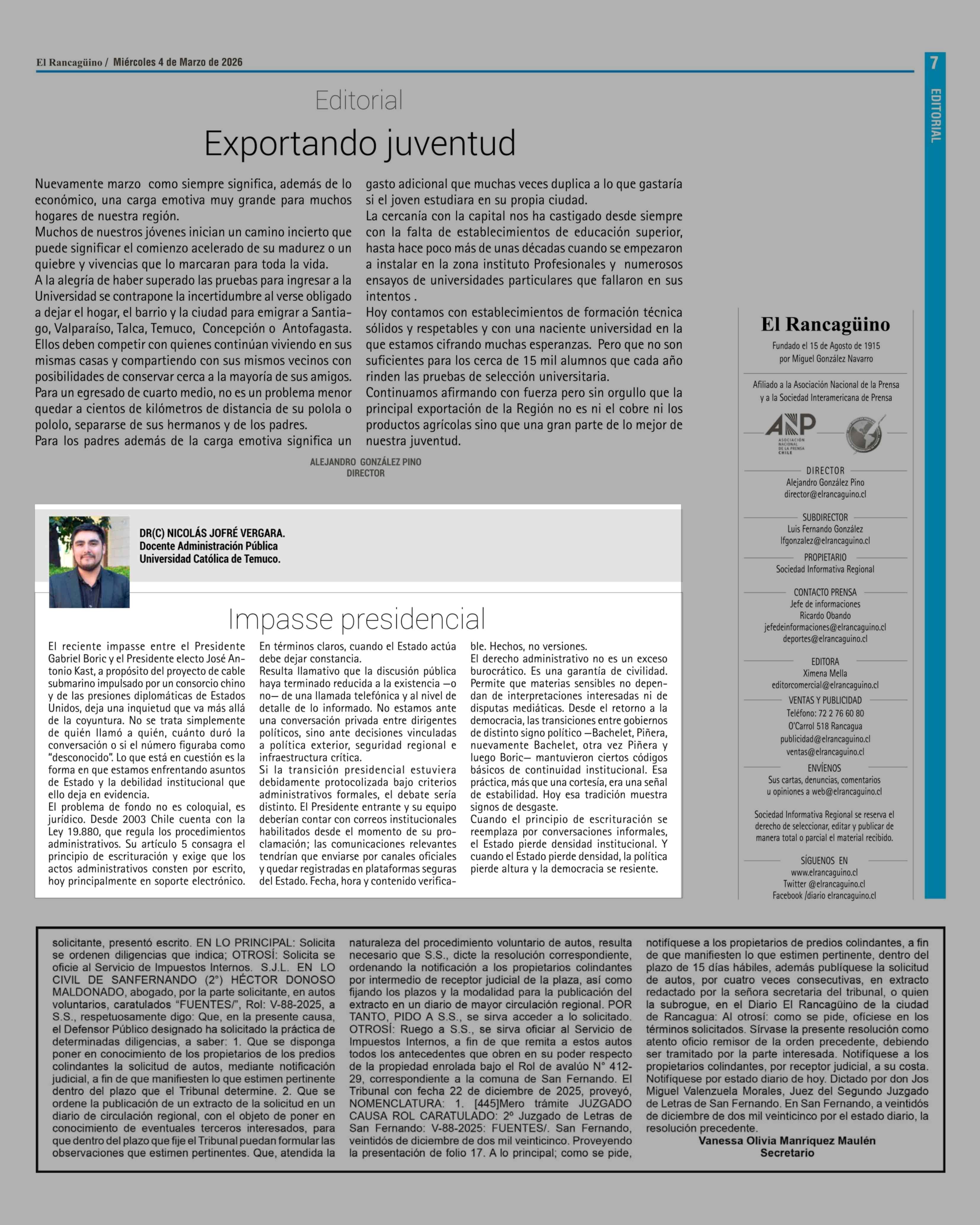 Columnas de Opinión: Impasse presidencial 04-03-2026 El Rancagüino |