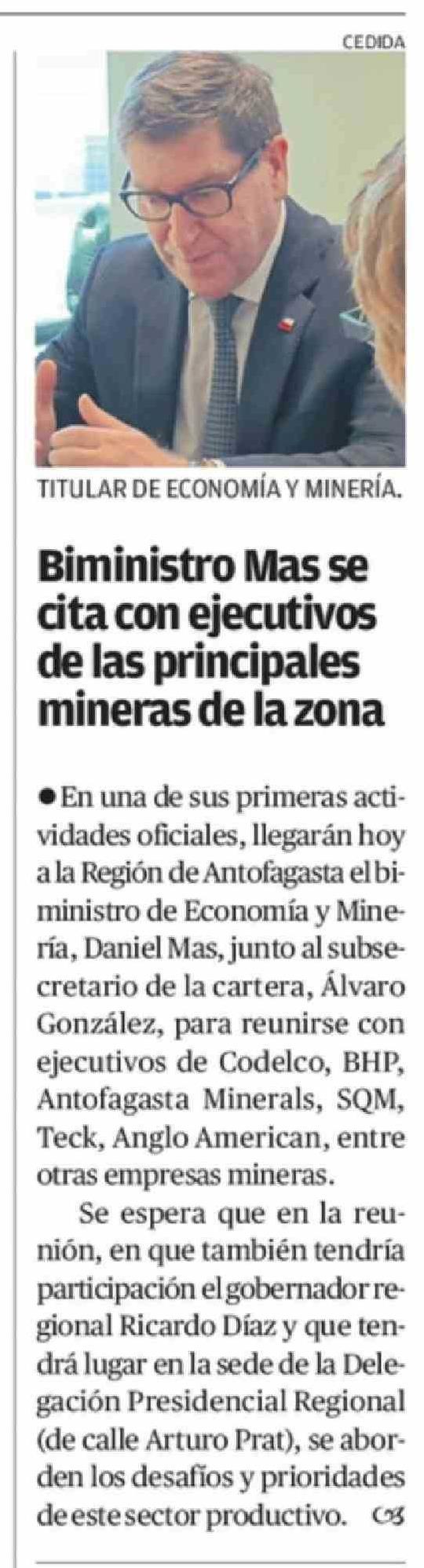 Biministro Mas se cita con ejecutivos de las principales mineras de la zona 13-03-2026 El Mercurio de Antofagasta |