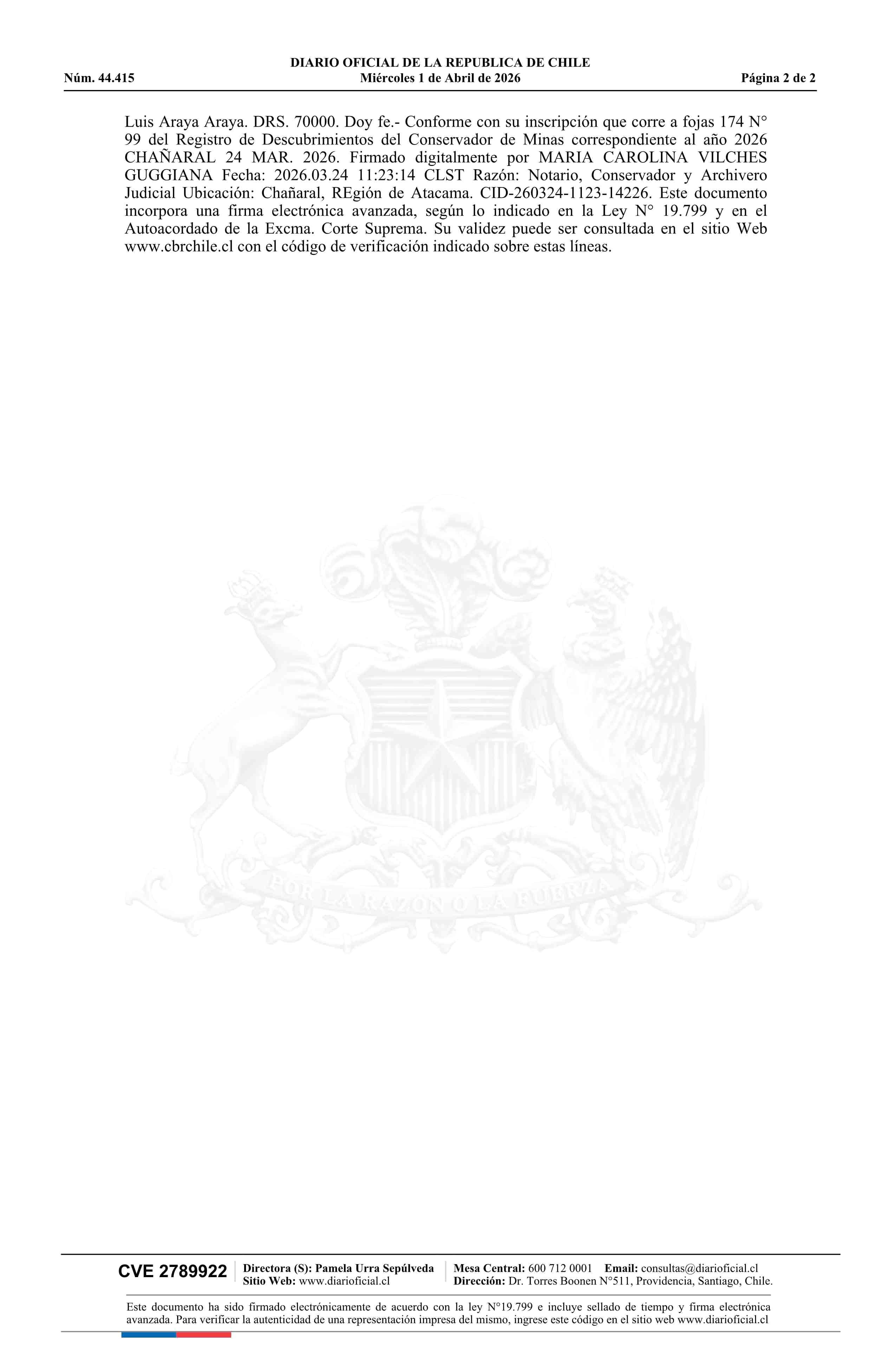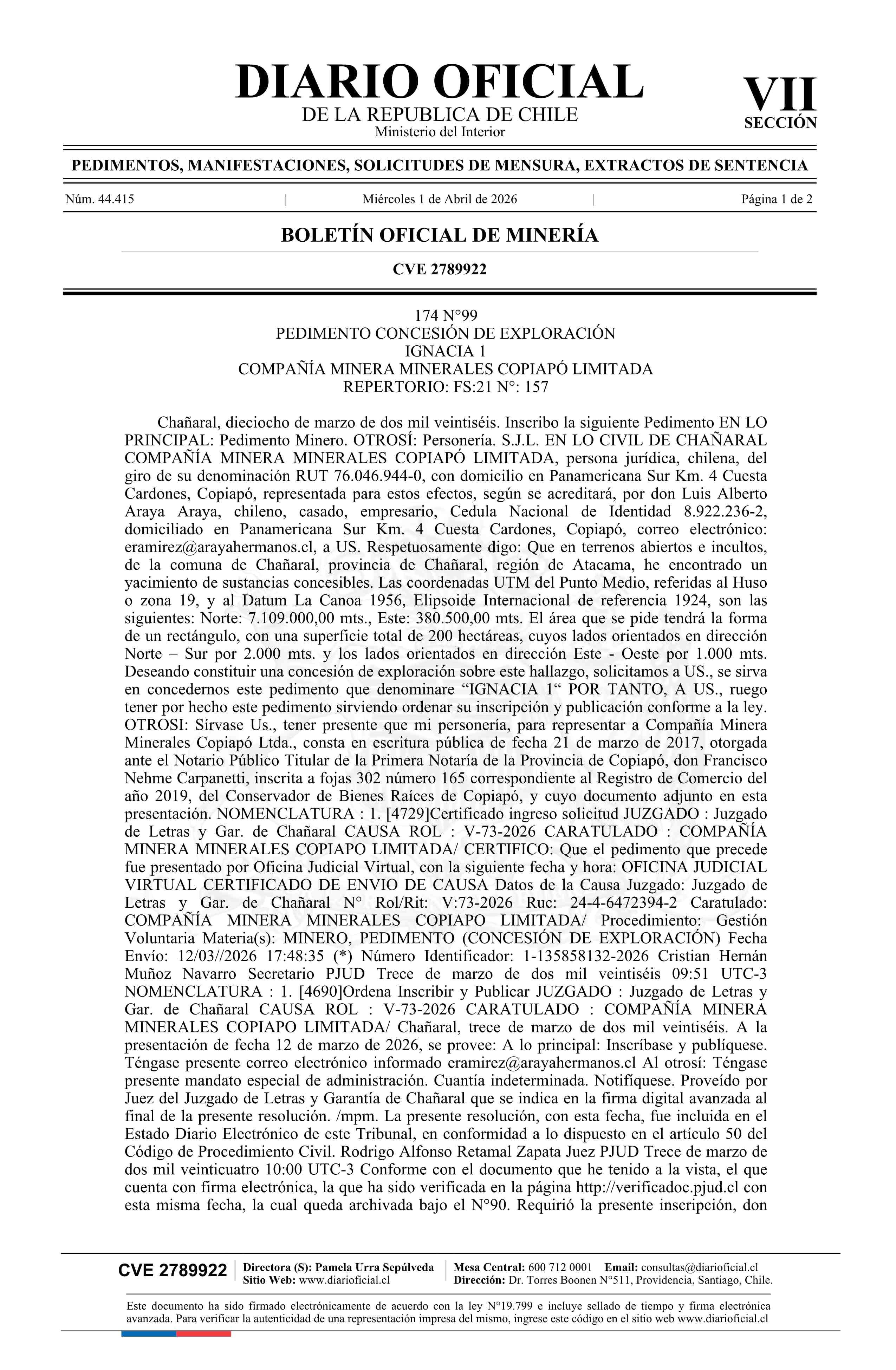IGNACIA 1 / Compañía Minera Minerales Copiapó Limitada 01-04-2026 DIARIO OFICIAL CHILE - BOLETÍN OFICIAL DE MINERÍA |