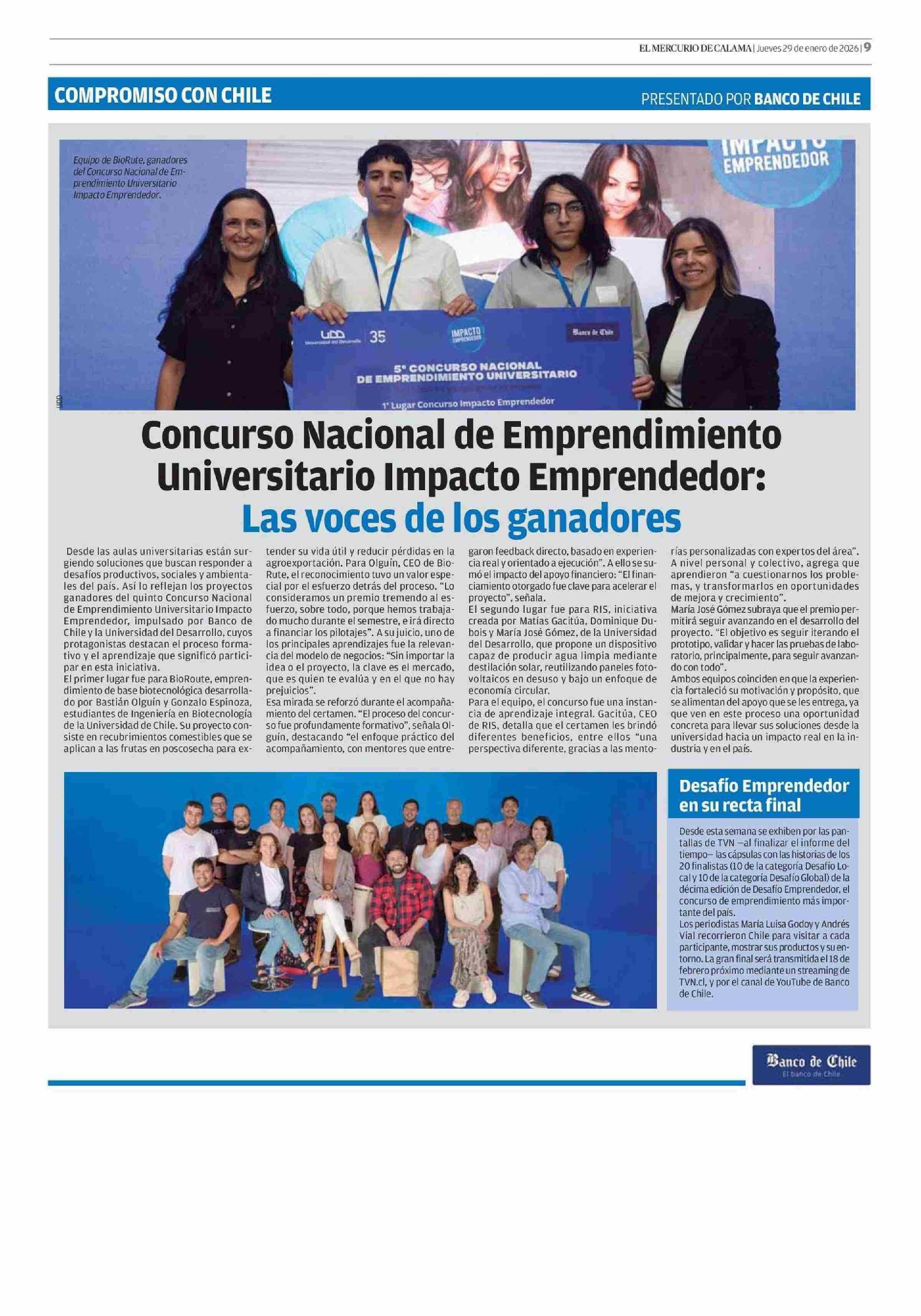 Concurso Nacional de Emprendimiento Universitario Impacto Emprendedor: Las voces de los ganadores 29-01-2026 El Mercurio de Calama |