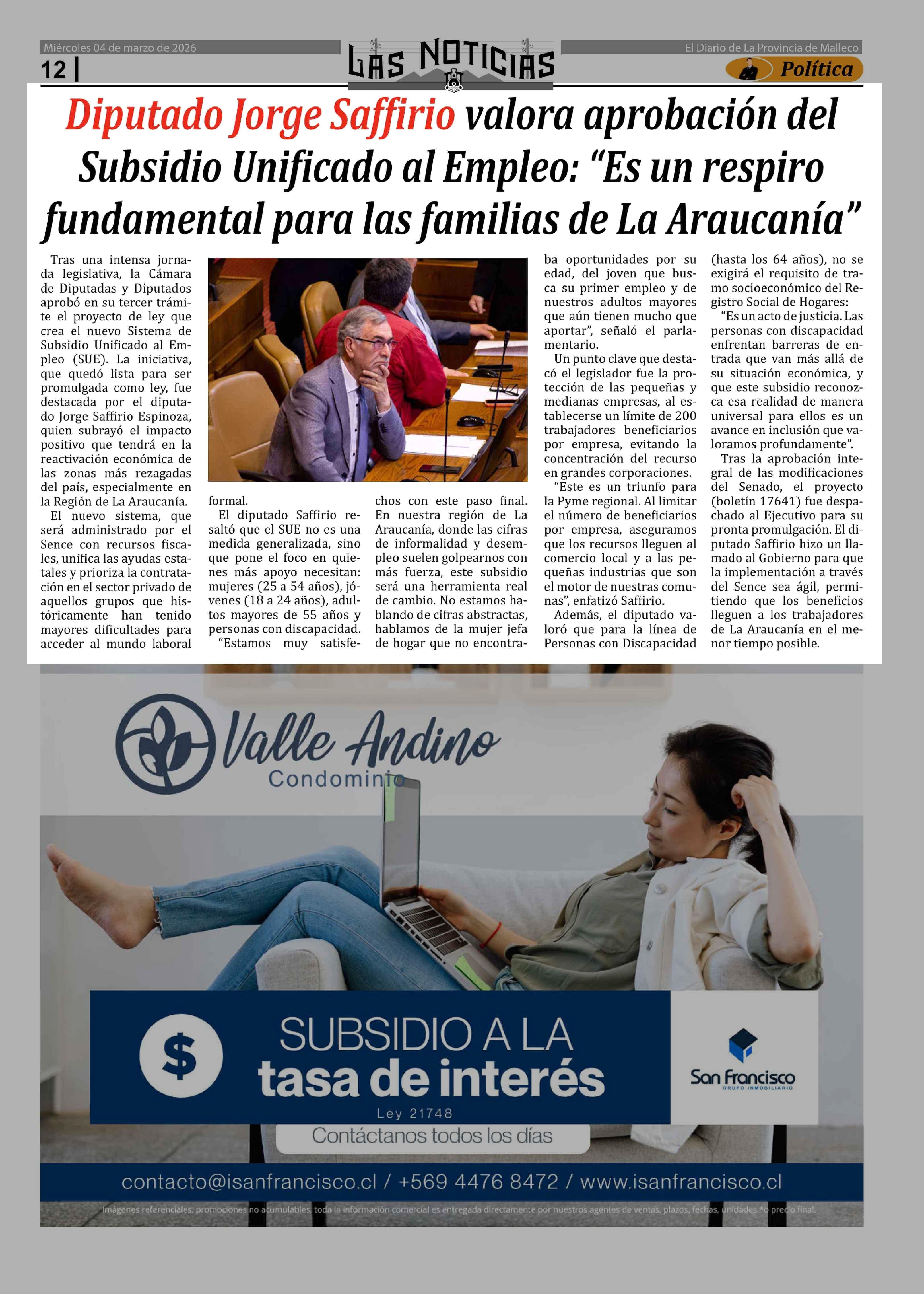 Diputado Jorge Saffirio valora aprobación del Subsidio Unificado al Empleo: "Es un respiro fundamental para las familias de La Araucanía" 04-03-2026 Las Noticias |