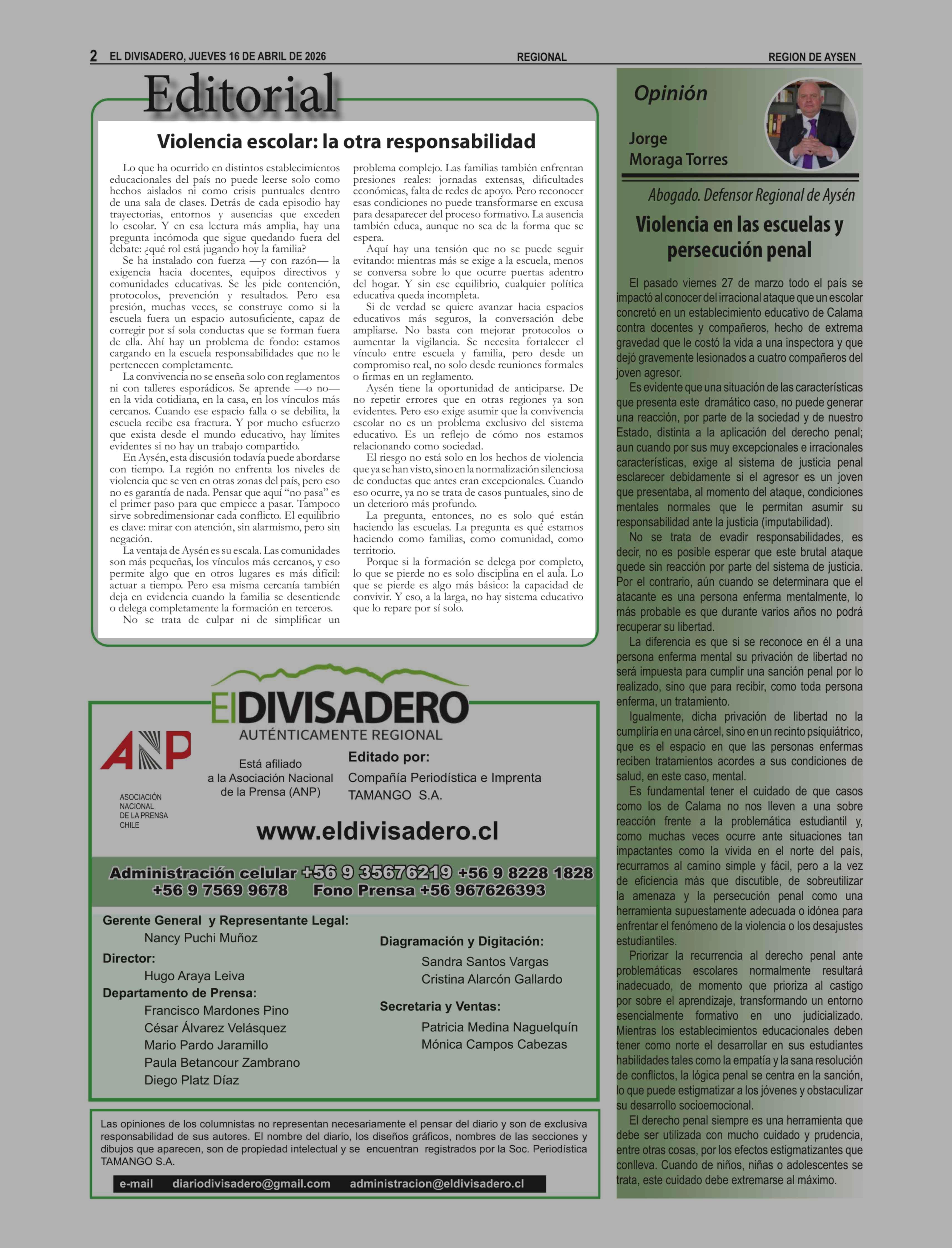 Editorial: Violencia escolar - la otra responsabilidad 16-04-2026 El Divisadero |