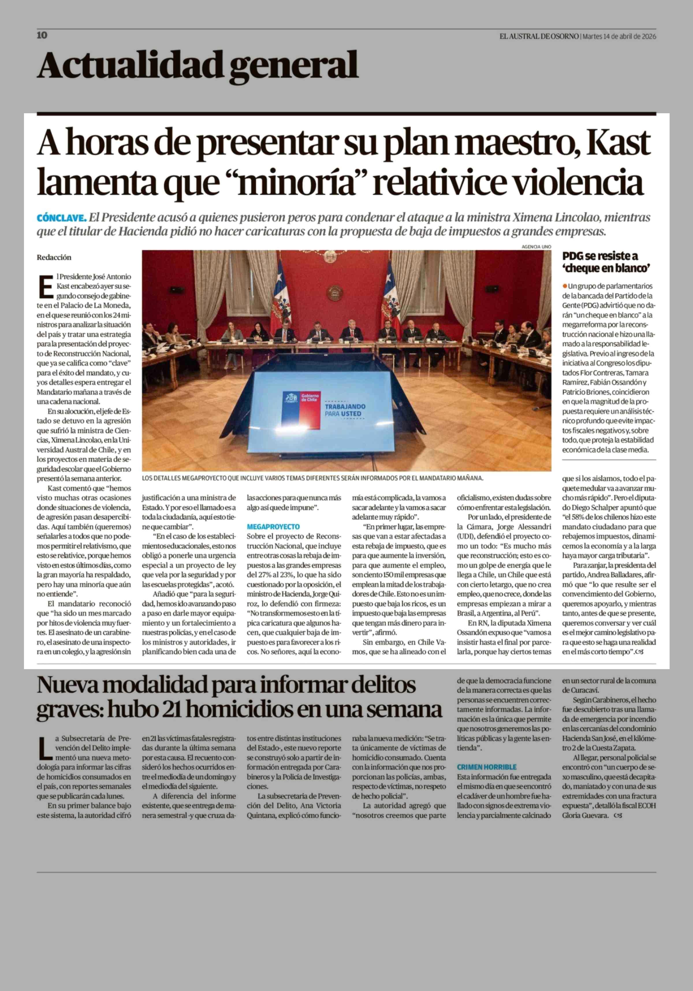 A horas de presentar su plan maestro, Kast lamenta que "minoría" relativice violencia 14-04-2026 El Austral de Osorno |