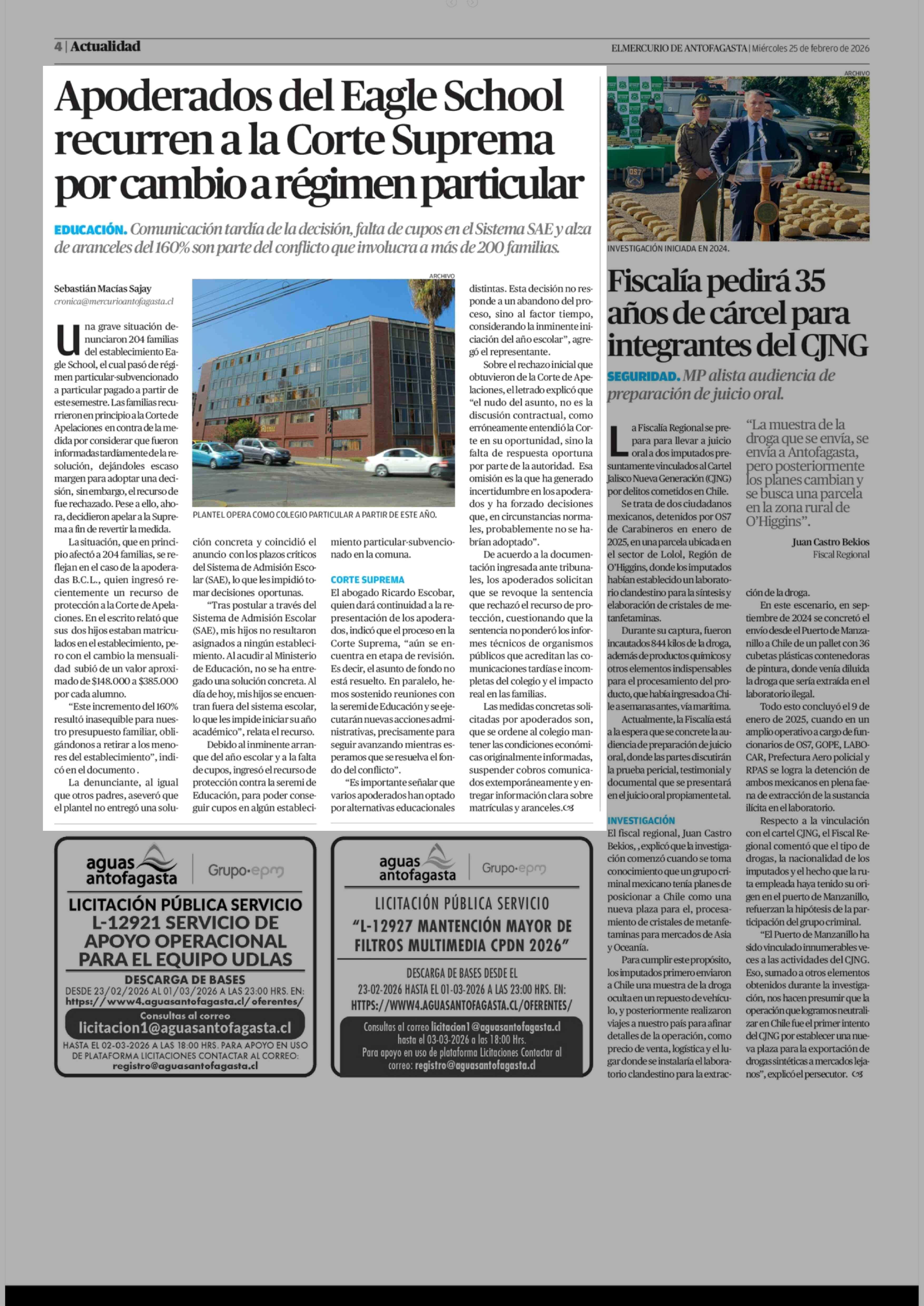 Apoderados del Eagle School recurren a la Corte Suprema por cambio a régimen particular 25-02-2026 El Mercurio de Antofagasta |