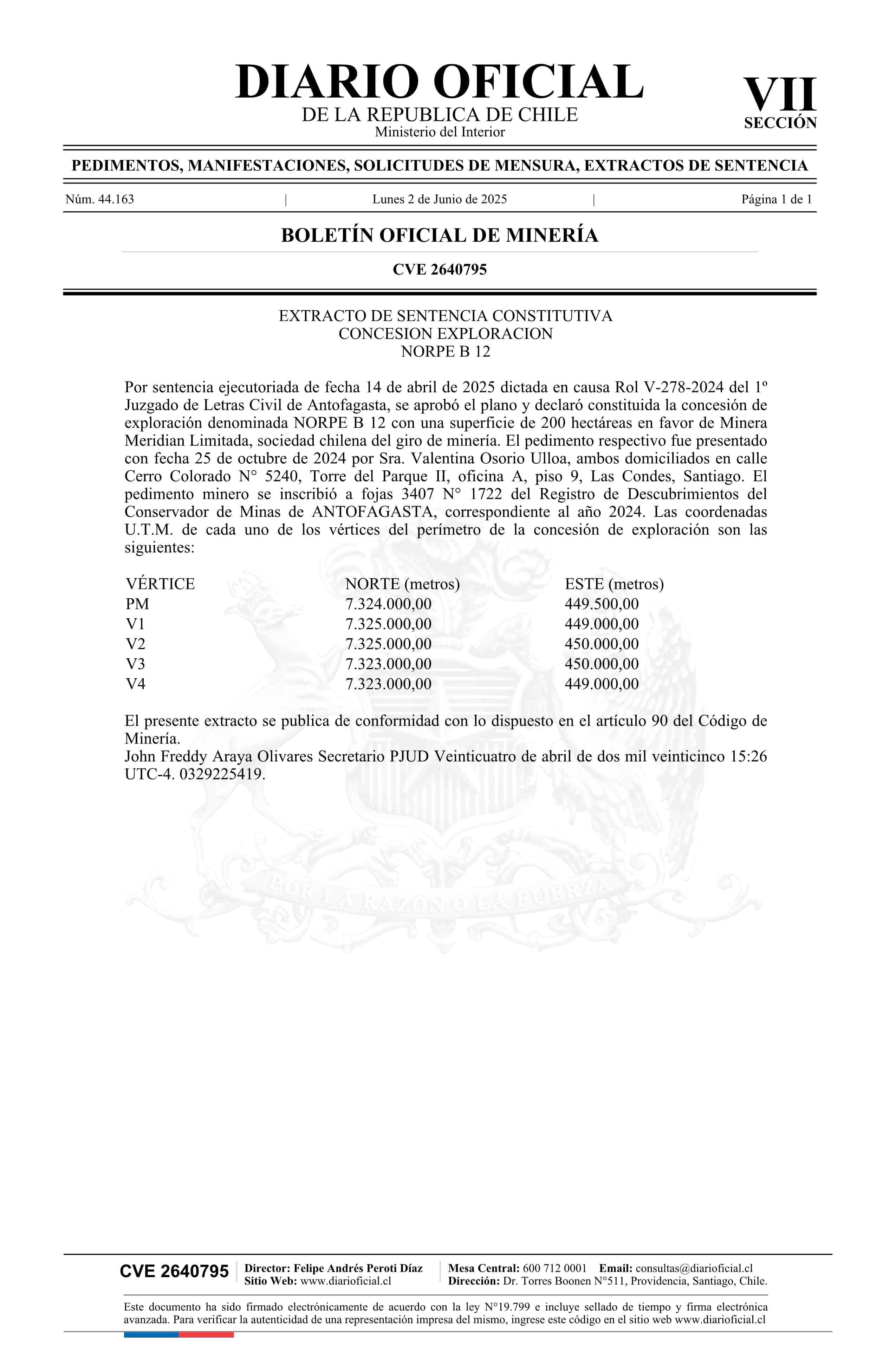 NORPE B 12 / Minera Meridian Limitada 02-06-2025 DIARIO OFICIAL CHILE - BOLETÍN OFICIAL DE MINERÍA |
