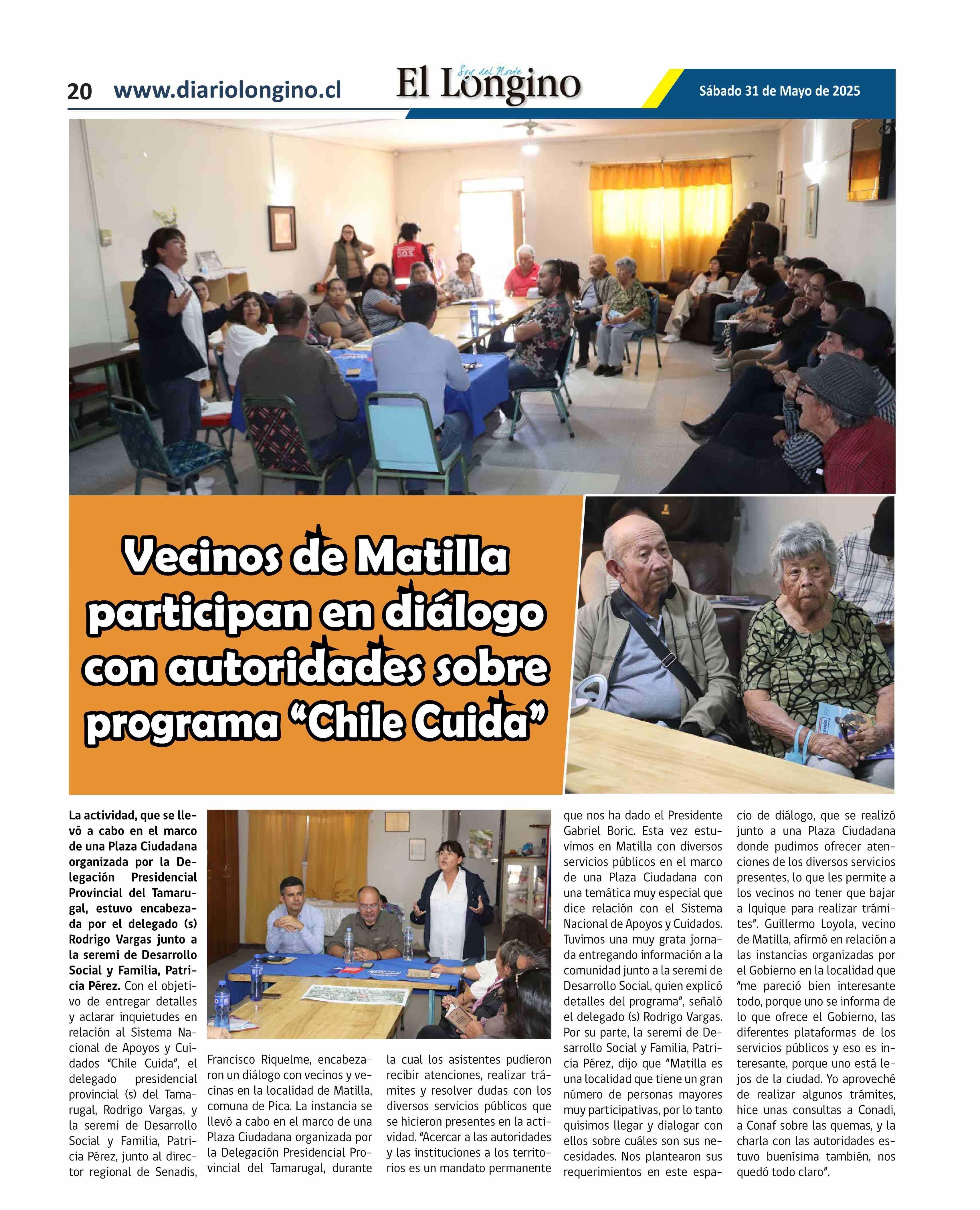 Vecinos de Matilla Vecinos de Matilla participan en diálogo participan en diálogo con autoridades sobre con autoridades sobre programa “Chile Cuida” programa “Chile Cuida” 31-05-2025 El Longino |