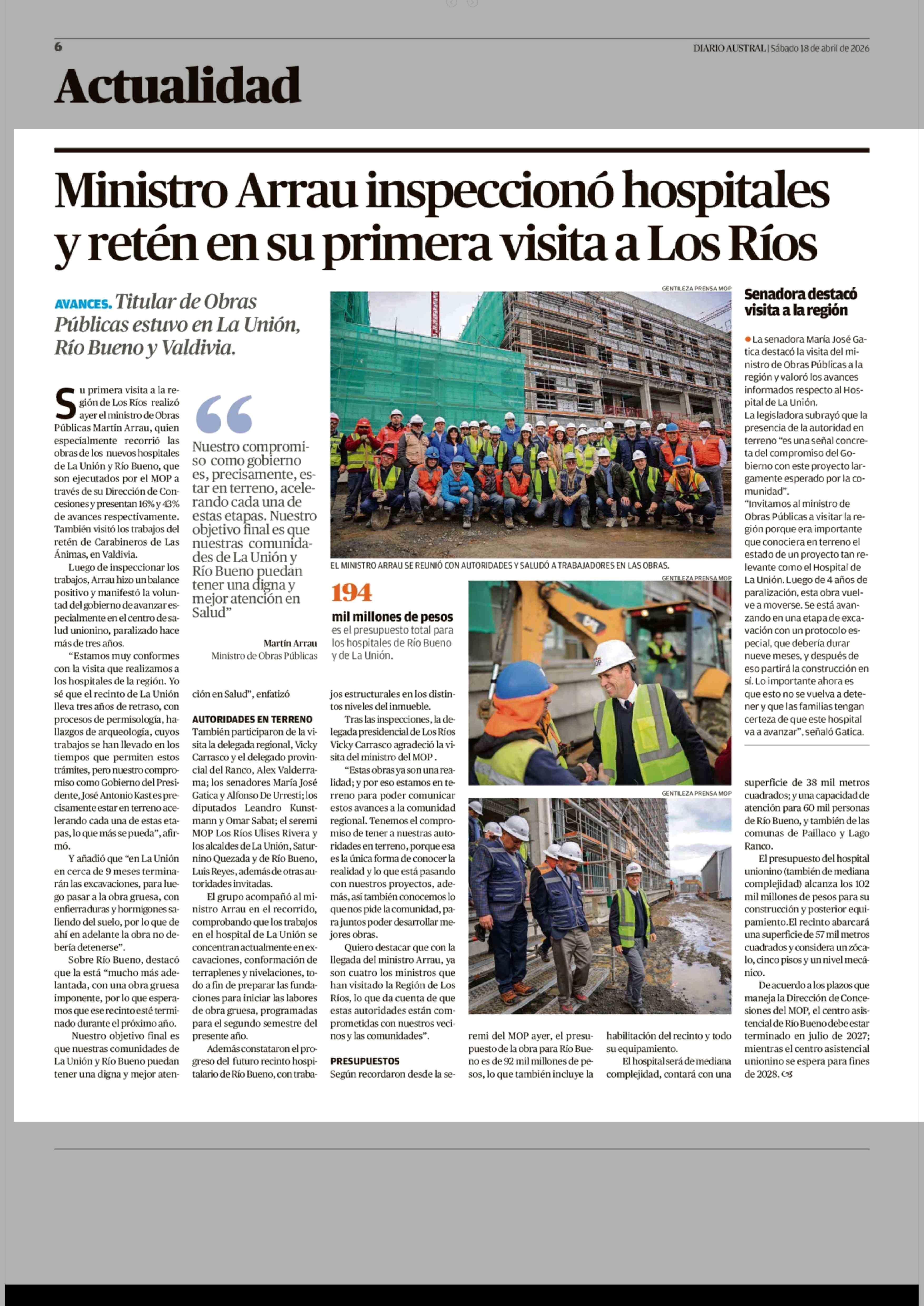 Ministro Arrau inspeccionó hospitales y retén en su primera visita a Los Ríos 18-04-2026 Diario Austral Región de Los Ríos |