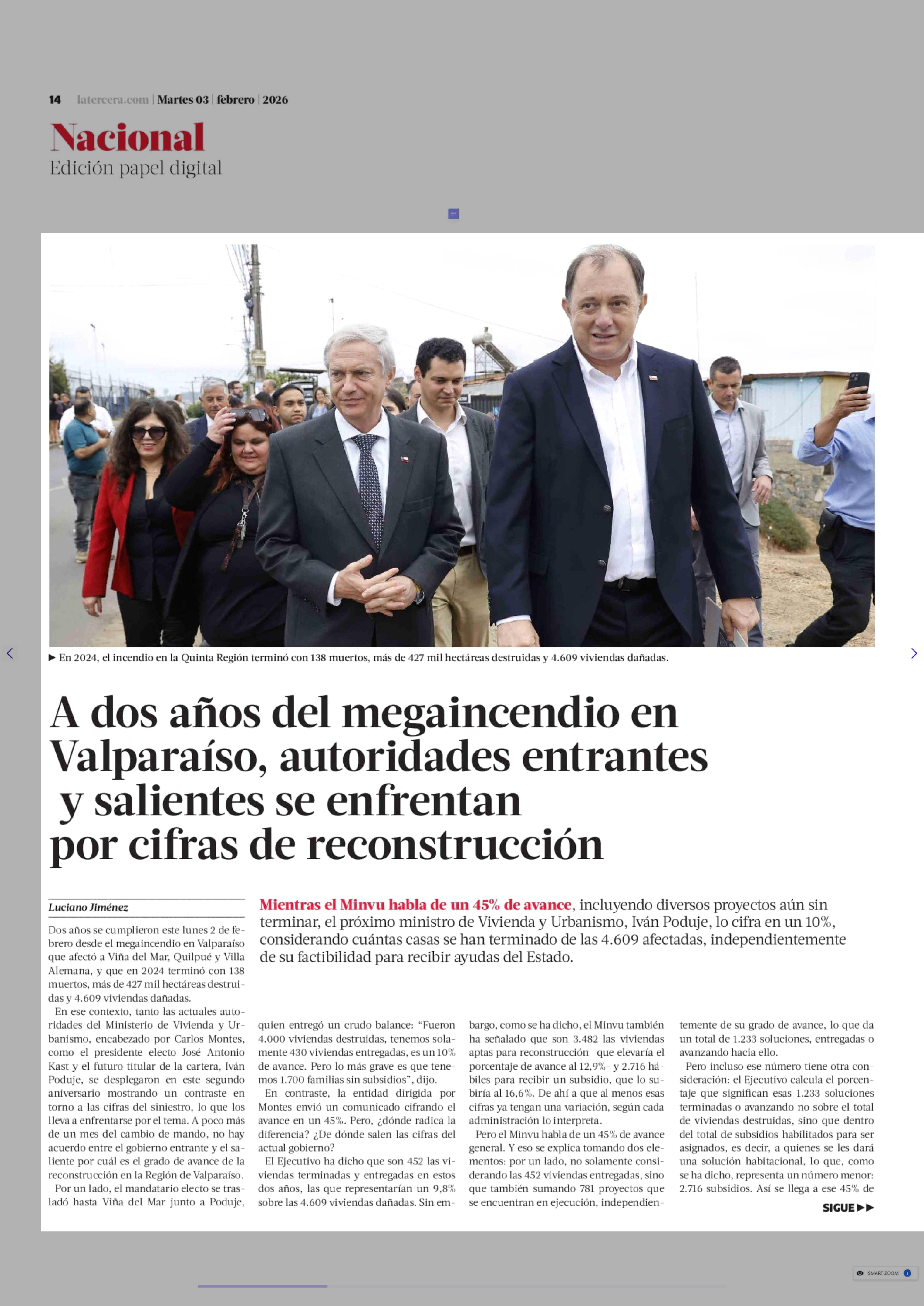 | Título: | A dos años del megaincendio en Valparaíso, autoridades entrantes y salientes se enfrentan por cifras de reconstrucción |