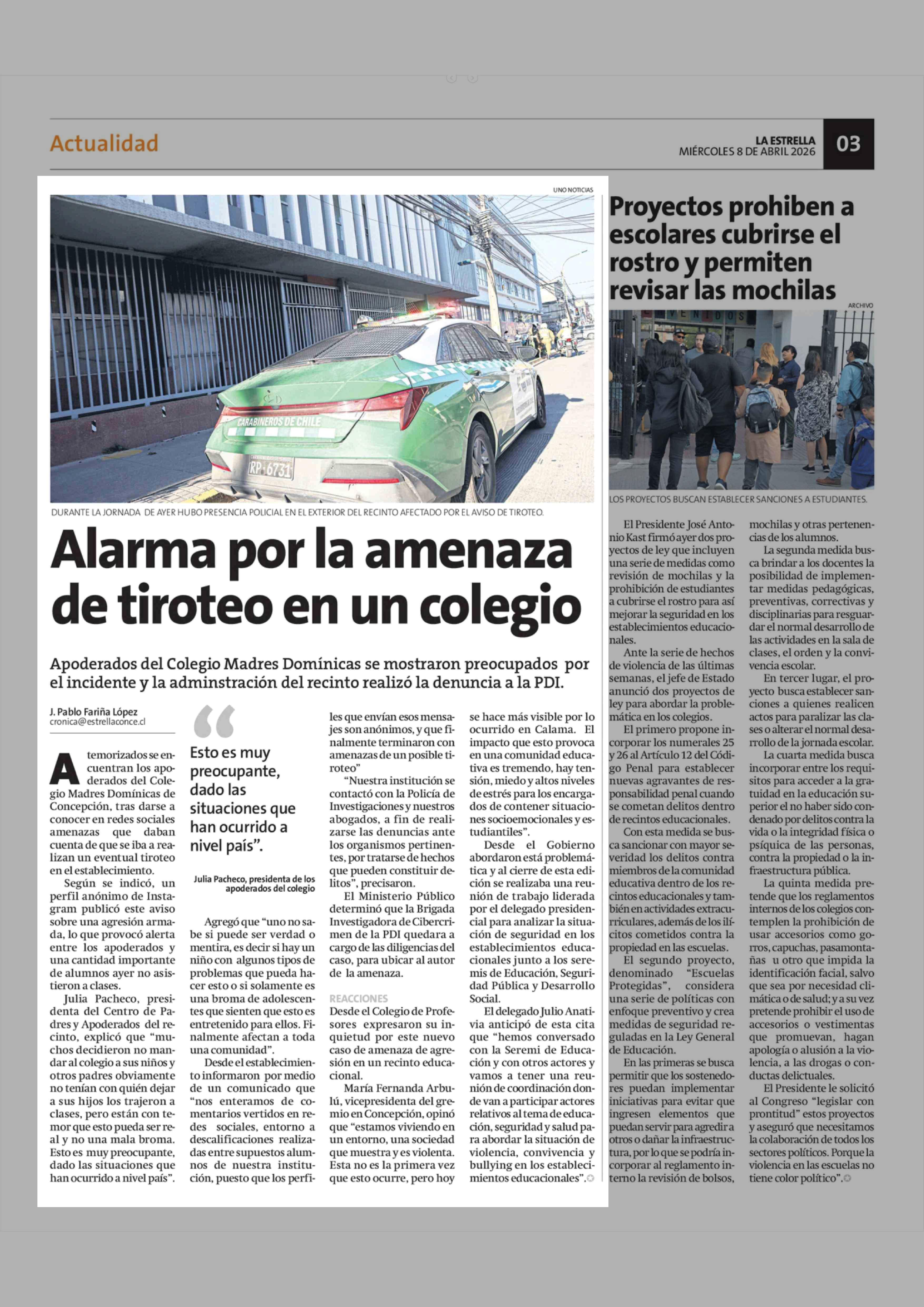 Alarma por la amenaza de tiroteo en un colegio 08-04-2026 La Estrella de Concepción |