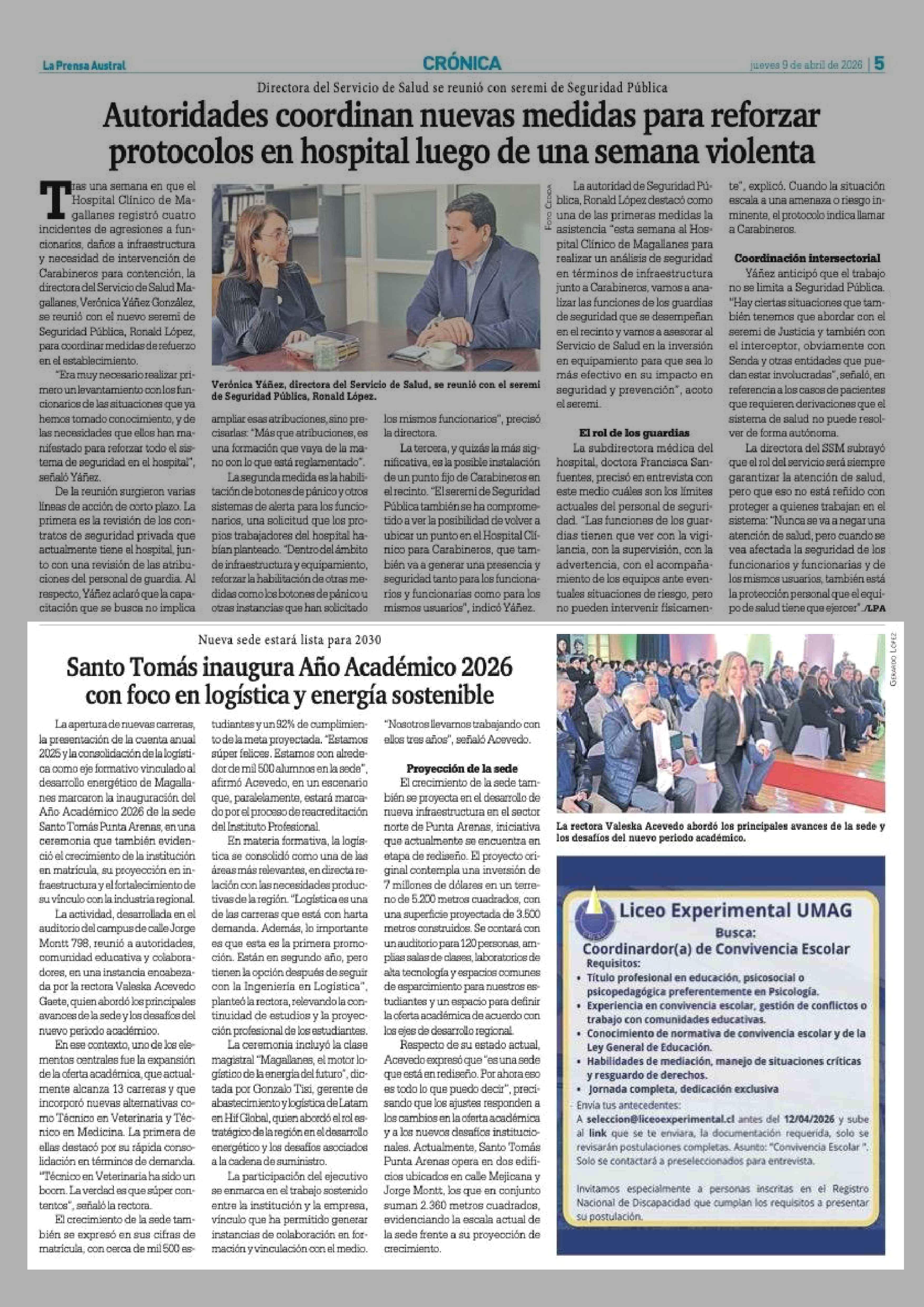 Santo Tomás inaugura Año Académico 2026 con foco en logística y energía sostenible 09-04-2026 La Prensa Austral |