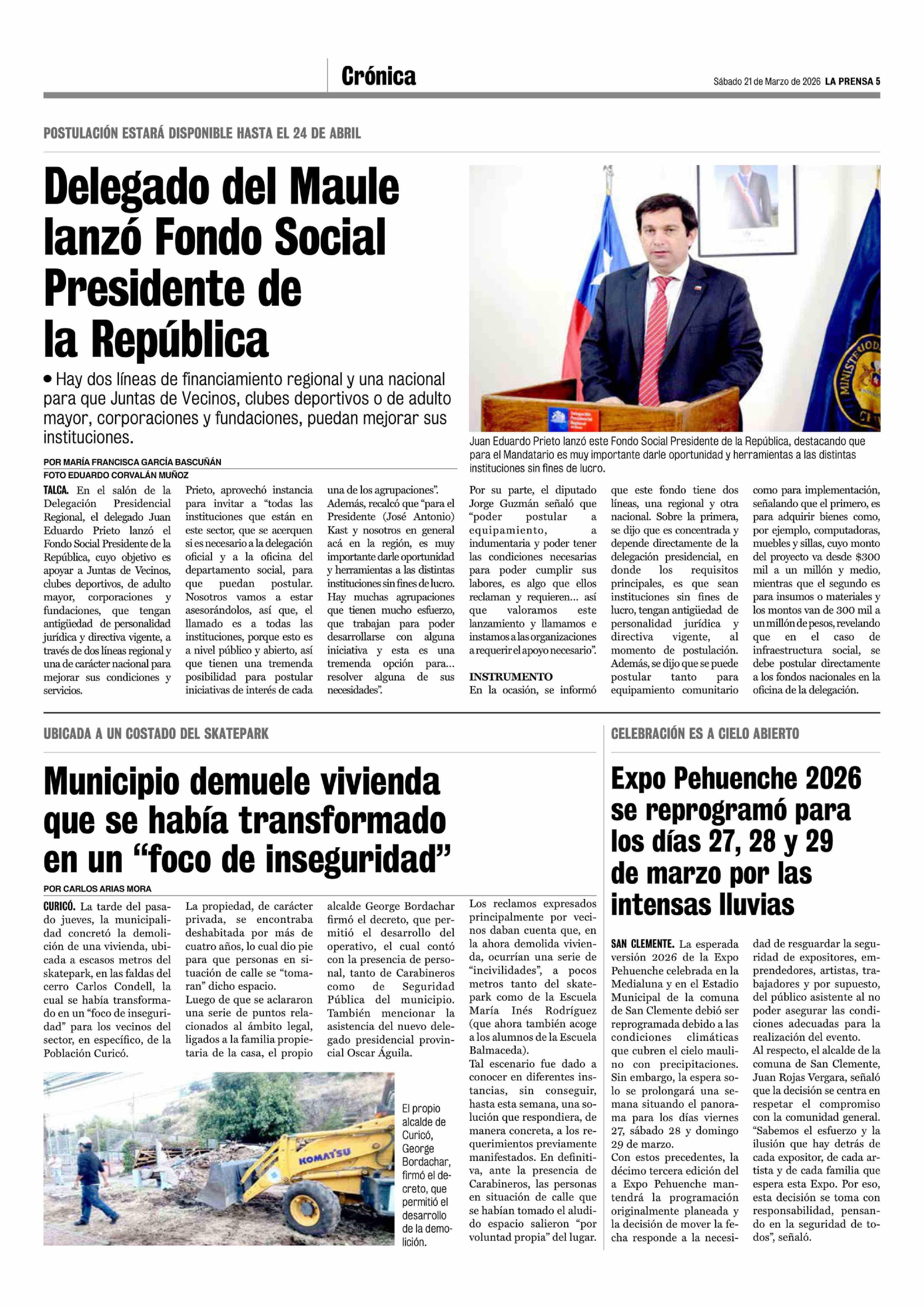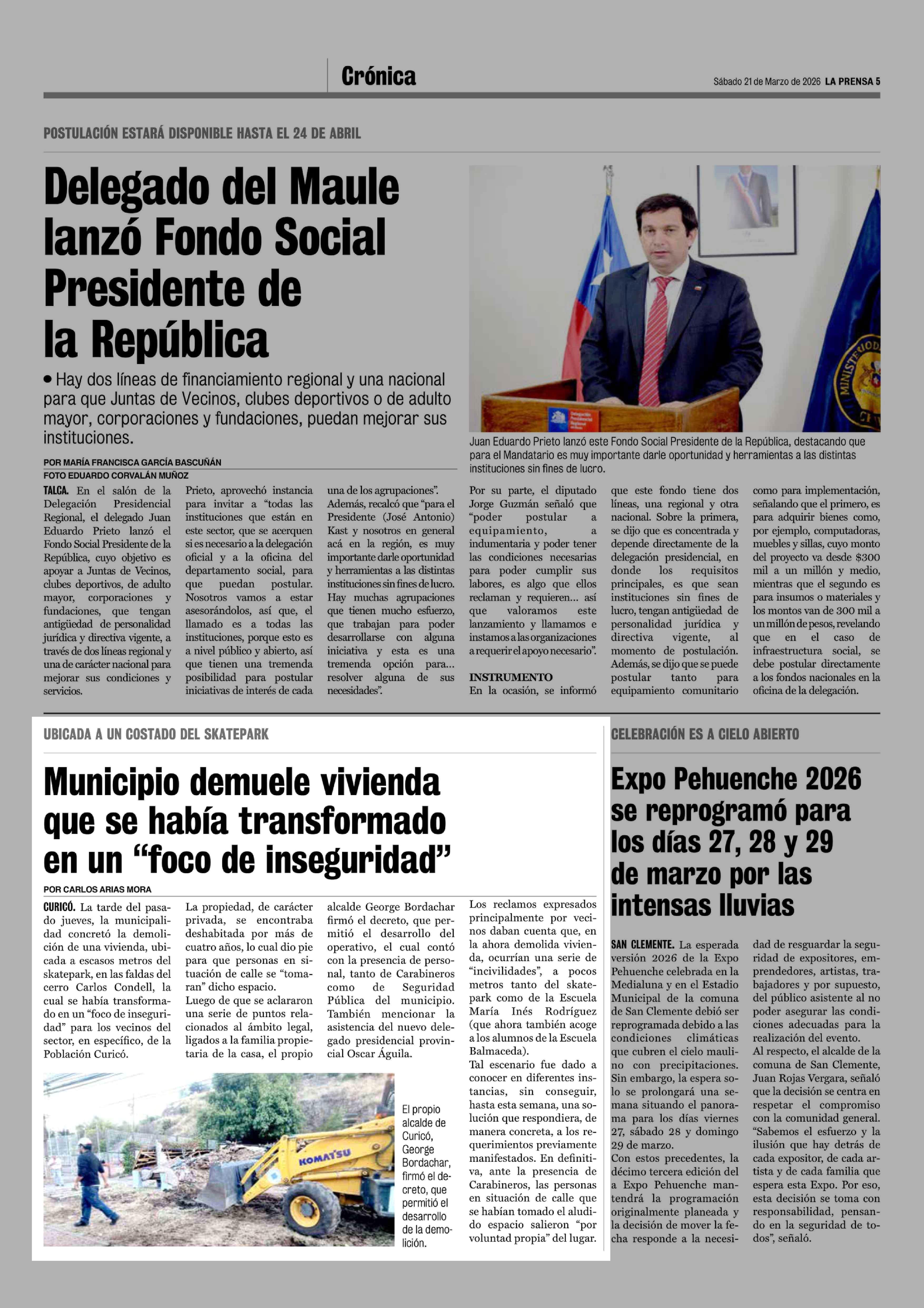 Municipio demuele vivienda que se había transformado en un "foco de inseguridad" 21-03-2026 La Prensa de Curicó |