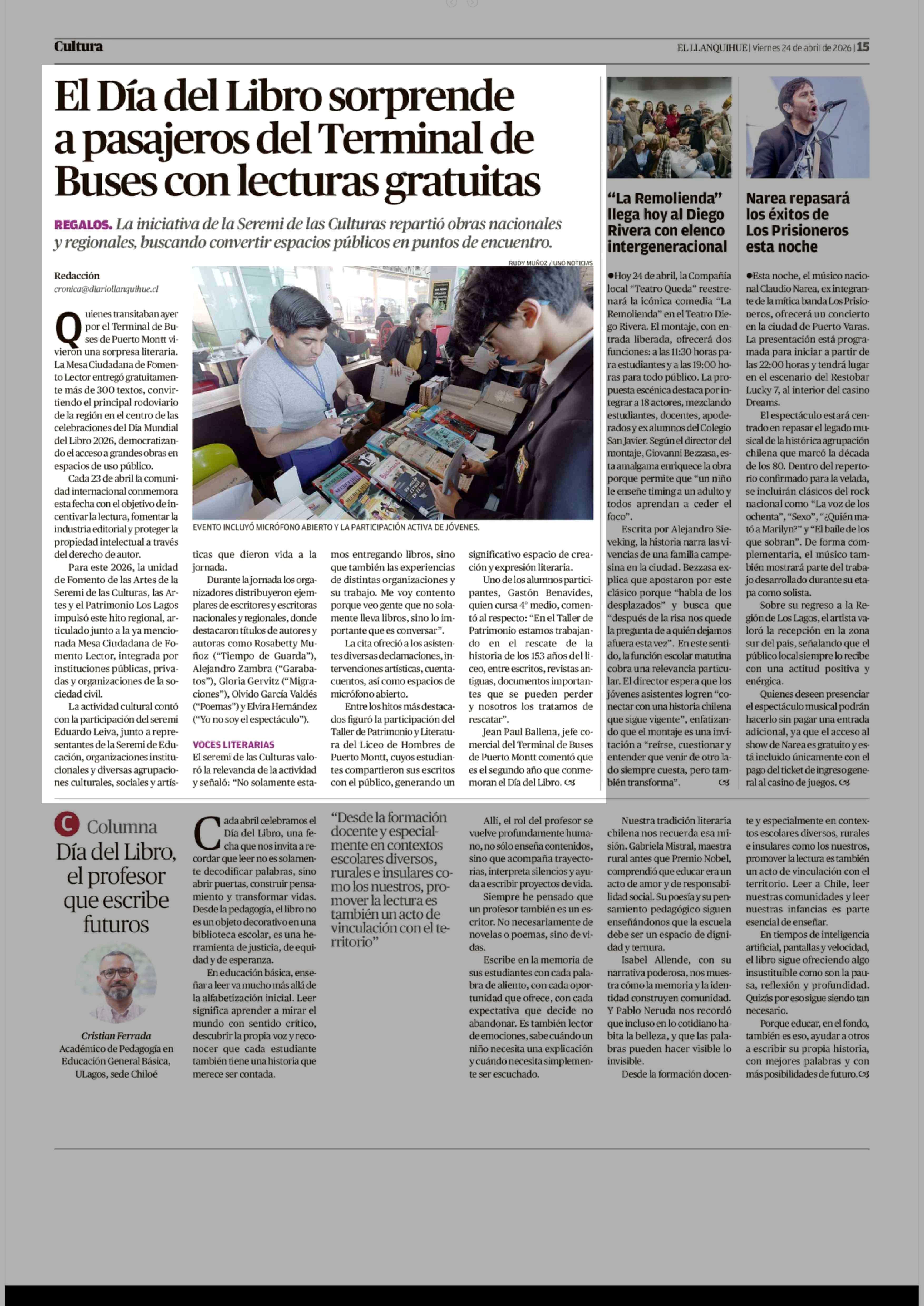 El Día del Libro sorprende a pasajeros del Terminal de Buses con lecturas gratuitas 24-04-2026 El Llanquihue |