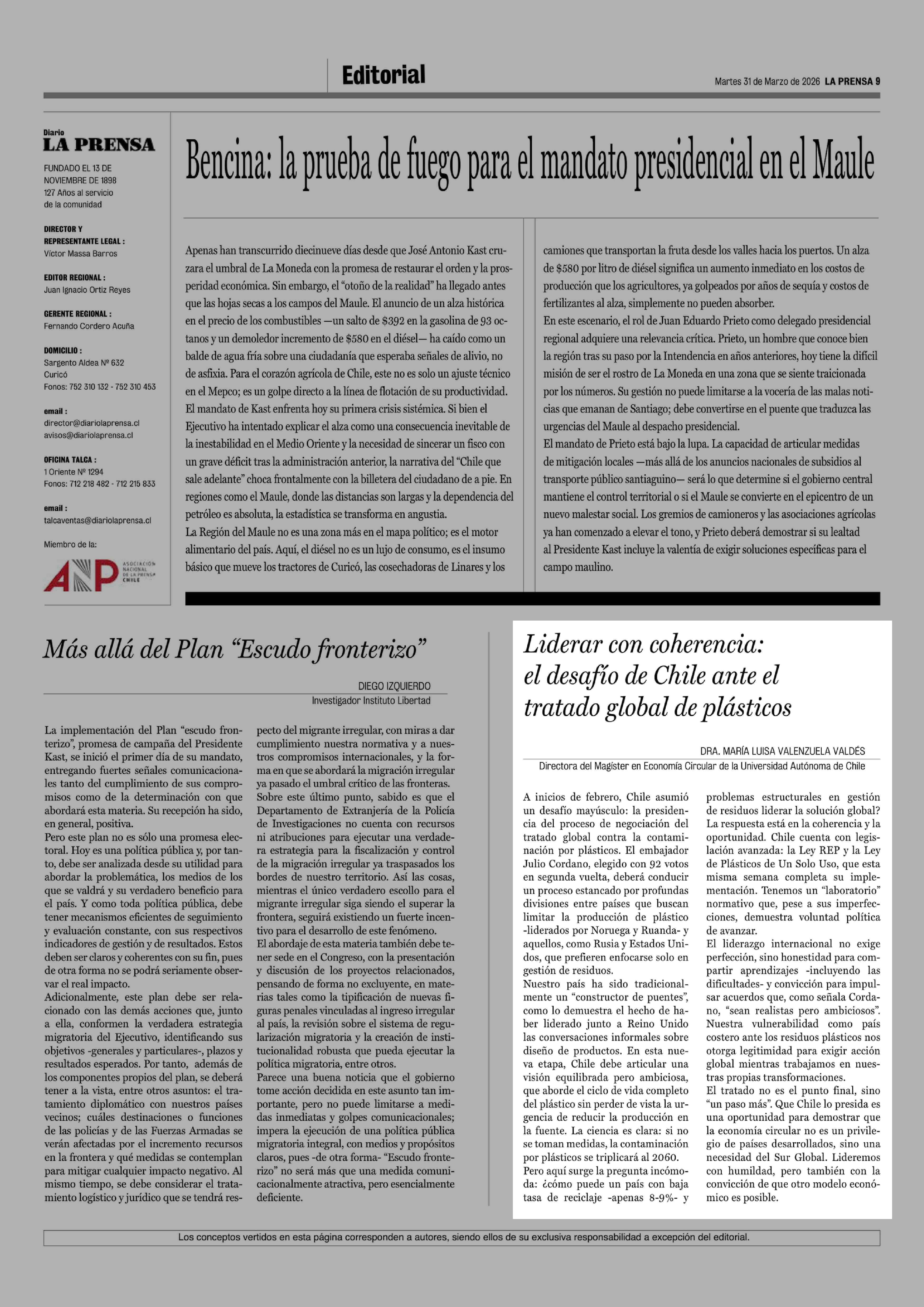 Cartas: Liderar con coherencia: el desafío de Chile ante el tratado global de plásticos 31-03-2026 La Prensa de Curicó |