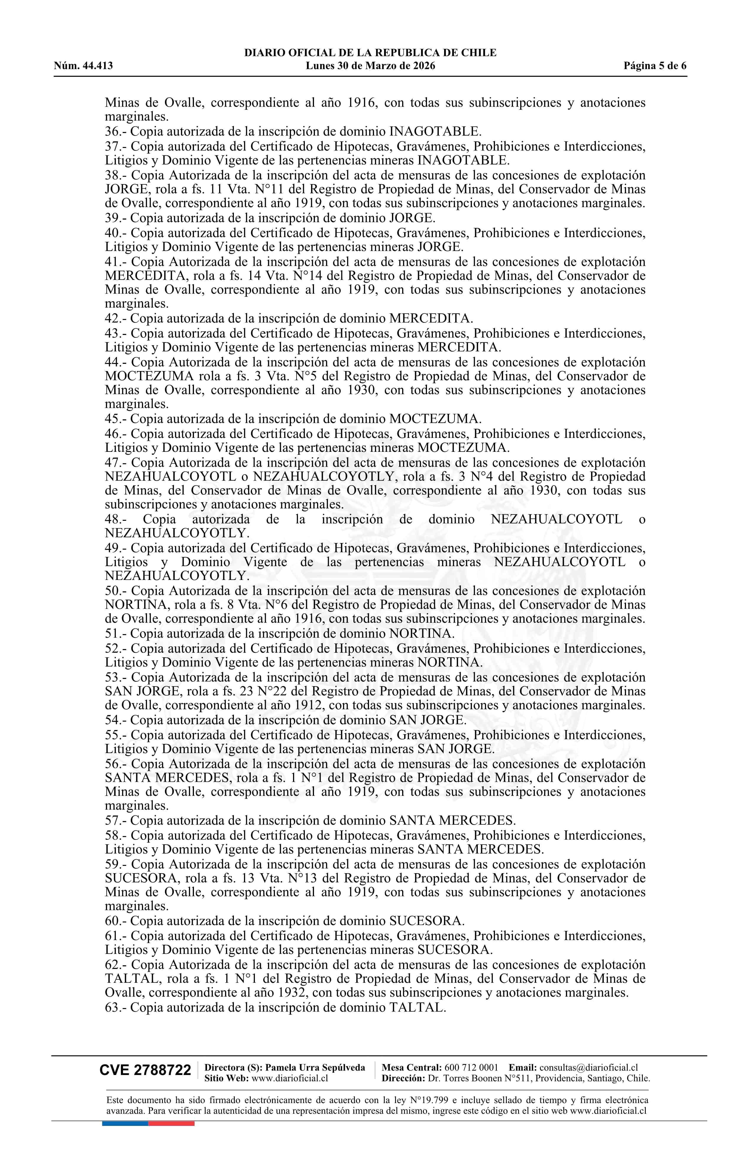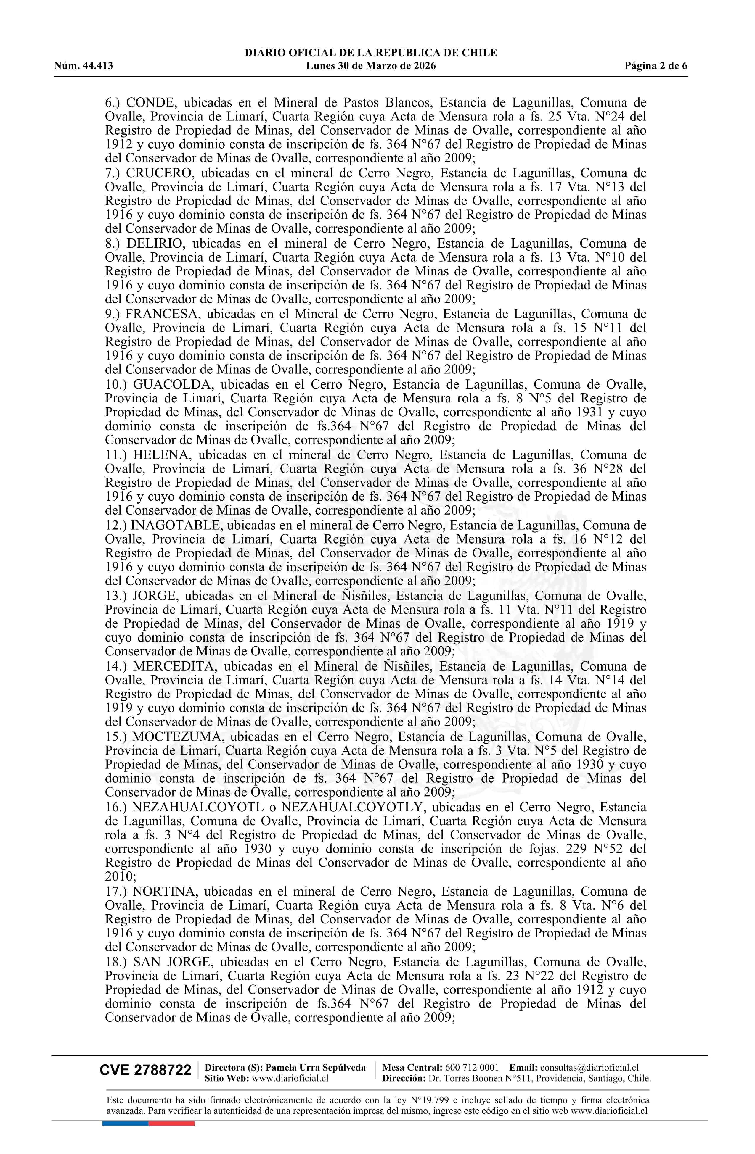 | Fuente: | DIARIO OFICIAL CHILE - BOLETÍN OFICIAL DE MINERÍA (DIARIO OFICIAL CHILE – BOM – RENUNCIAS CONCESIÓN) | Página(s): | 4-9 |