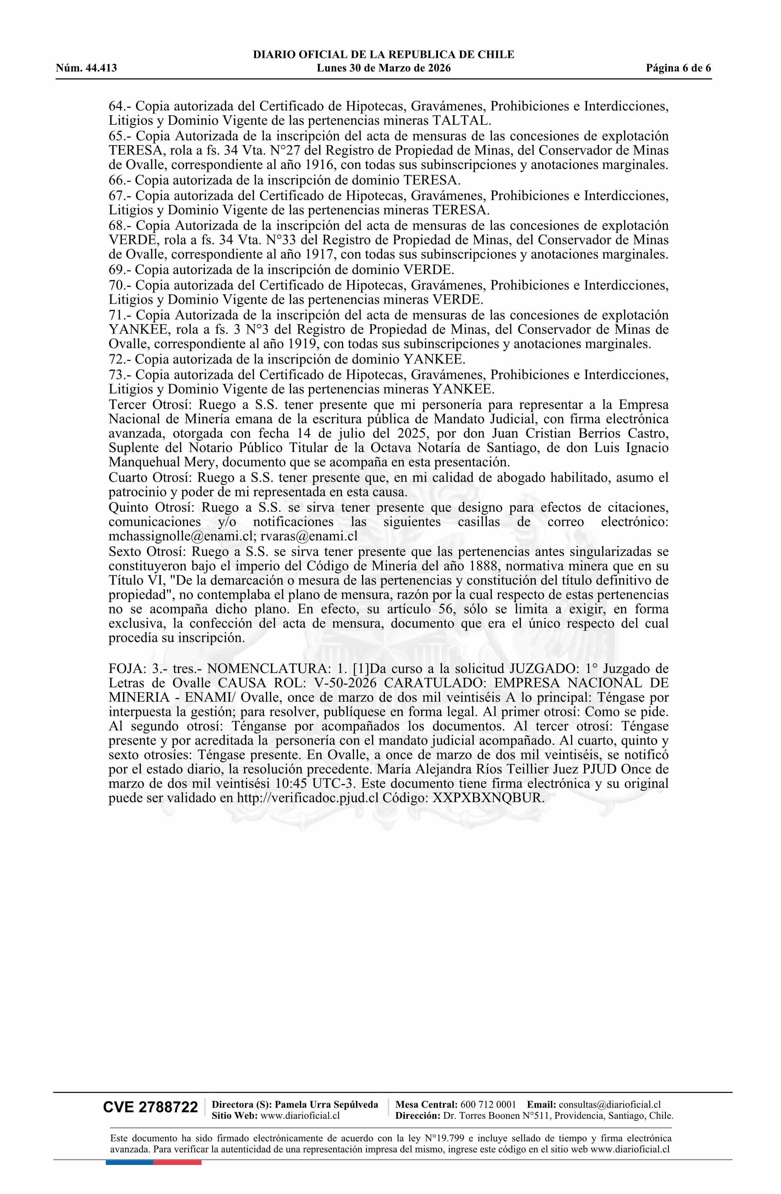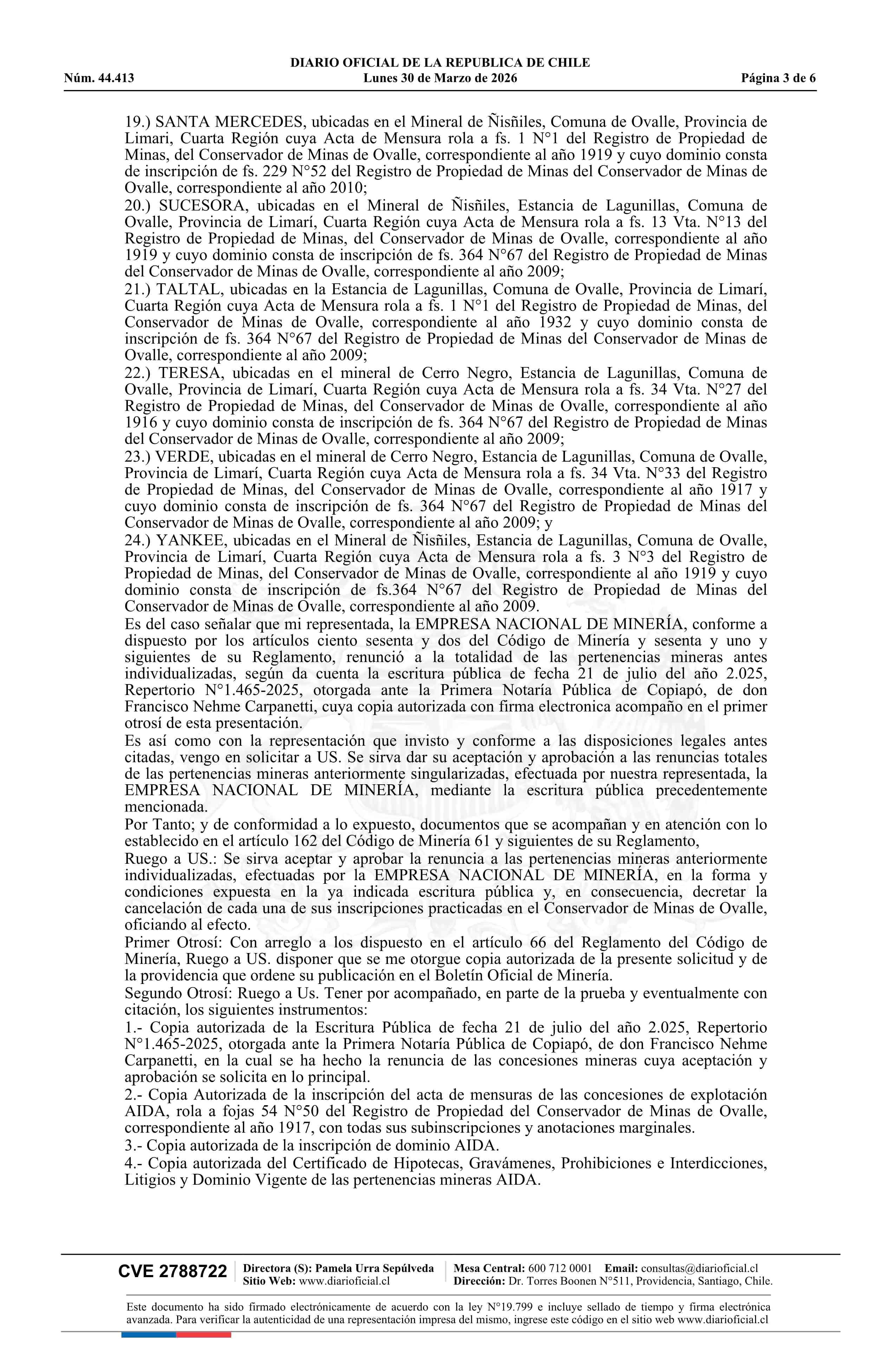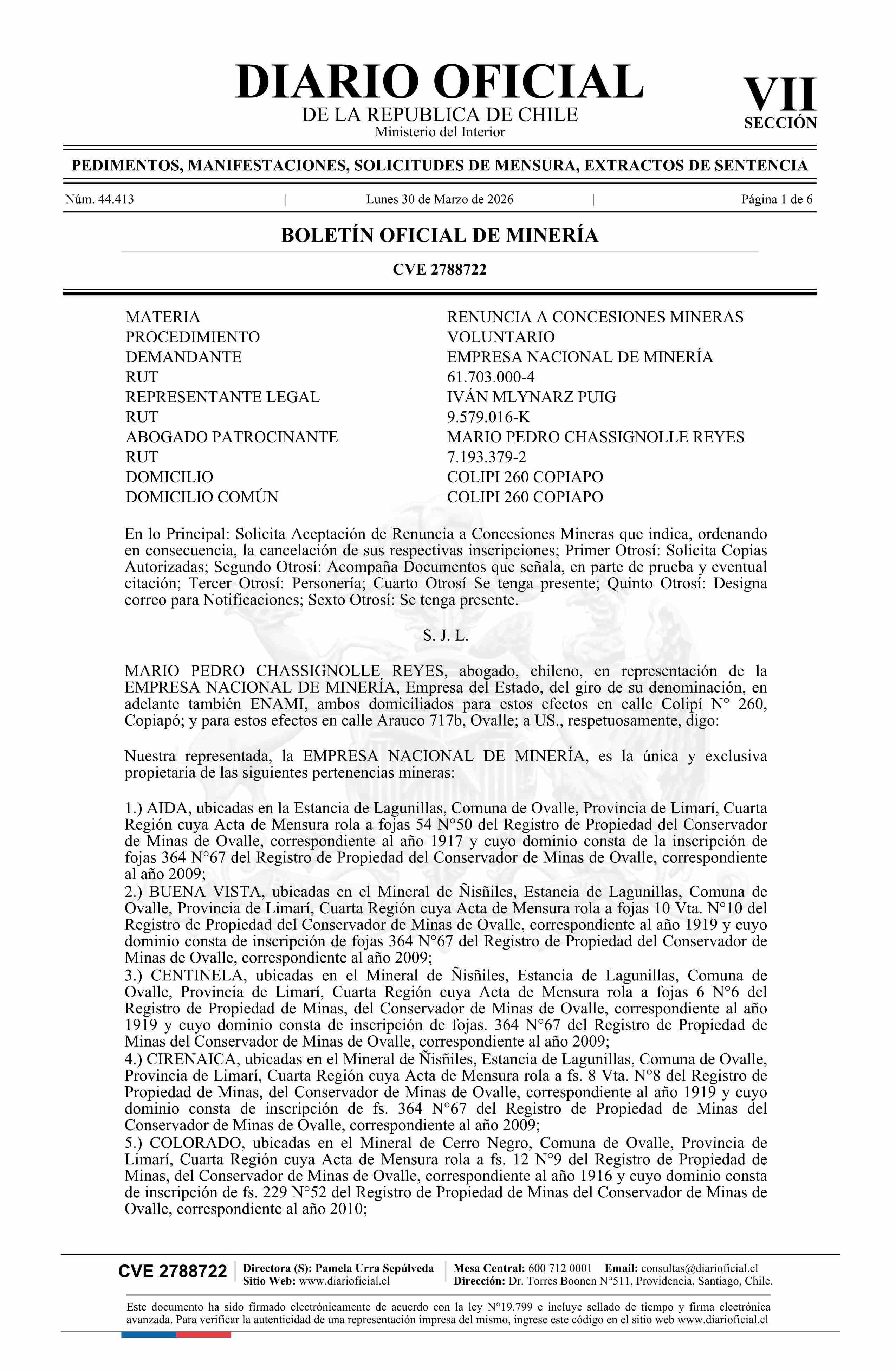 AIDA y otras / Empresa Nacional de Minería 30-03-2026 DIARIO OFICIAL CHILE - BOLETÍN OFICIAL DE MINERÍA |
