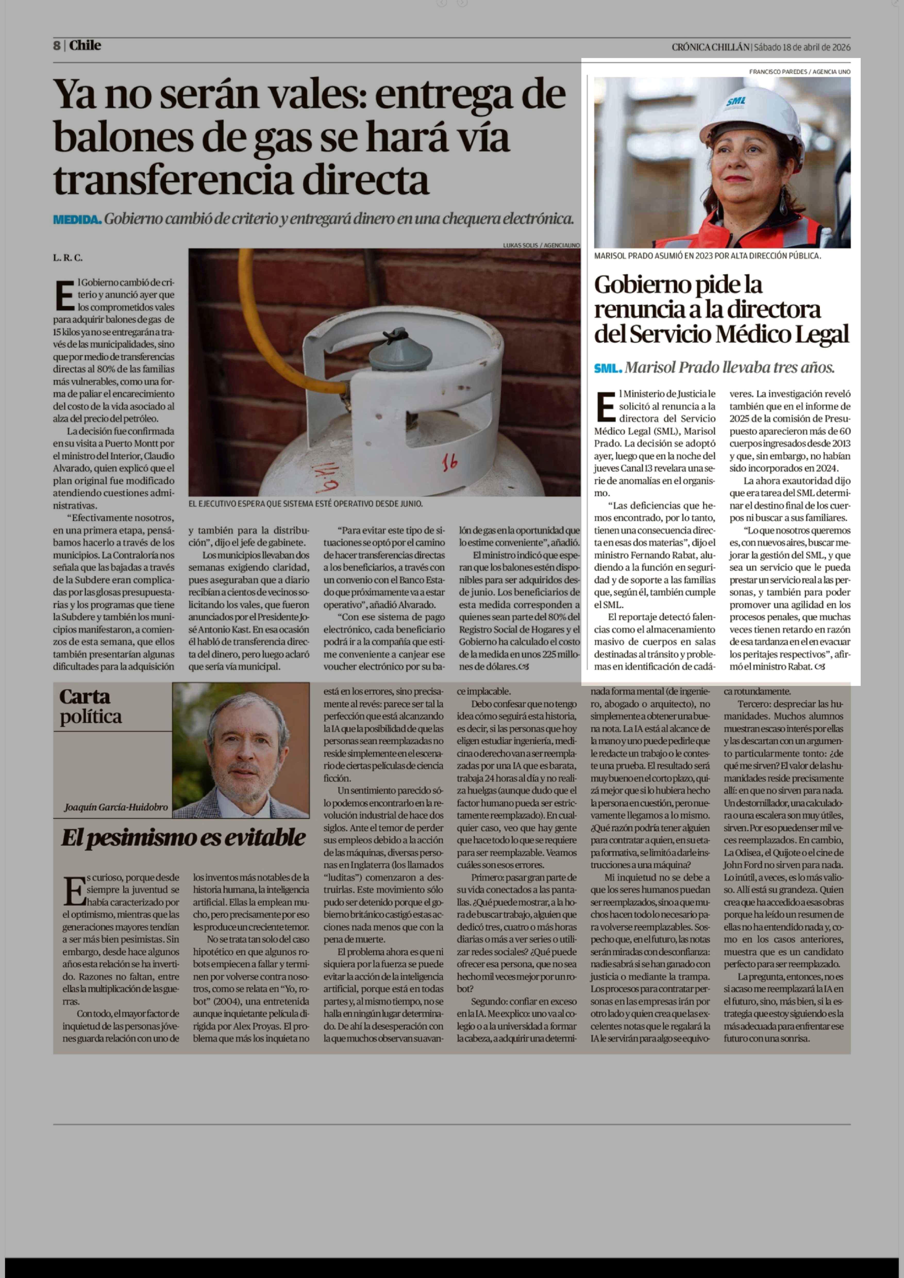 Gobierno pide la renuncia a la directora del Servicio Médico Legal 19-04-2026 Crónica de Chillán |