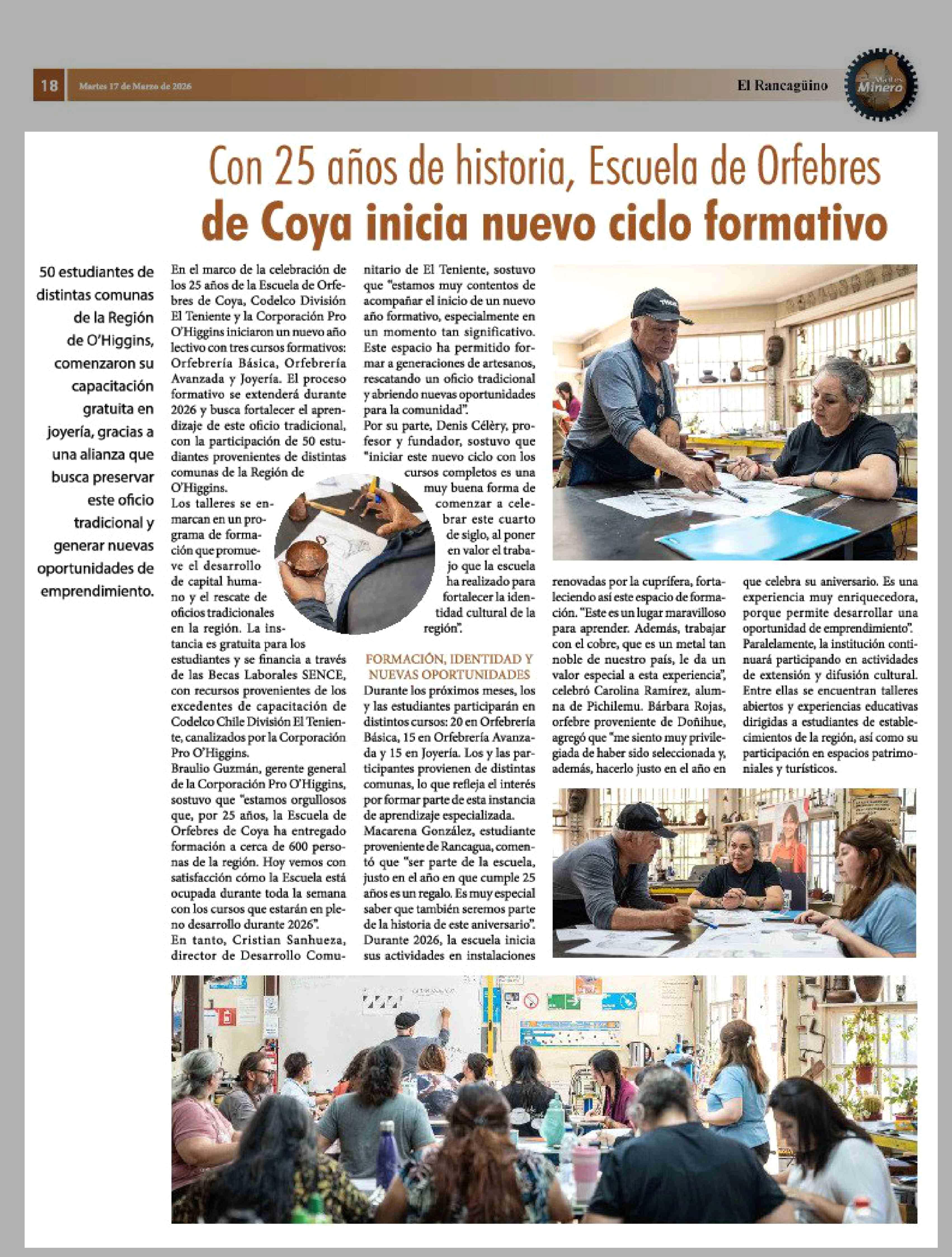 Con 25 años de historia, Escuela de Orfebres de Coya inicia nuevo ciclo formativo 17-03-2026 El Rancagüino |