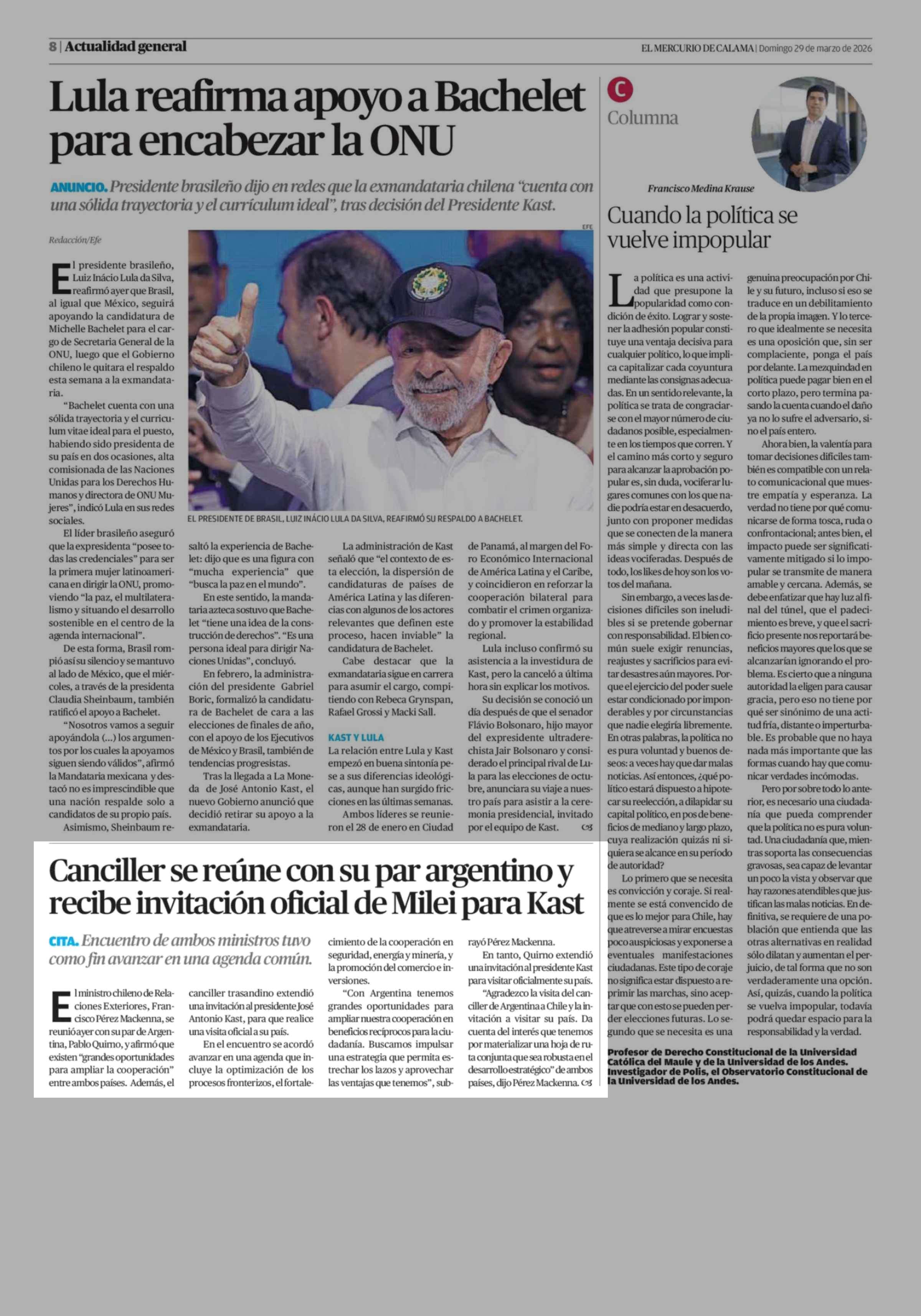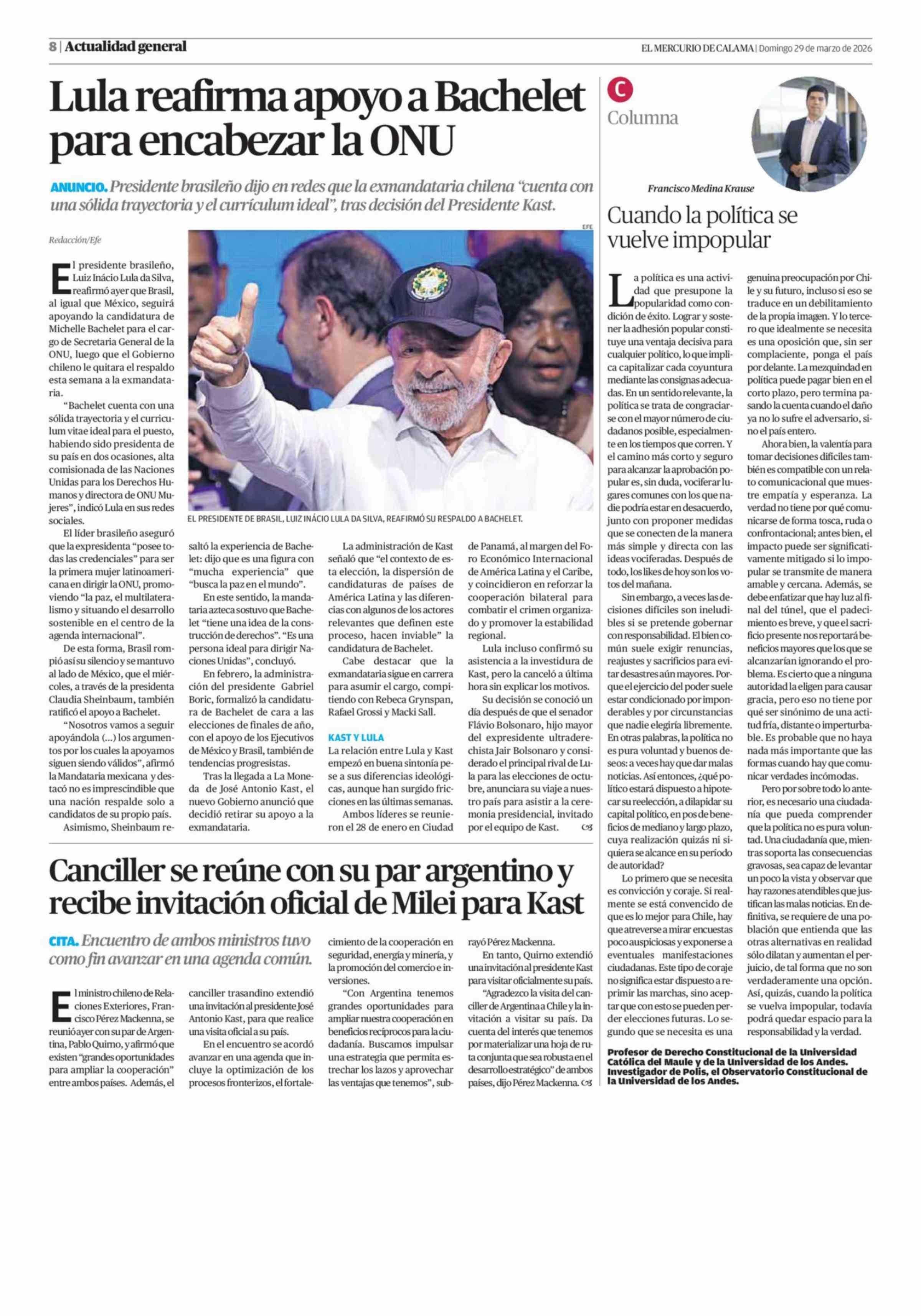 Canciller se reúne con su par argentino y recibe invitación oficial de Milei para Kast 29-03-2026 El Mercurio de Calama |