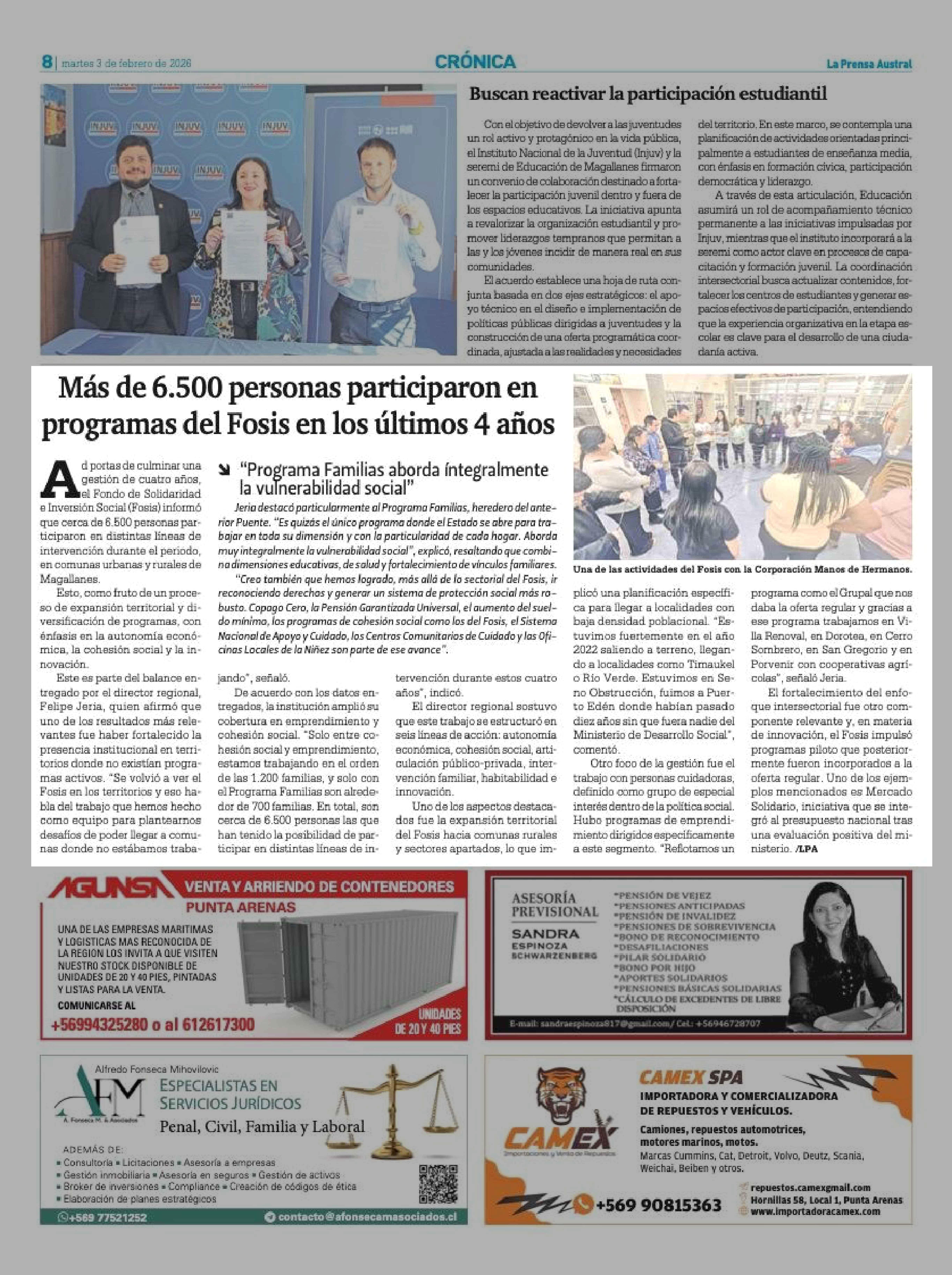 Más de 6.500 personas participaron en programas del Fosis en los últimos 4 años 03-02-2026 La Prensa Austral |