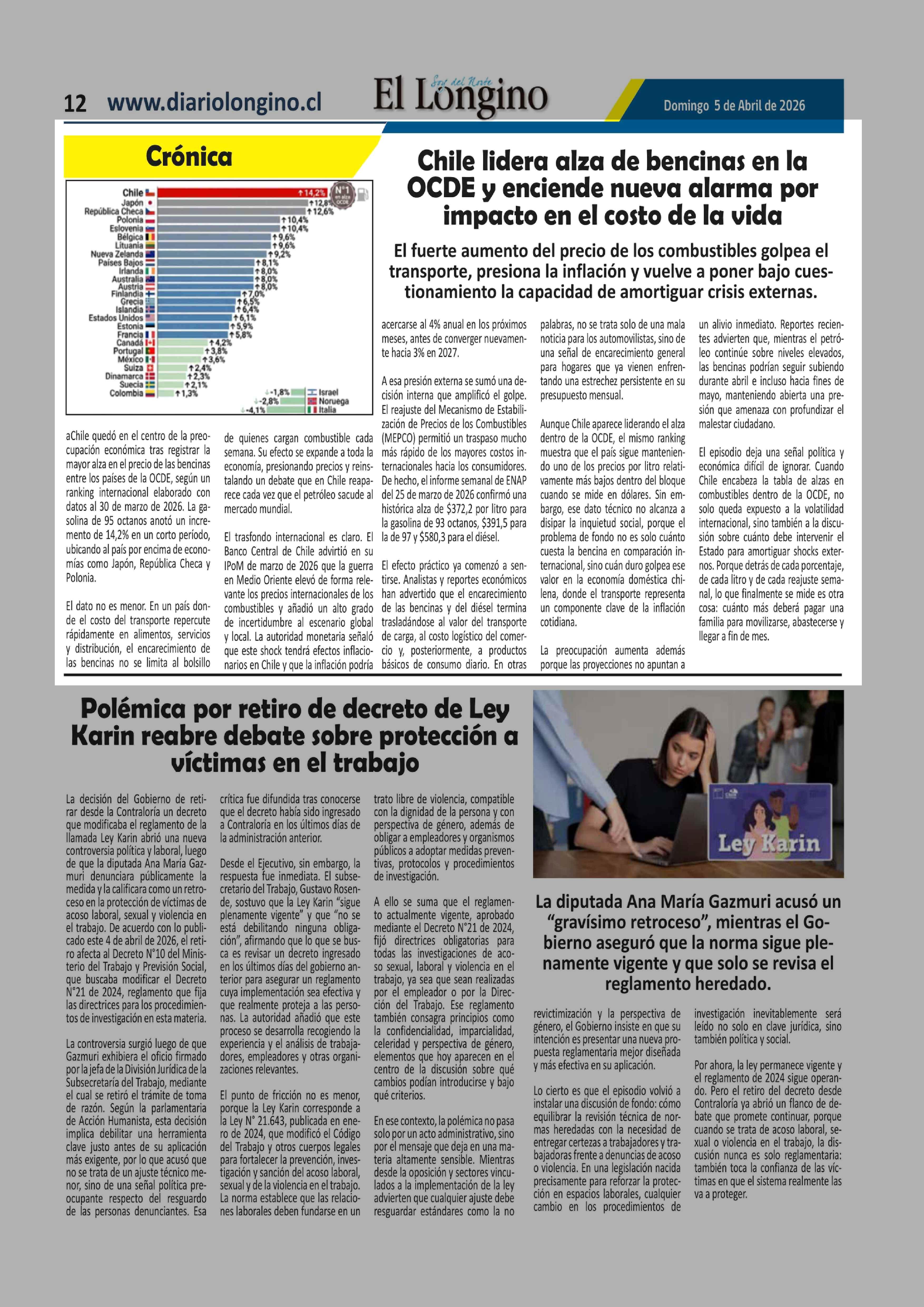 Título: Chile lidera alza de bencinas en la OCDE y enciende nueva alarma por impacto en el costo de la vida