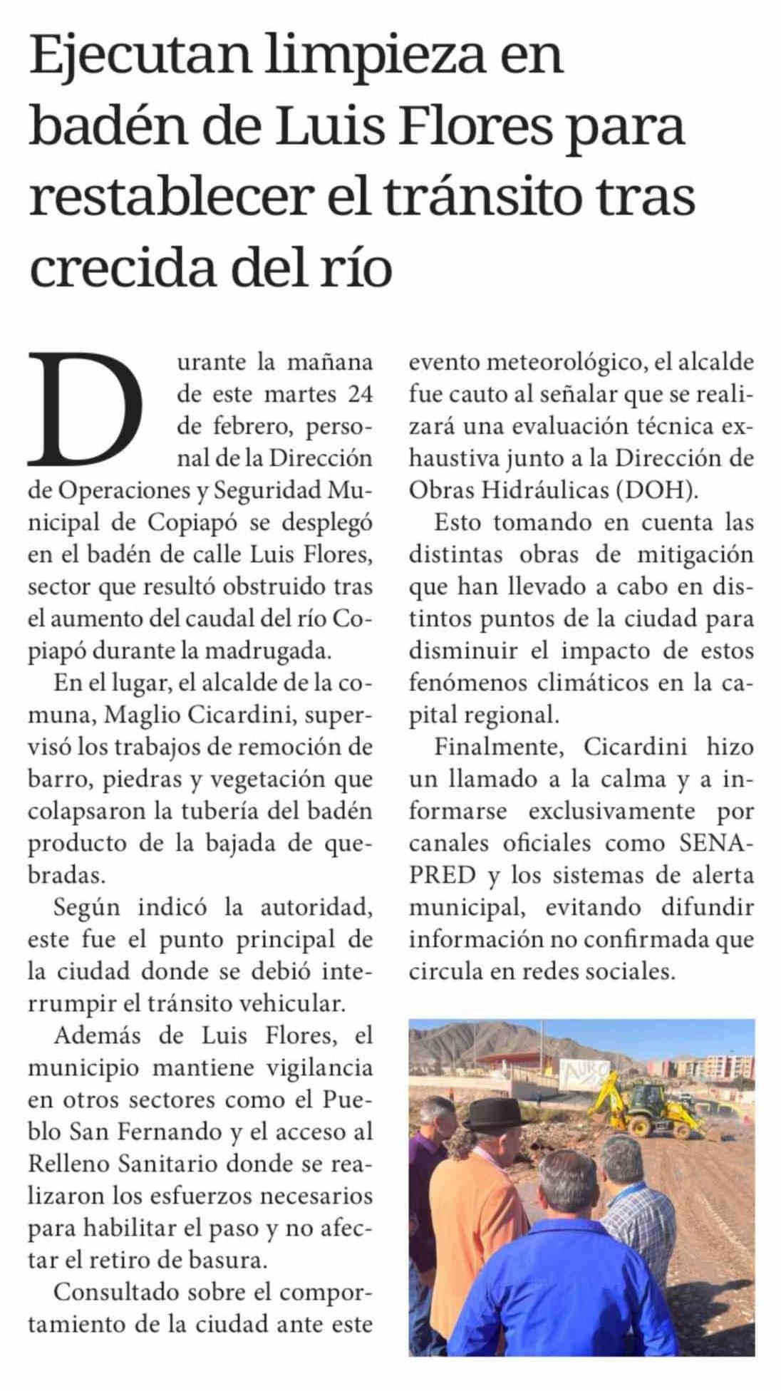 Ejecutan limpieza en badén de Luis Flores para restablecer el tránsito tras crecida del río 25-02-2026 Diario Chañarcillo |