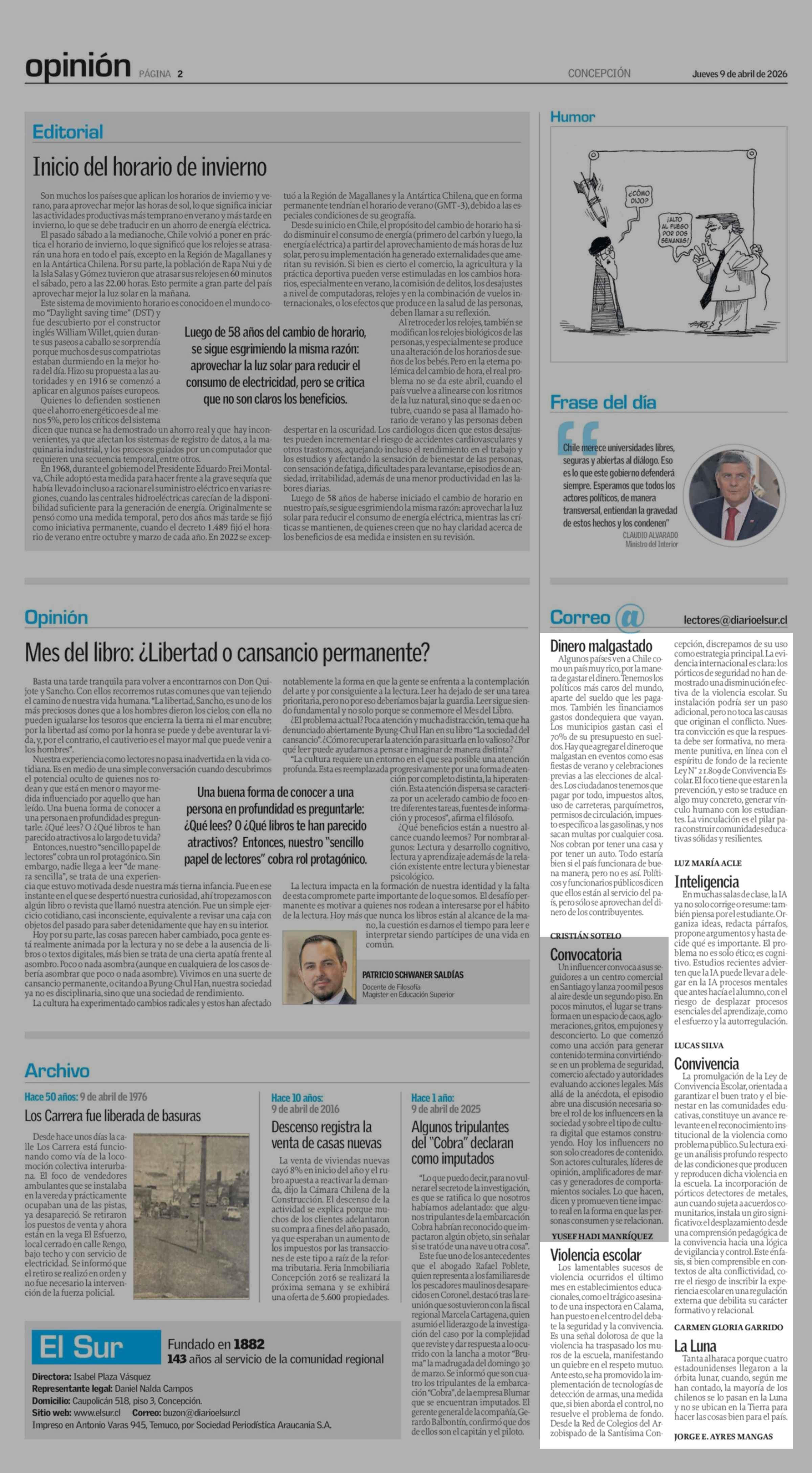 CARTAS: Violencia escolar 09-04-2026 El Sur |