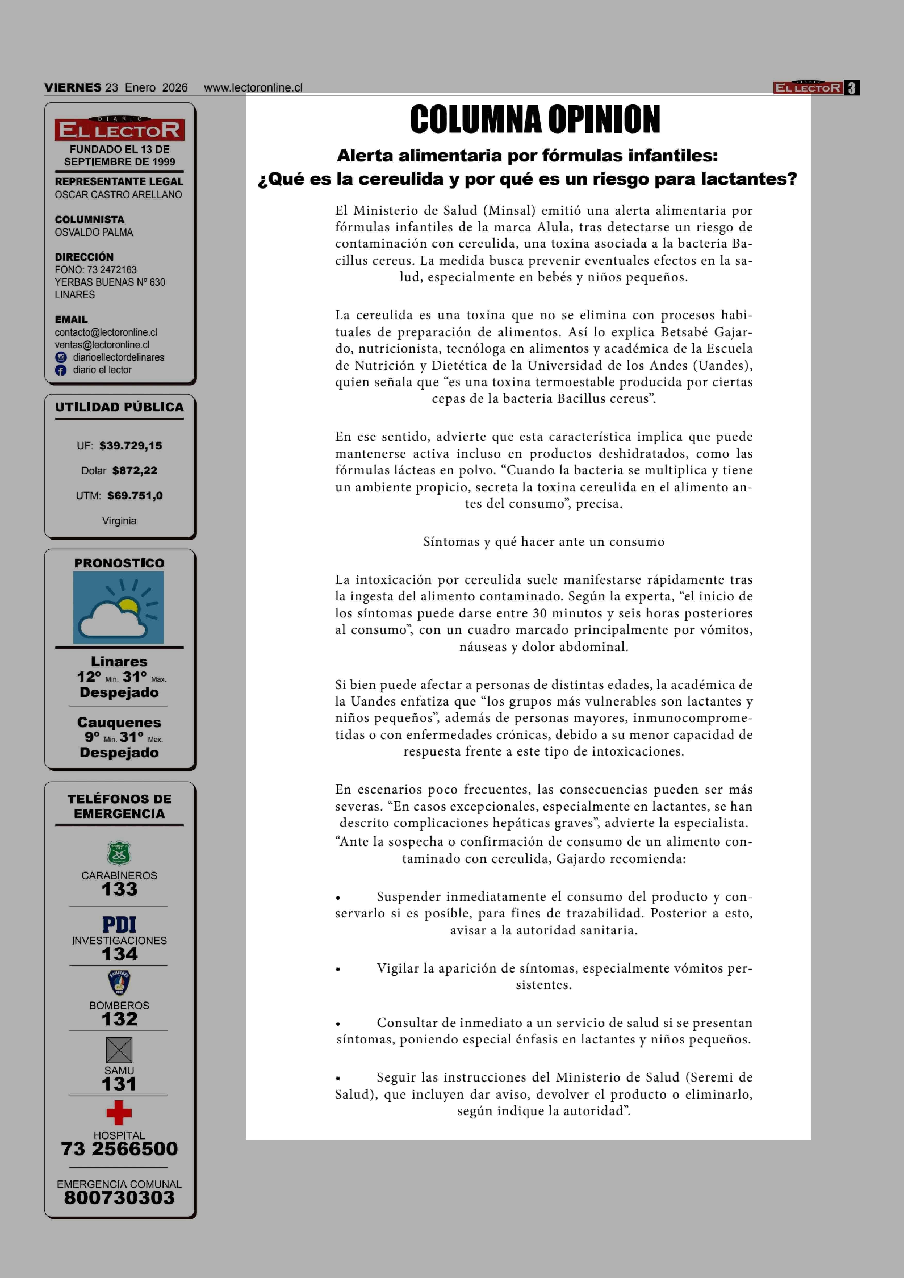 Alerta alimentaria por fórmulas infantiles: ¿Qué es la cereulida y por qué es un riesgo para lactantes? 23-01-2026 El Lector |