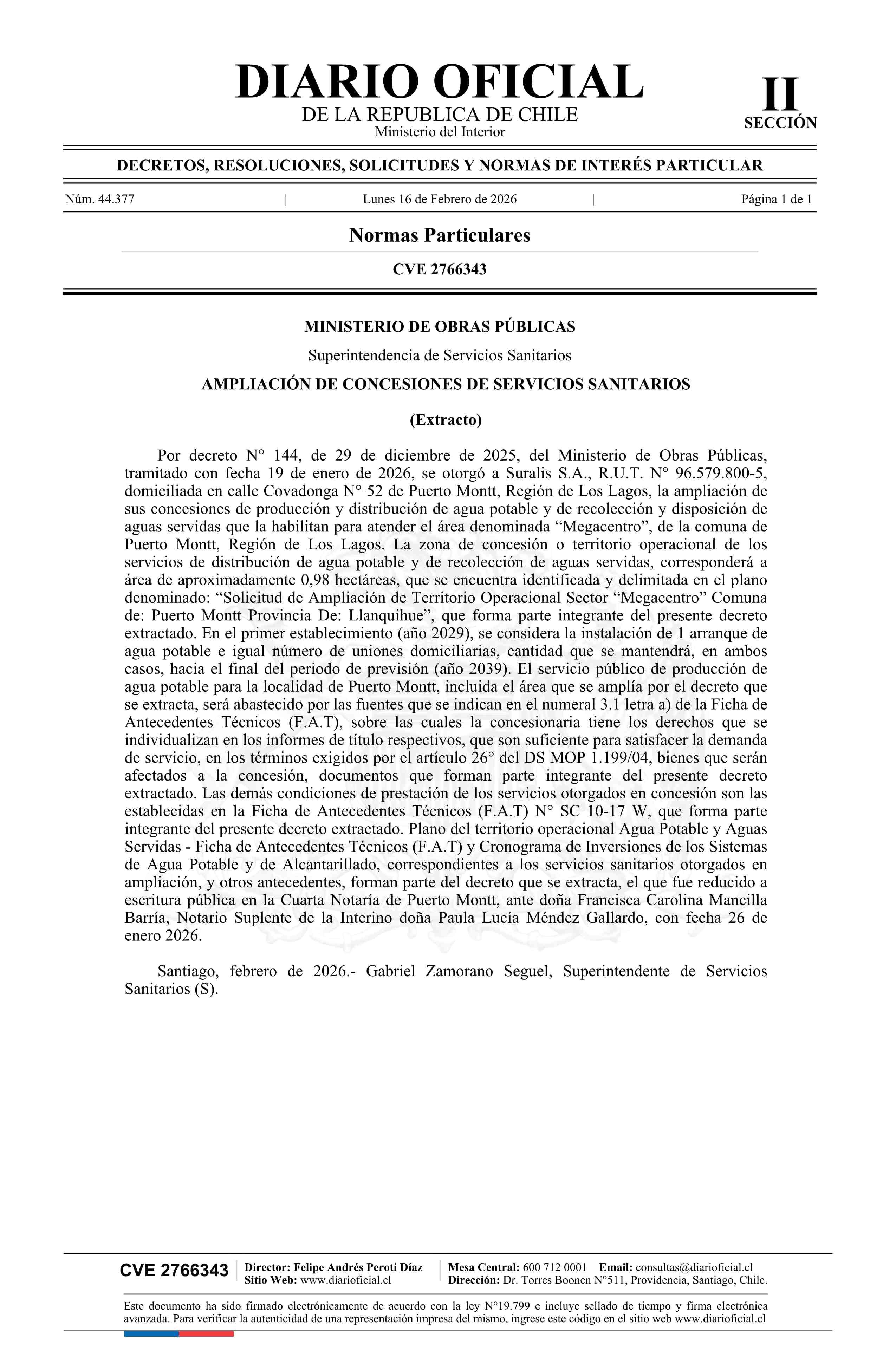 Solicitud de ampliación de concesión de servicios sanitarios de producción y distribución de agua potable y recolección y disposición de aguas servidas 16-02-2026 Diario Oficial Edición Electrónica |