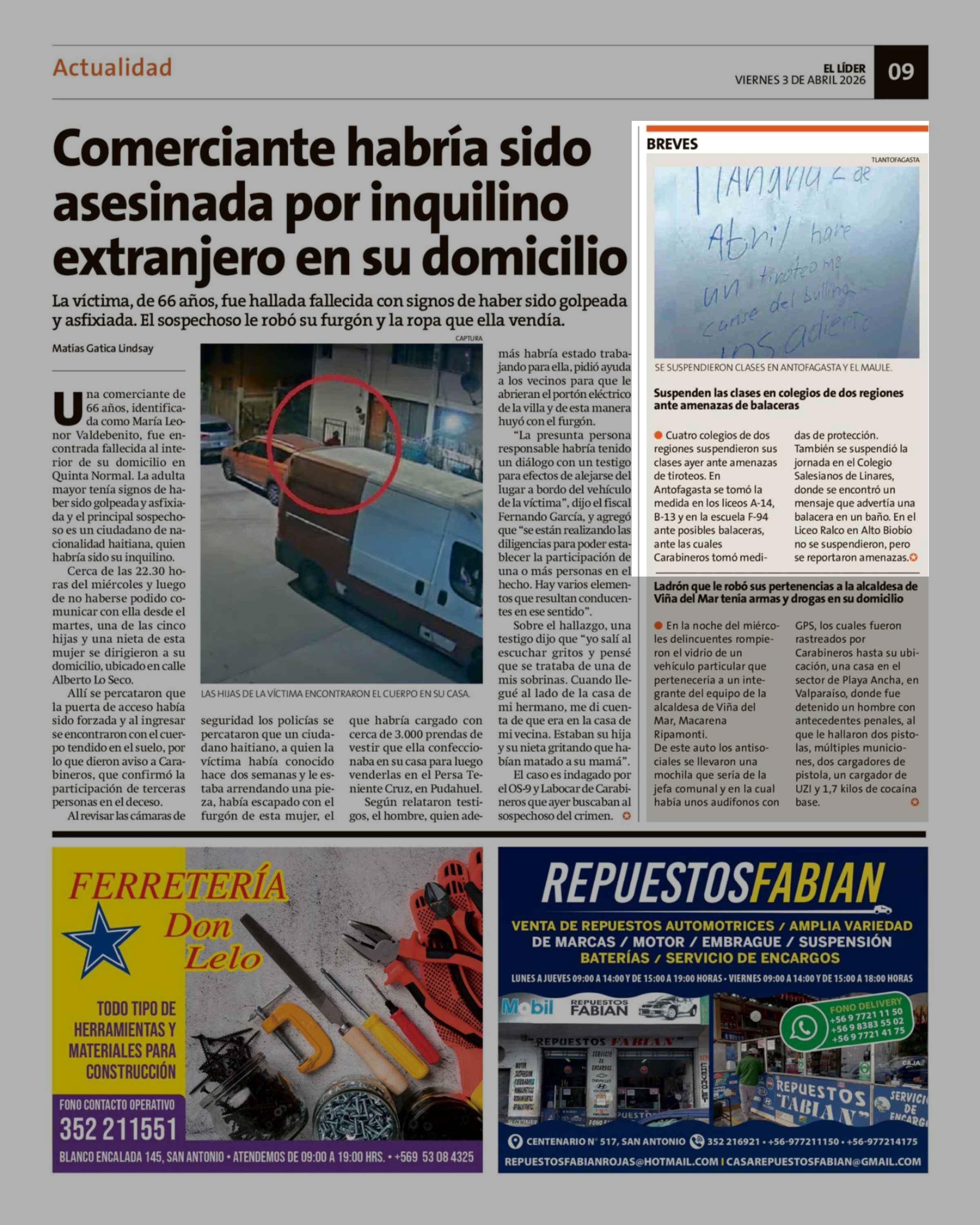 Suspenden las clases en colegios de dos regiones ante amenazas de balaceras 03-04-2026 El Líder |