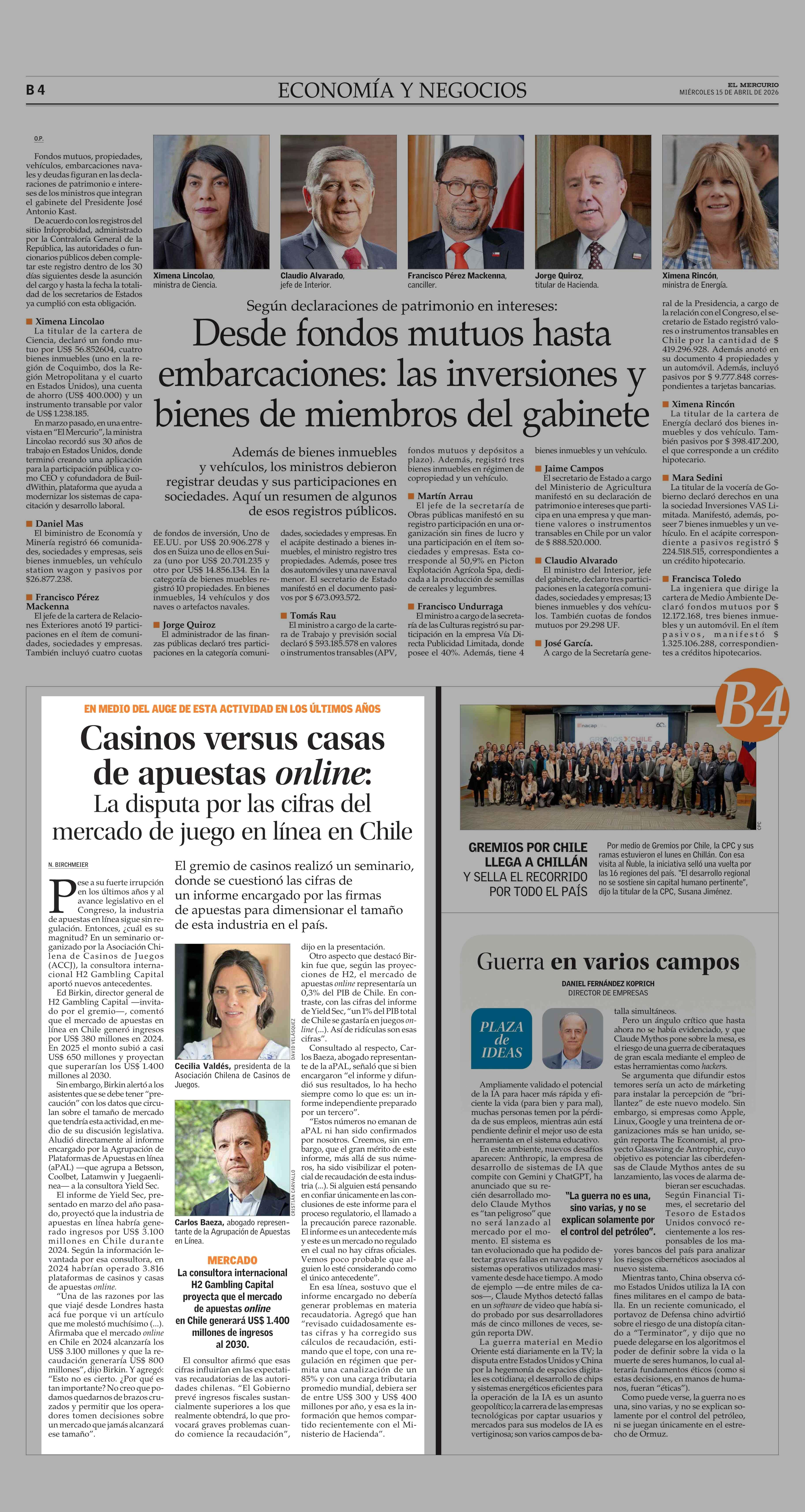 Casinos versus casas de apuestas online: La disputa por las cifras del mercado de juego en línea en Chile 15-04-2026 El Mercurio |