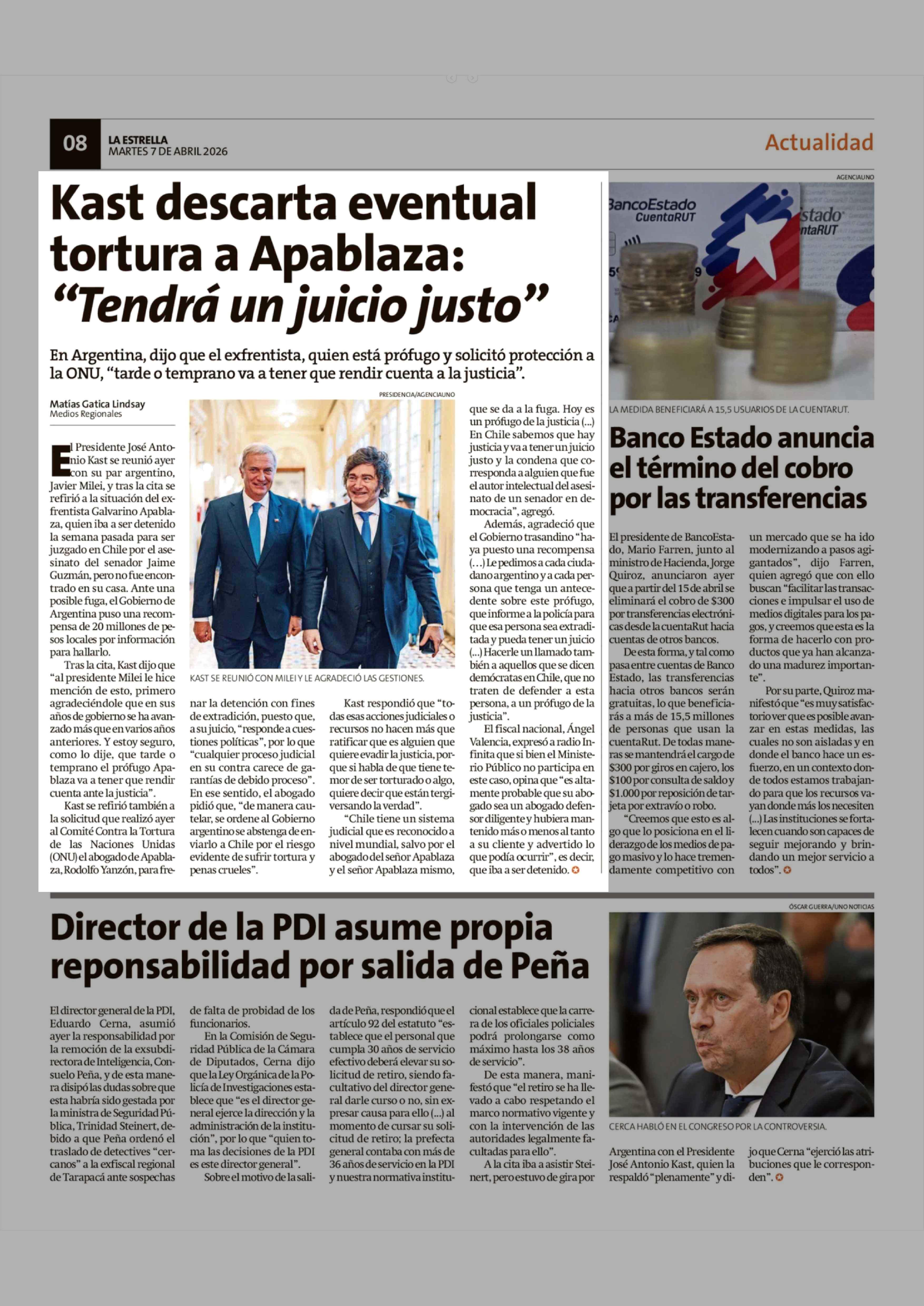 Kast descarta eventual tortura a Apablaza: "Tendrá un juicio justo" 07-04-2026 La Estrella de Chiloé |