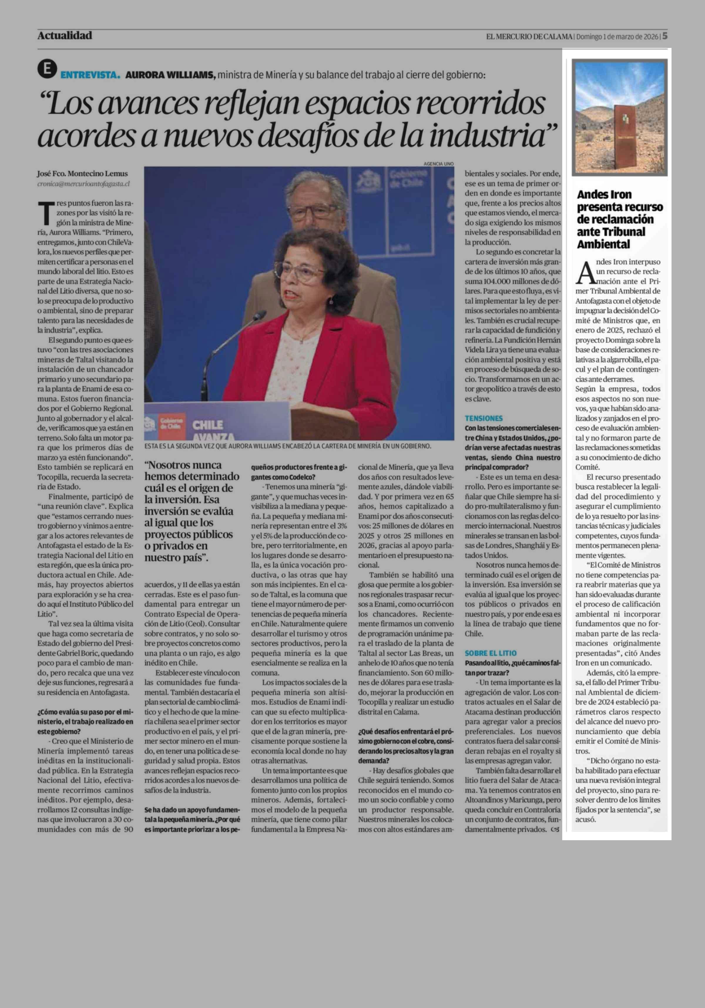 Andes Iron presenta recurso de reclamación ante Tribunal Ambiental 01-03-2026 El Mercurio de Calama |