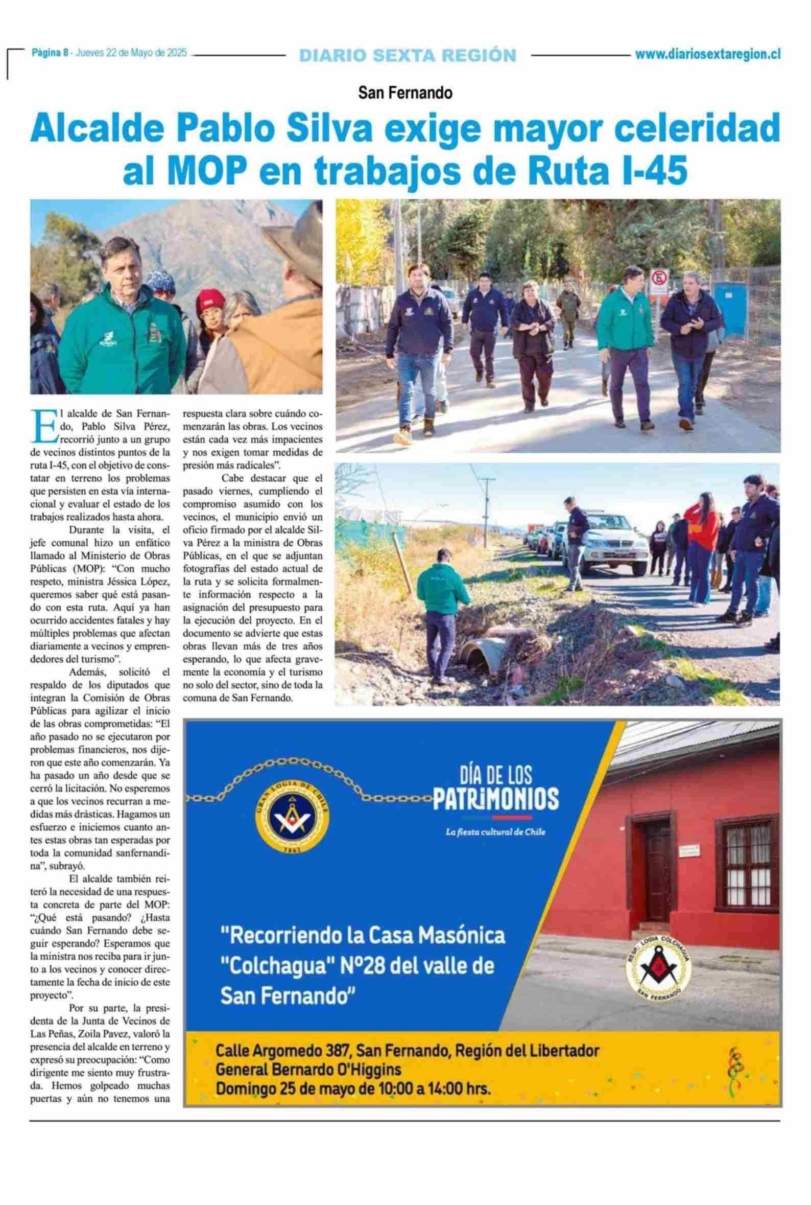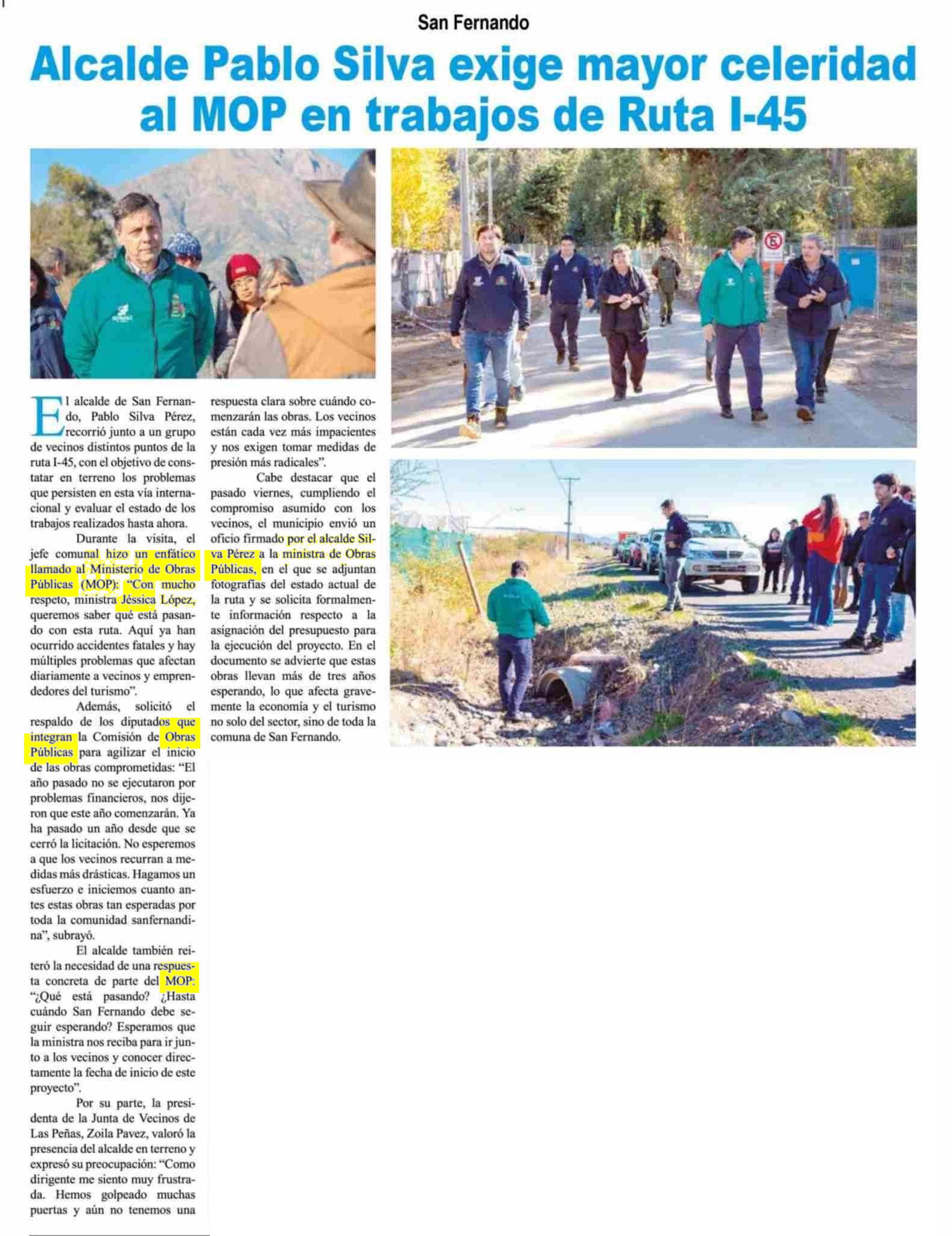 Alcalde Pablo Silva exige mayor celeridad al MOP en trabaios de Ruta 1-45 22-05-2025 Diario VI Región |