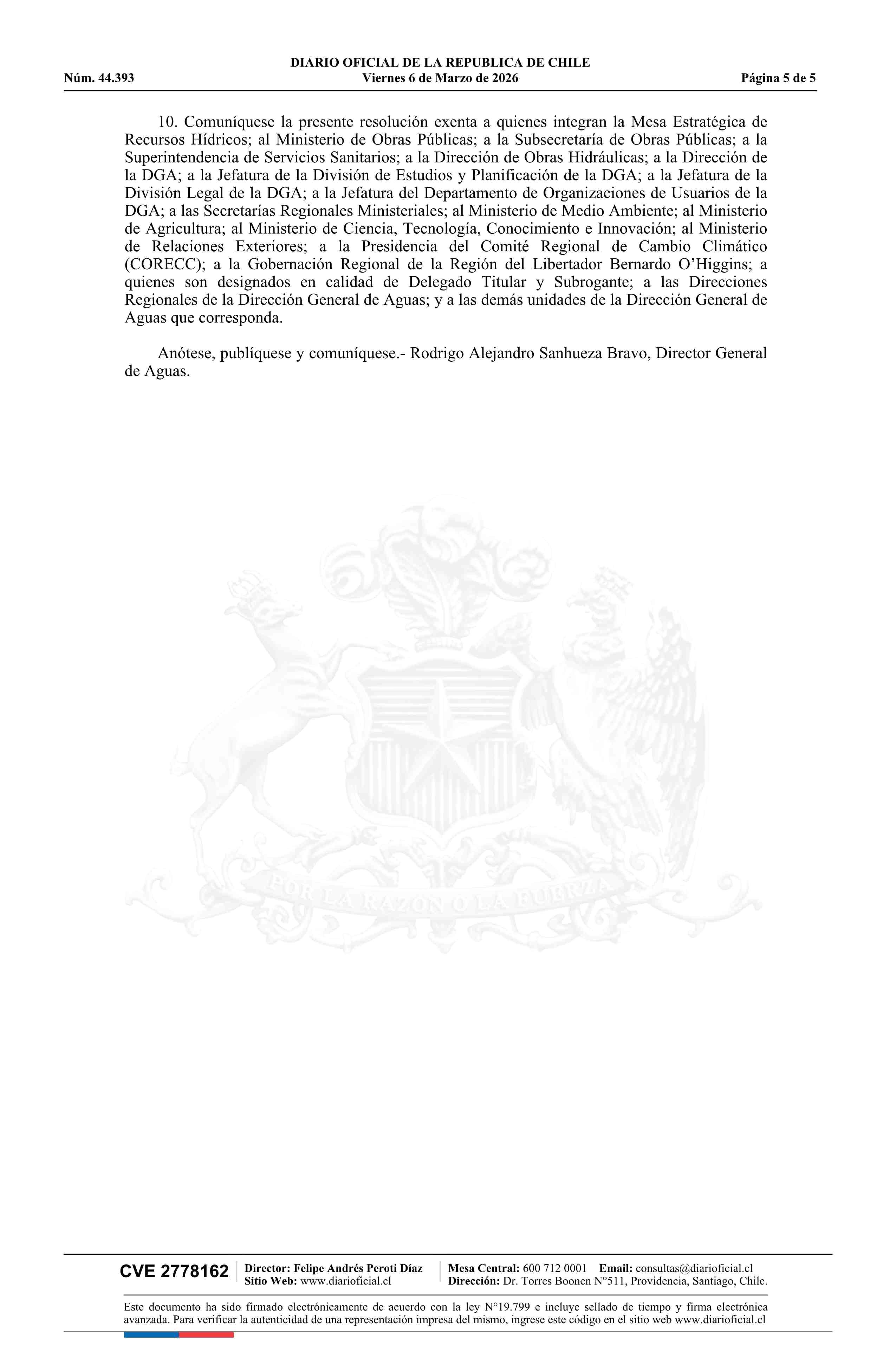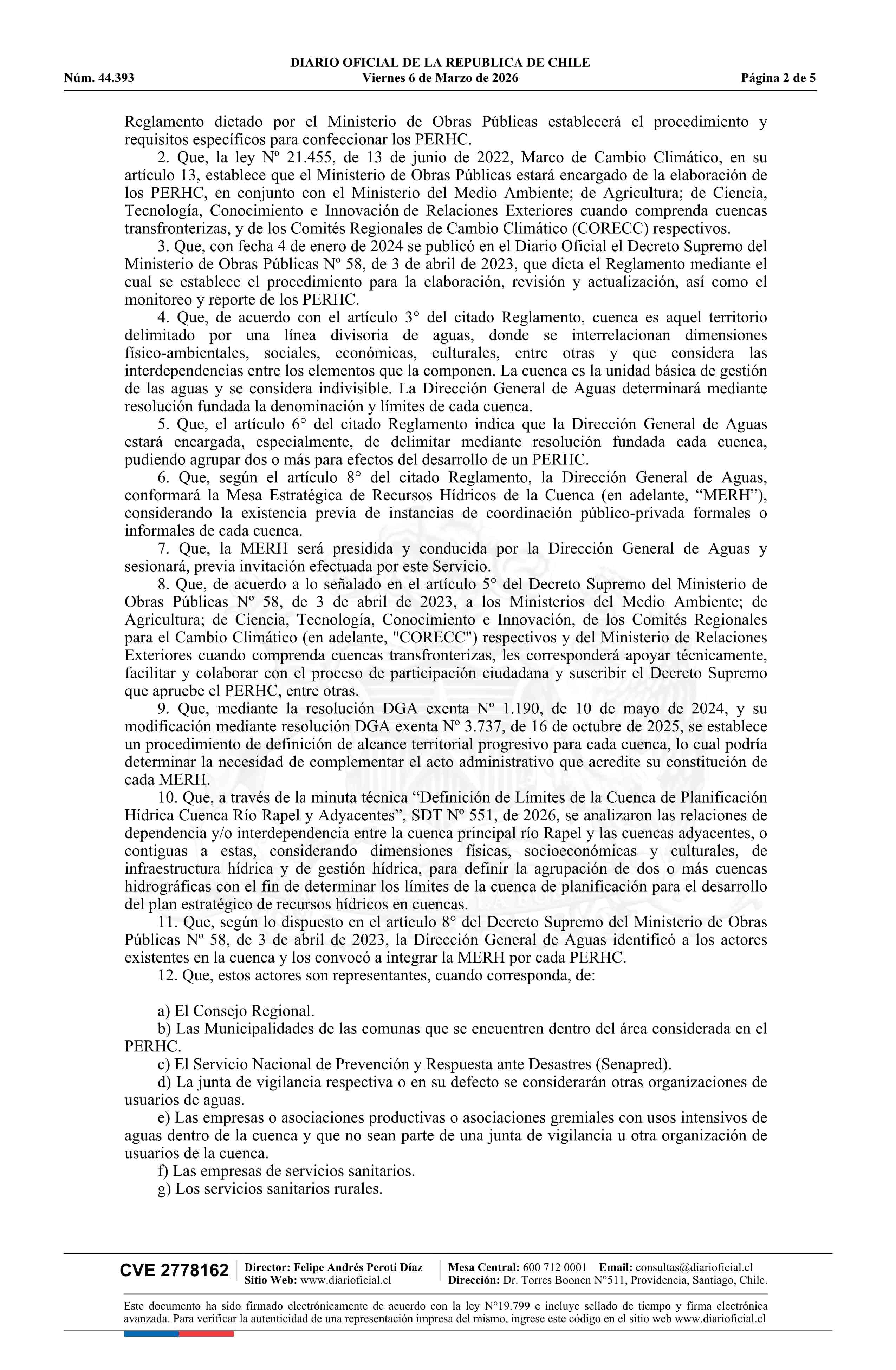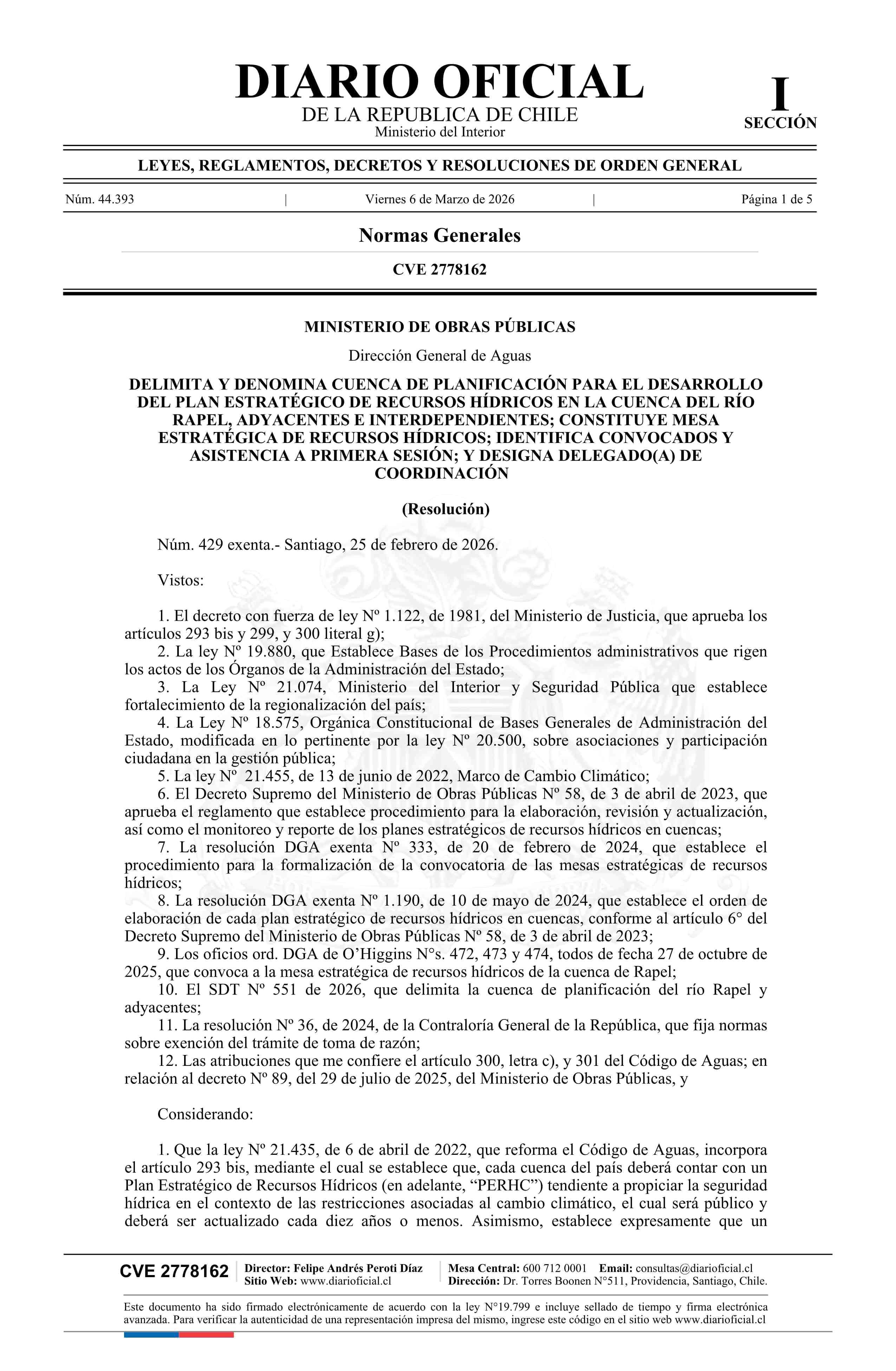 Título: Resolución exenta número 429, de 2026.- Delimita y denomina cuenca de planificación para el desarrollo del Plan Estratégico de Recursos Hídricos en la Cuenca del Río Rapel, Adyacentes e Interdependientes; constituye mesa estratégica de recursos hídricos; identifica convocados y asistencia a primera