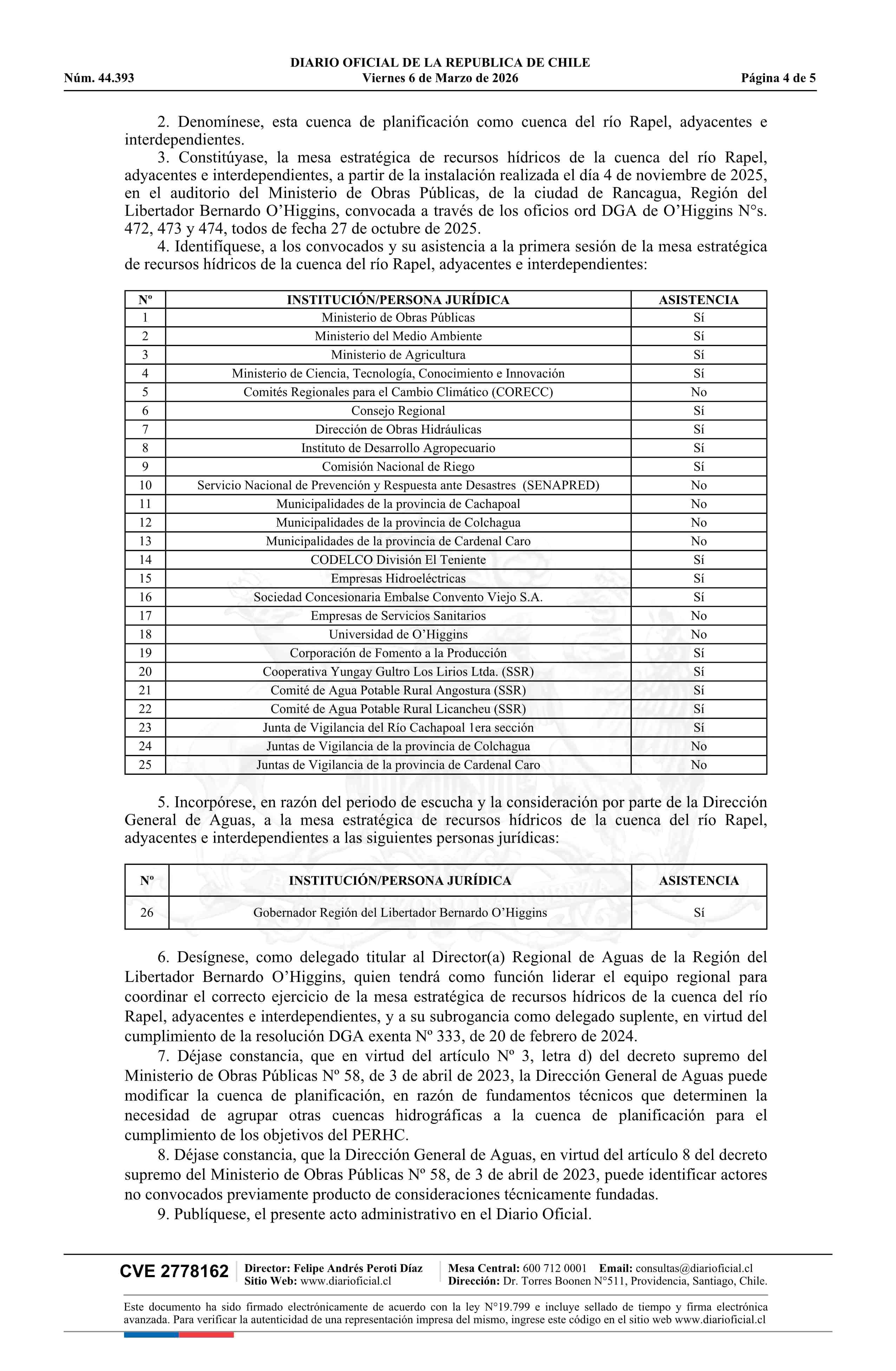 Resolución exenta número 429, de 2026.- Delimita y denomina cuenca de planificación para el desarrollo del Plan Estratégico de Recursos Hídricos en la Cuenca del Río Rapel, Adyacentes e Interdependientes; constituye mesa estratégica de recursos hídricos; identifica convocados y asistencia a primera