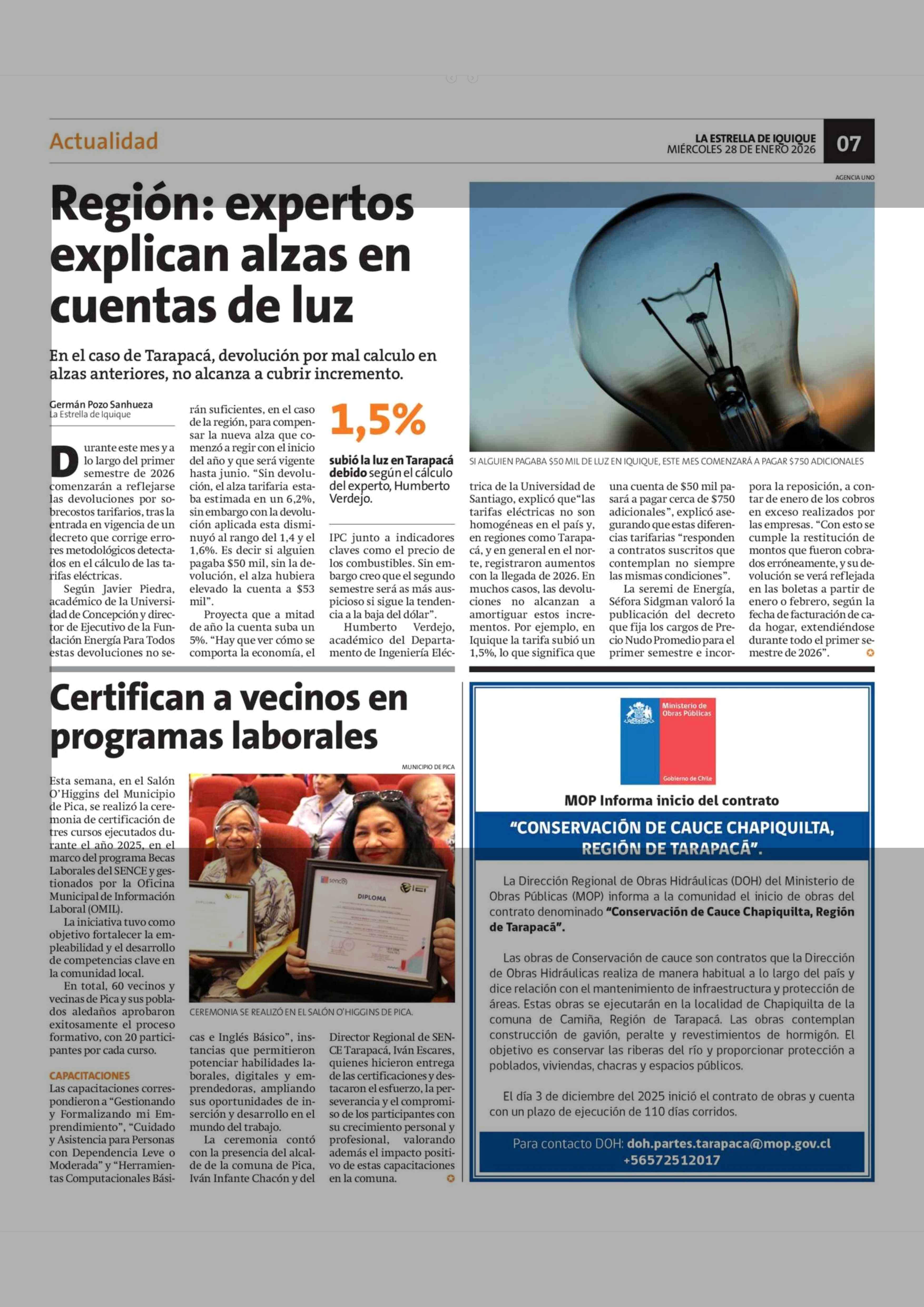 Región: expertos explican alzas en cuentas de luz 28-01-2026 La Estrella de Iquique |
