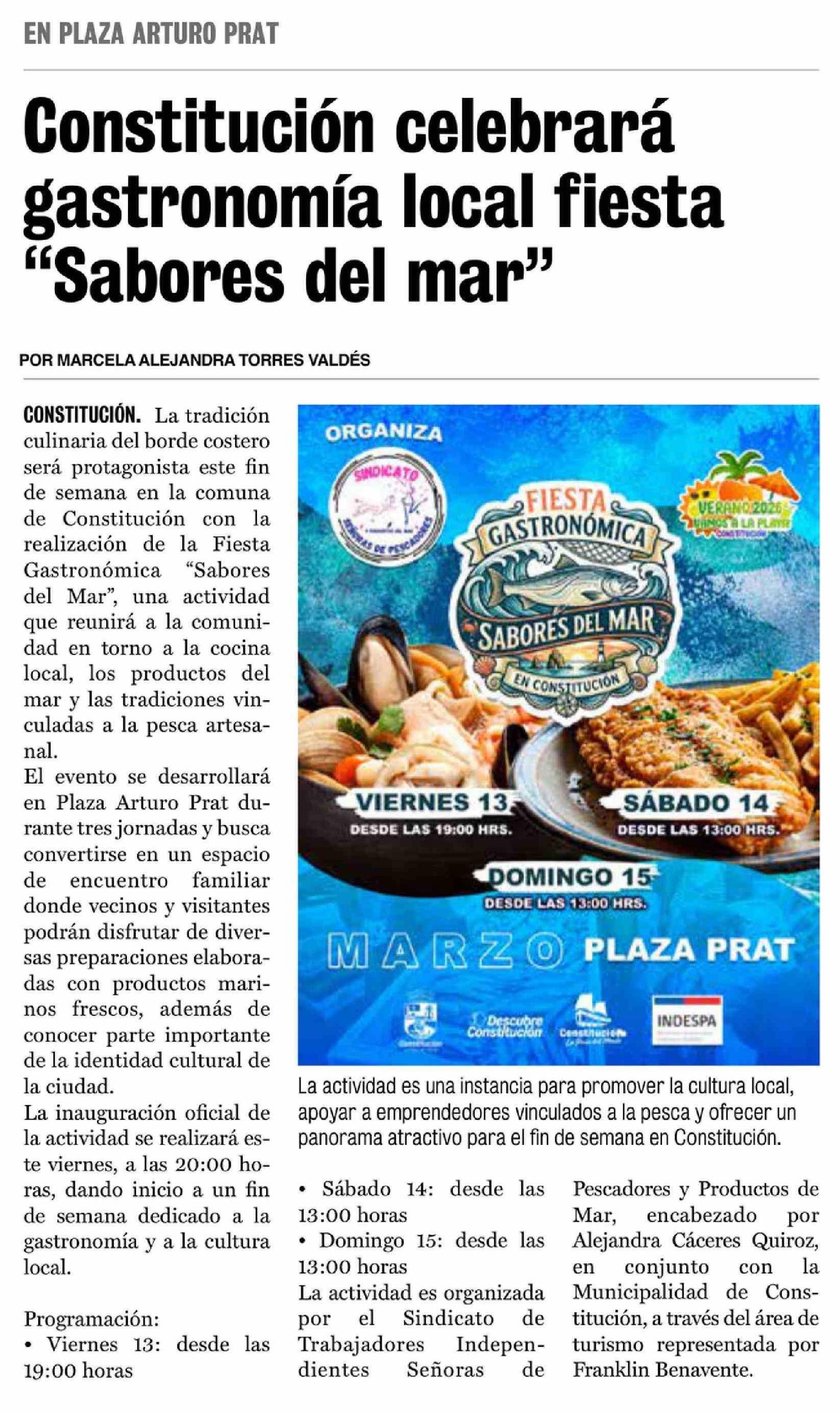 Constitución celebrará gastronomía local fiesta "Sabores del mar" 12-03-2026 La Prensa de Curicó |