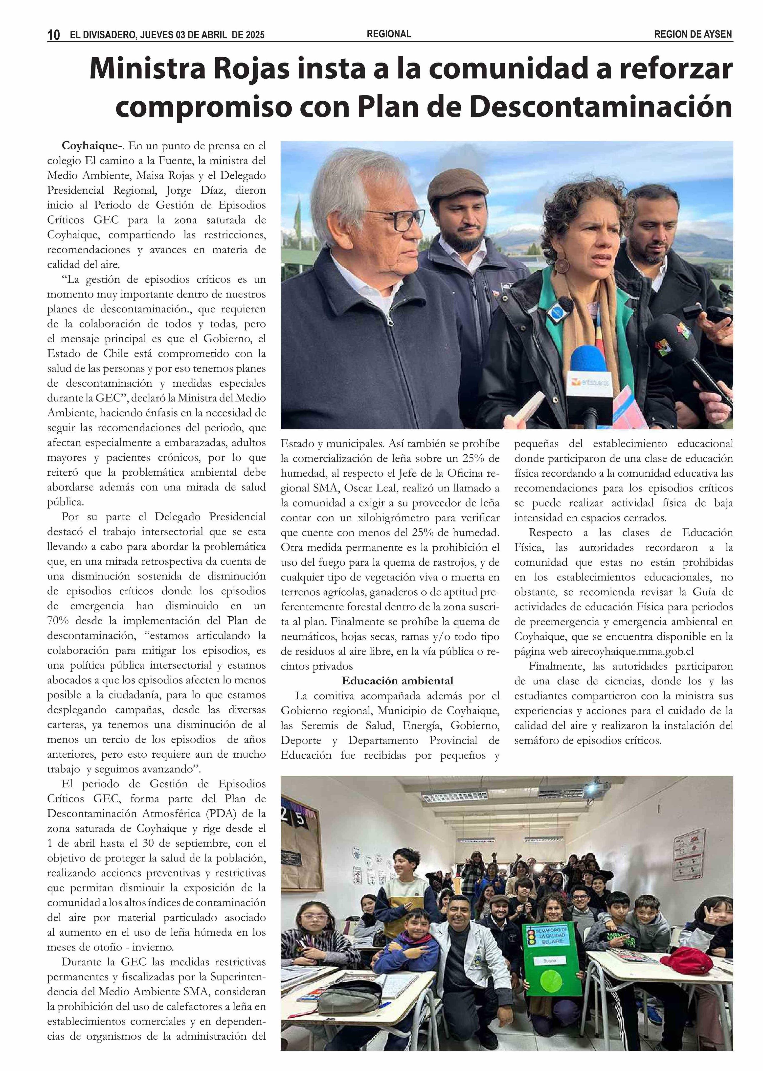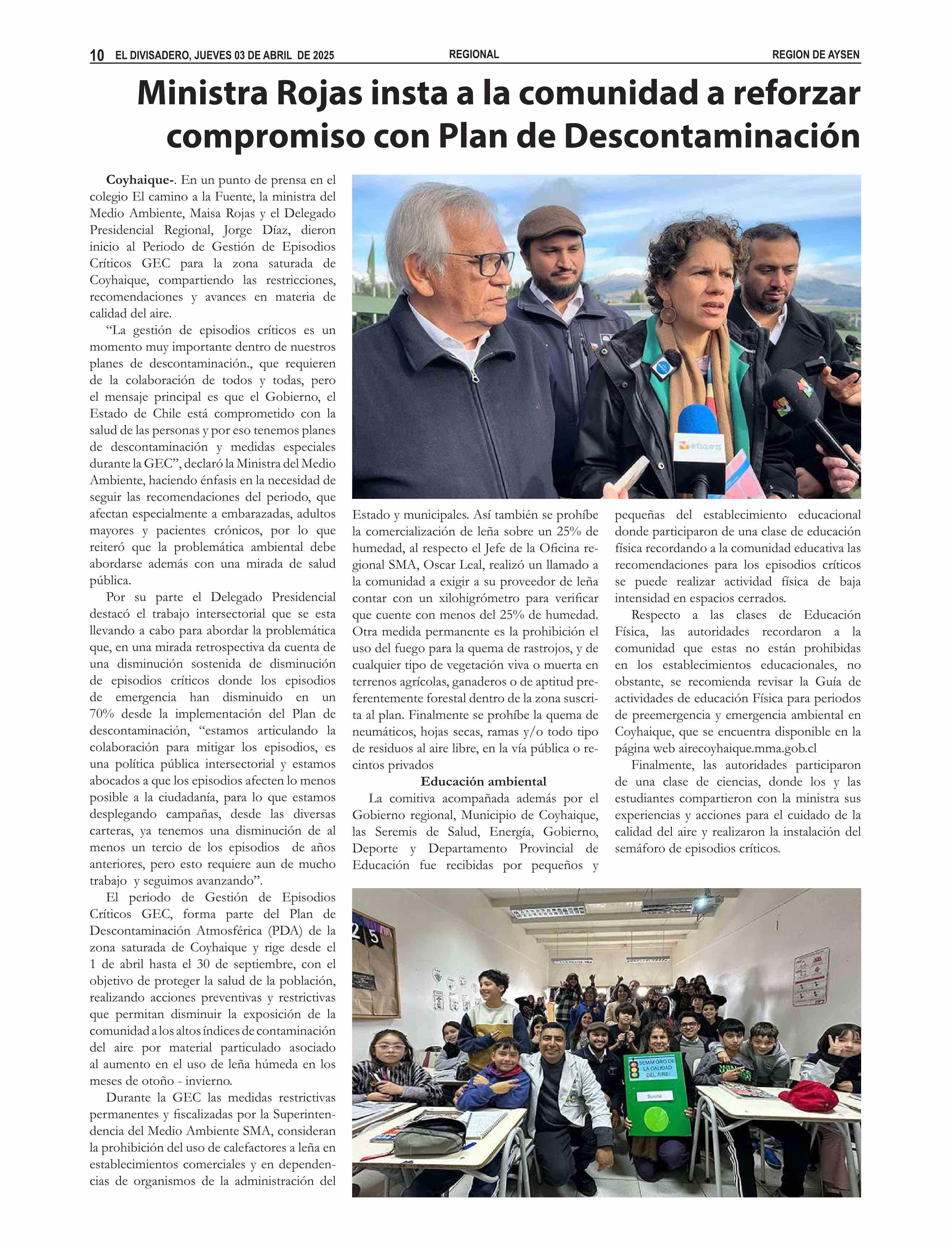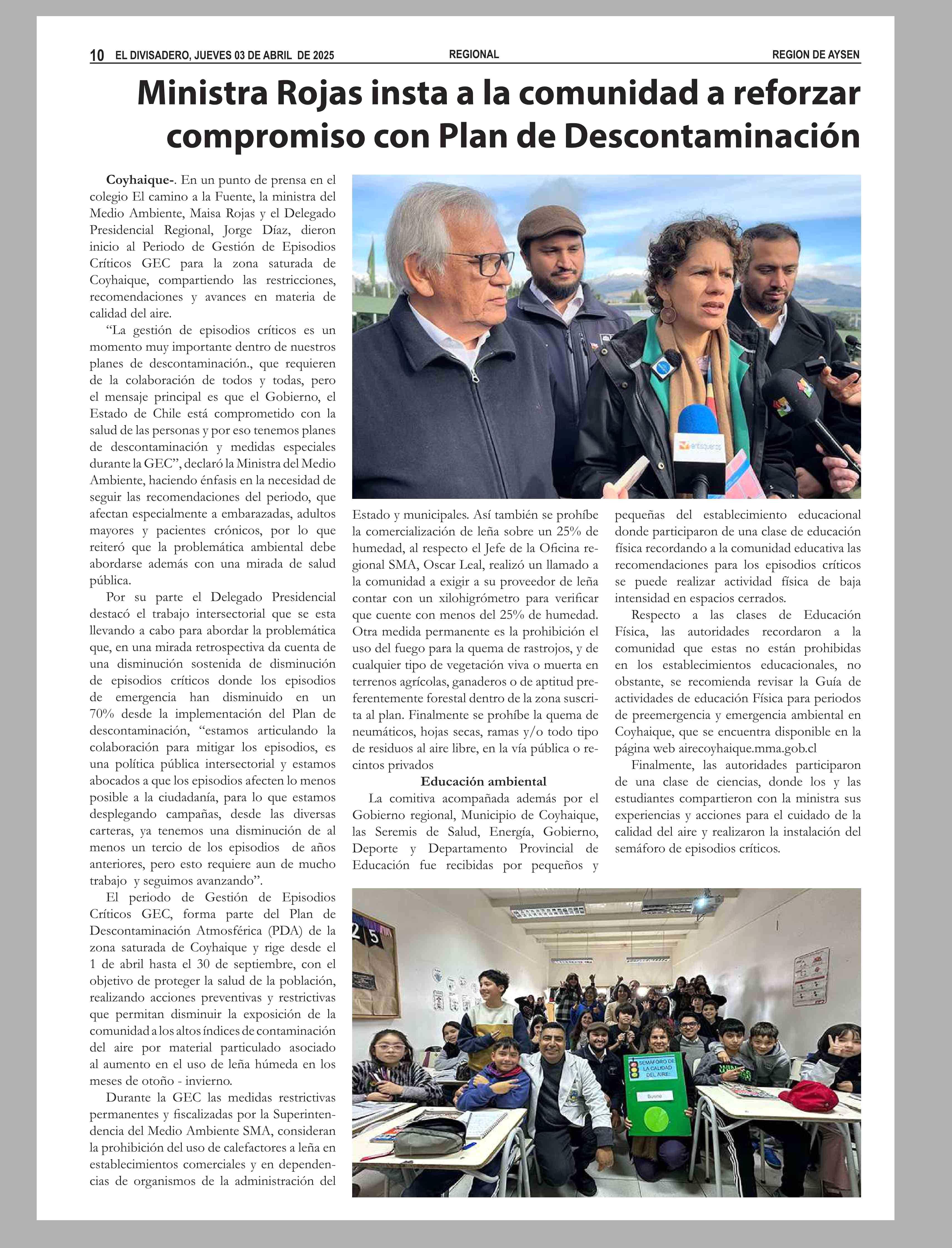 Ministra Rojas insta a la comunidad a reforzar compromiso con Plan de Descontaminación 03-04-2025 El Divisadero |