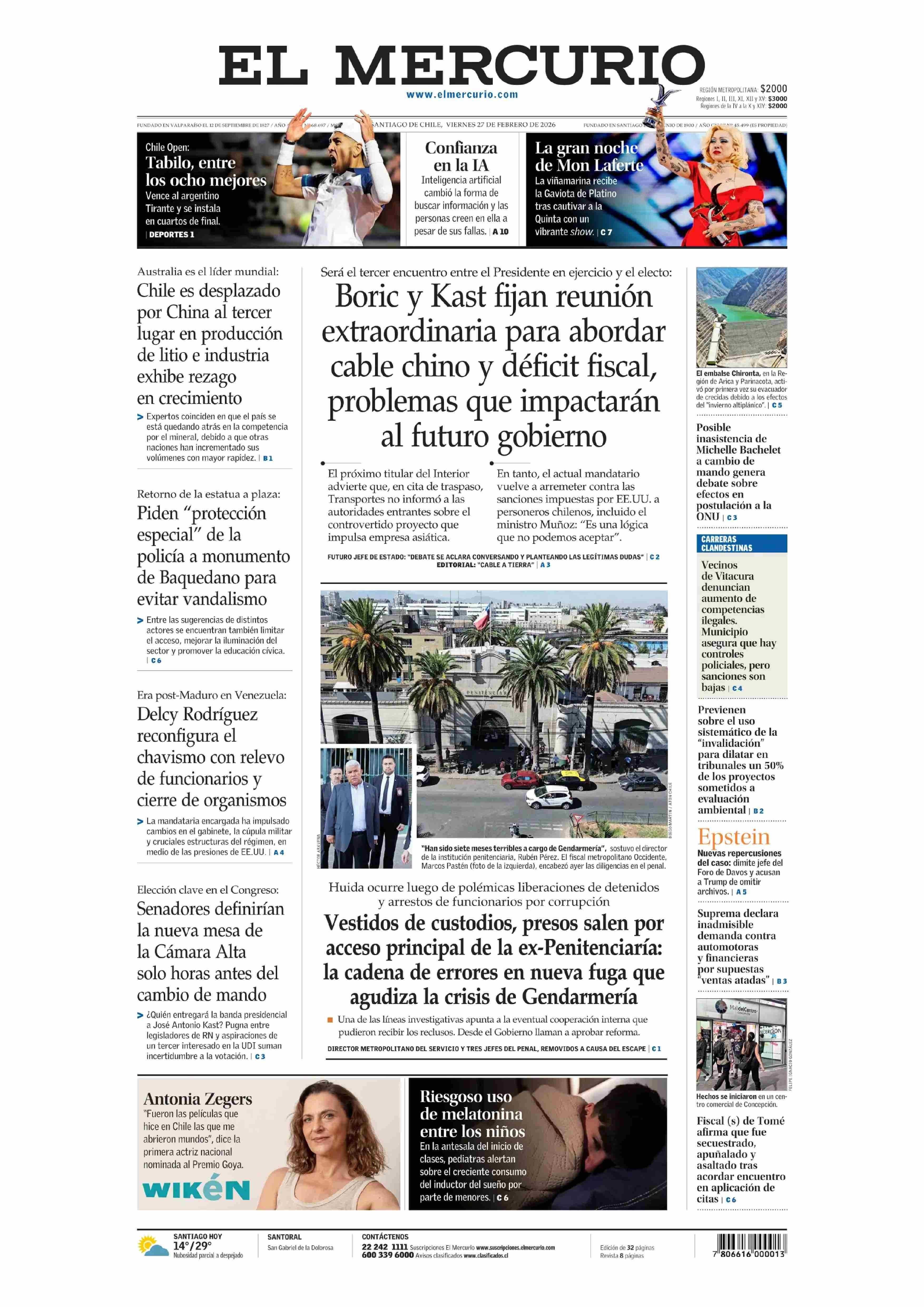 PORTADA EL MERCURIO (A SEGUNDA EDICIÓN) - CHILE 27-02-2026 El Mercurio |